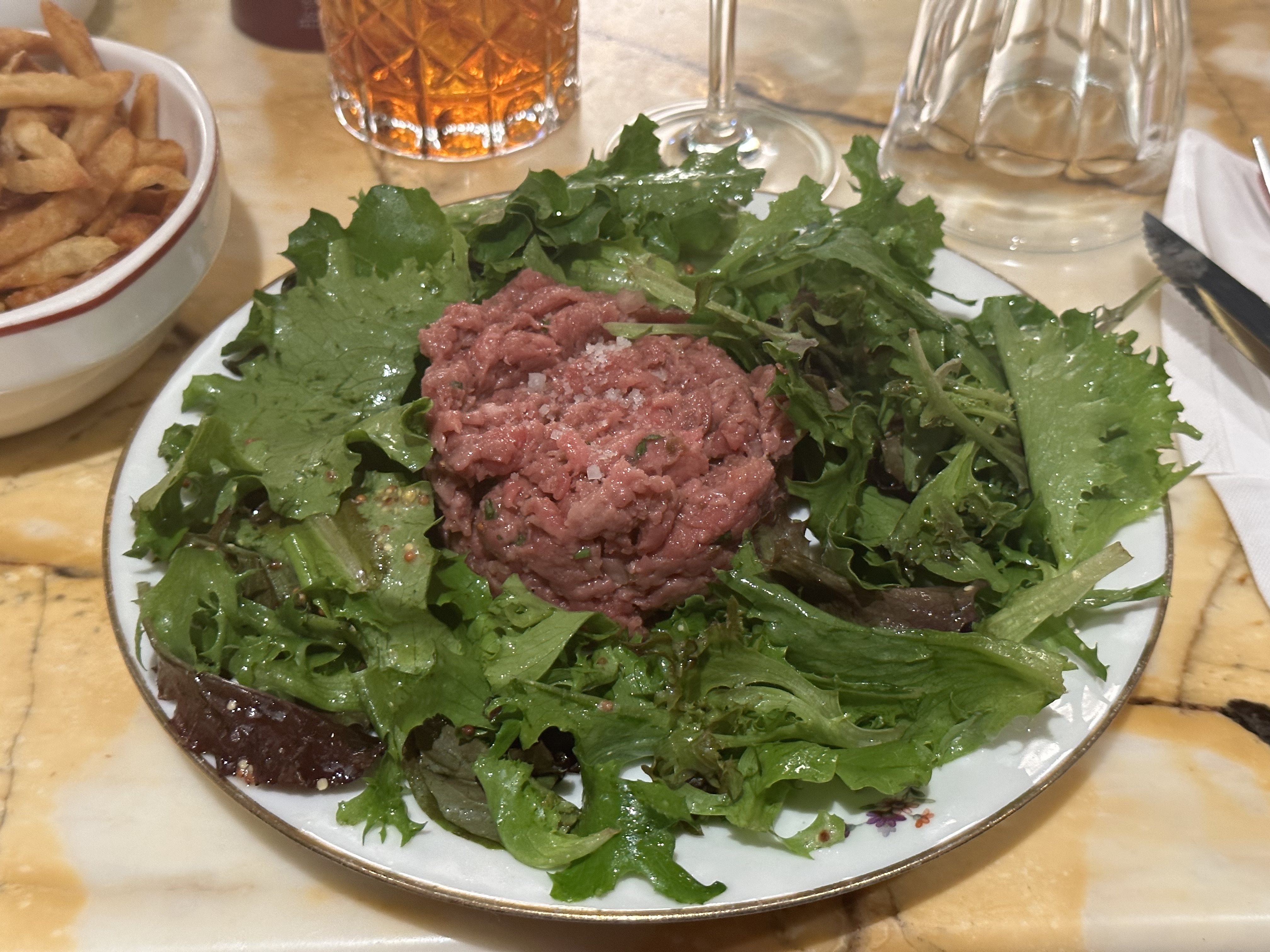 Pas emballé. Verre de vin qui avait un vieux goût de bouchon, on avait l'impression que ce vin sortait d'un tonneau dans lequel il était depuis 10 ans. Tartare pas mauvais mais pas de câpres pas d'oeuf..béarnaise avec supplément toute sèche sur le dessus. Boule citron pas terrible mais financier excellent Rapport qualité prix pas ouf en comparaison d'autres brasseries sur Paris