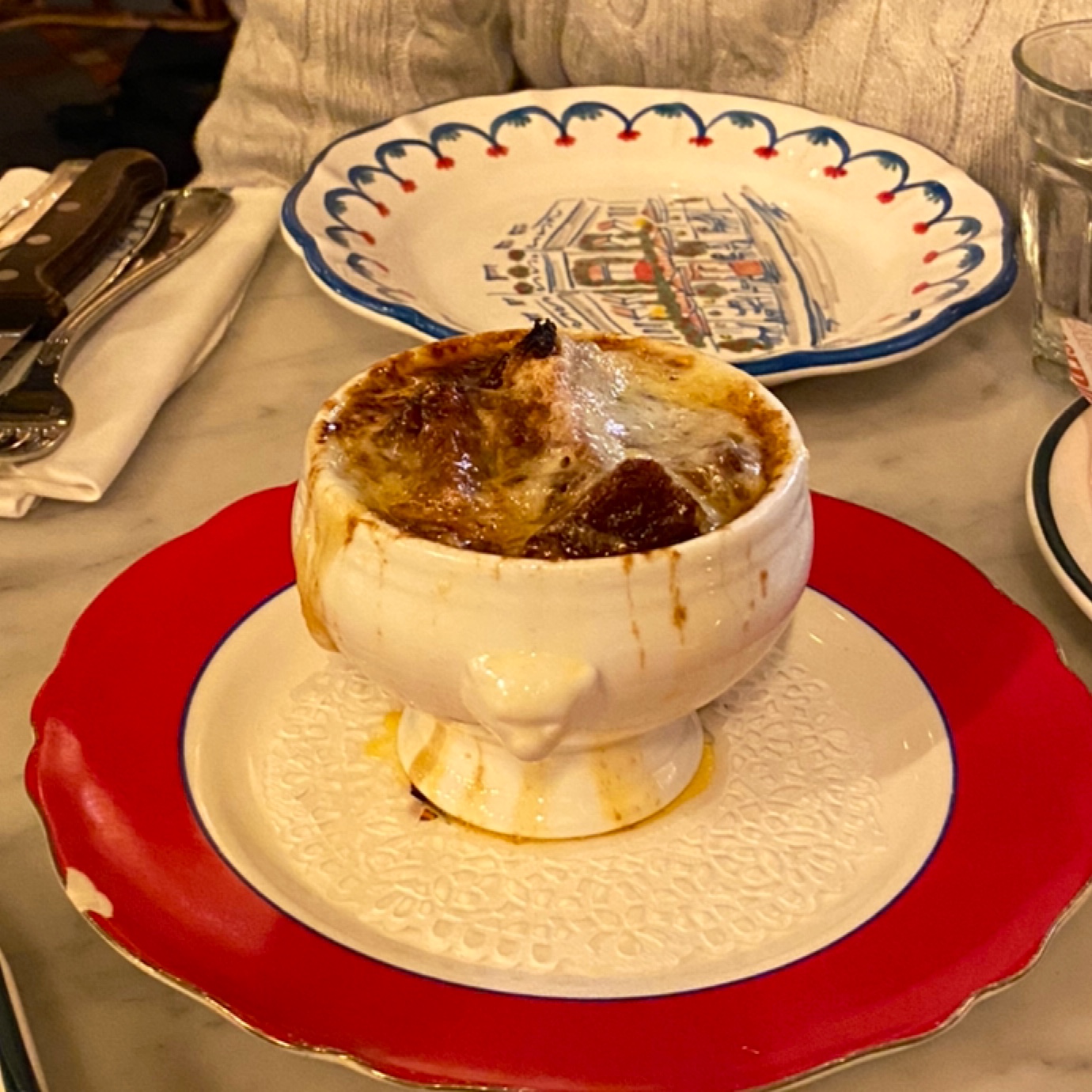 Bel endroit français. Nous avons déjeuné rapidement d'une soupe à l'oignon française qui est spéciale dans la maison ; escargots et croque madame. Très délicieux. 42 € au total le midi. Je le recommanderai.