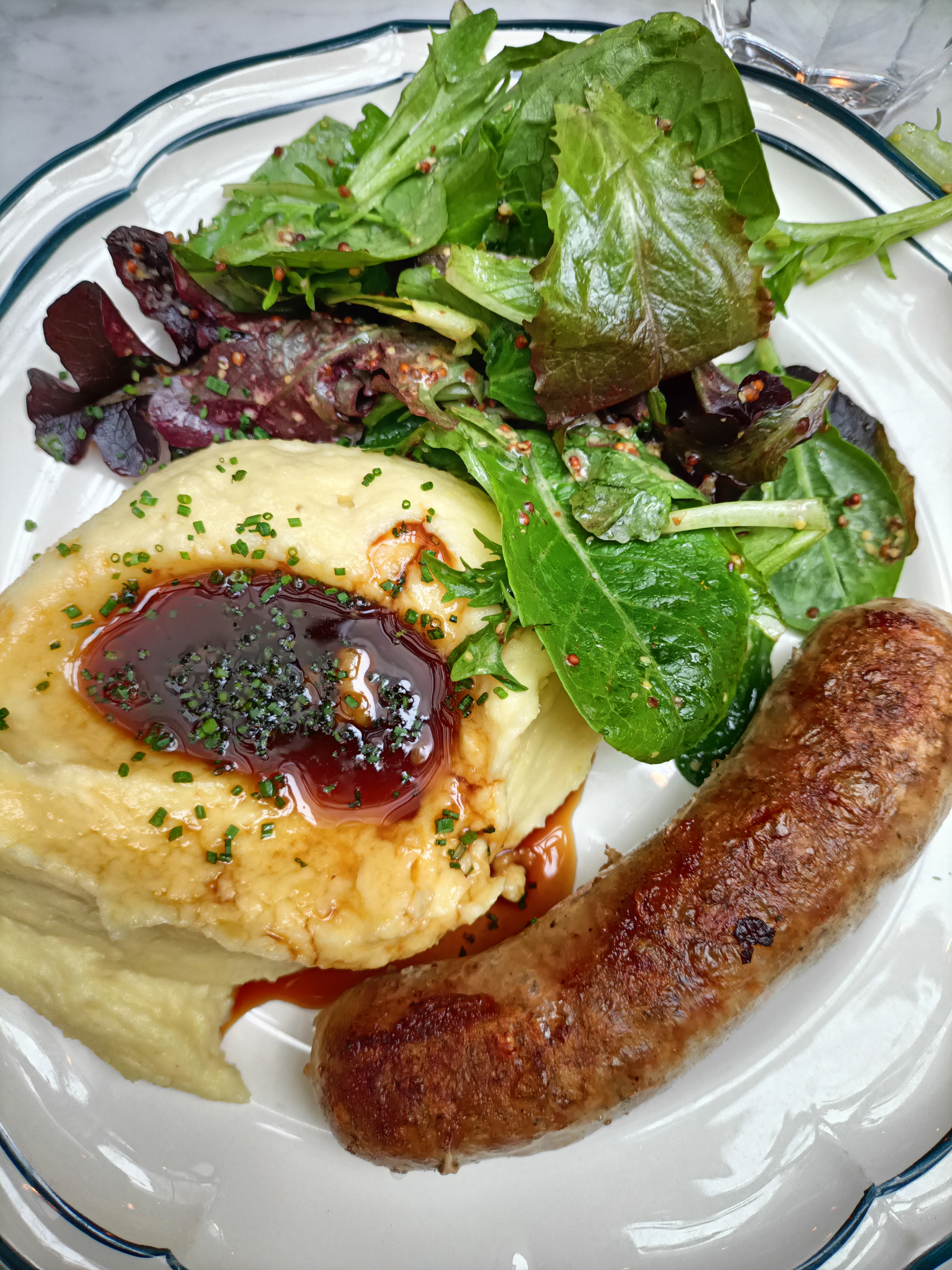 Quelle brasserie incroyable avec un bel espace, un service incroyable et des prix raisonnables. Nous avons commandé de la vinaigrette de poireaux, de la purée de saucisses et du hampe de bœuf. Tous les plats étaient excellents et surtout la purée de pommes de terre française avait une sauce au bœuf et était délicieuse