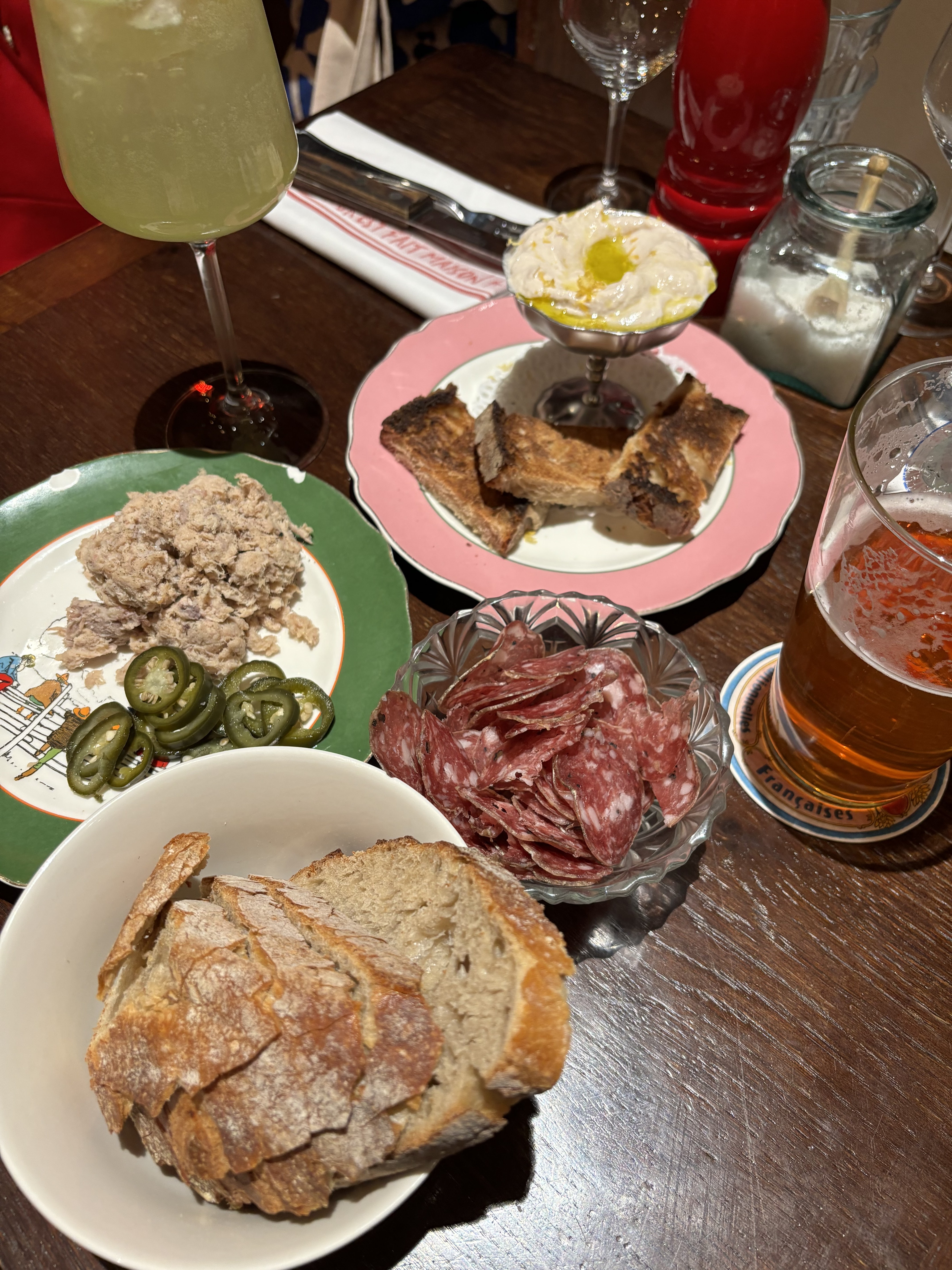 Nourriture exceptionnelle! Les entrées étaient incroyables, même si nous avions déjà de meilleures huîtres ailleurs. Le fromage et le saucisson étaient divins. L'entrecôte fondait ! Alors tout va bien ! Les desserts étaient bons. Le personnel était très gentil et poli. Toujours utile. L'endroit était tellement charmant. Nous avons adoré les jarres à eau, venues du Portugal ! Je recommande vivement cet endroit.