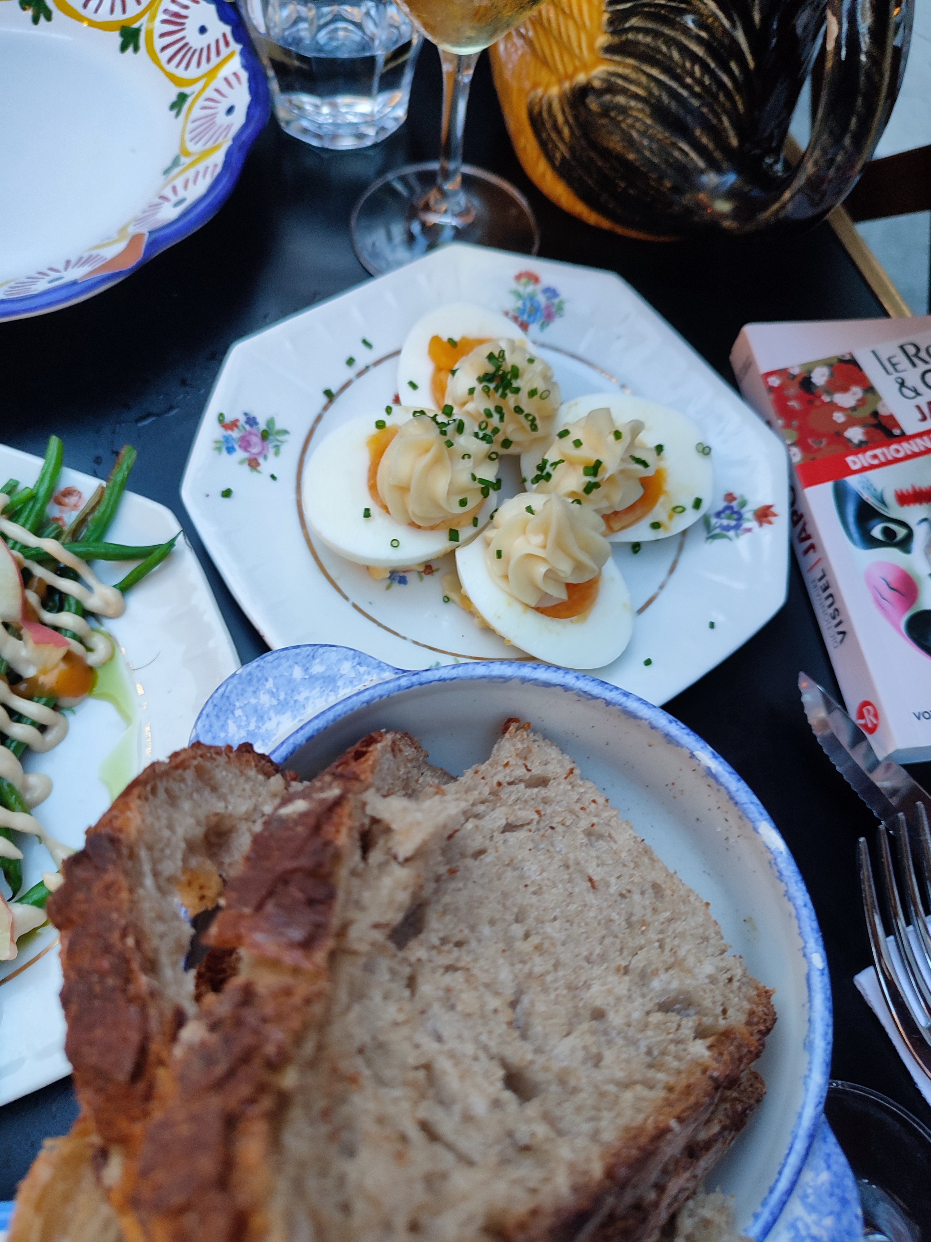 Une atmosphère et une esthétique qui m’ont énormément plus !!! Un grand merci à Maria qui a été formidable 👍 - Entrée Jesus 7/10 (un bon saucisson) Œuf mayo (de loin ma préféré mayo maison 😋) Poireaux 9/0 (frais et léger) - Plat Poulet rôtie 10/10 (merci) - Dessert Crumble au pêche 10/10 (un délice) Mousse au chocolat 8/10 ( manque de générosité) Dommage que mon verre de vin 🍷 soit bouchonnée …