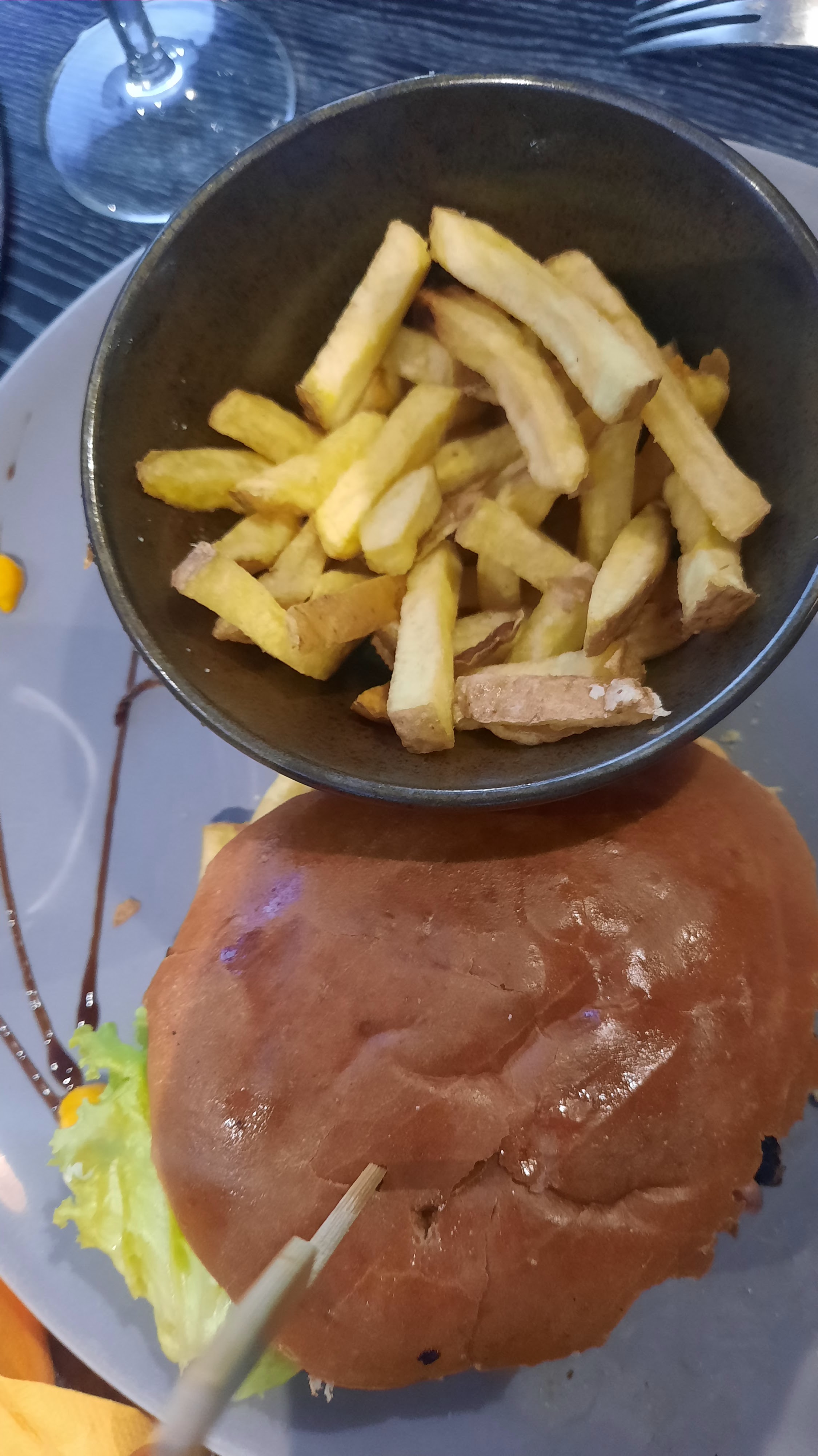 Accueil super sympa, et les plats sont bon et suffisamment garnis. Sur la photo, Burger maison. Pour ma part tartare au couteau excellent