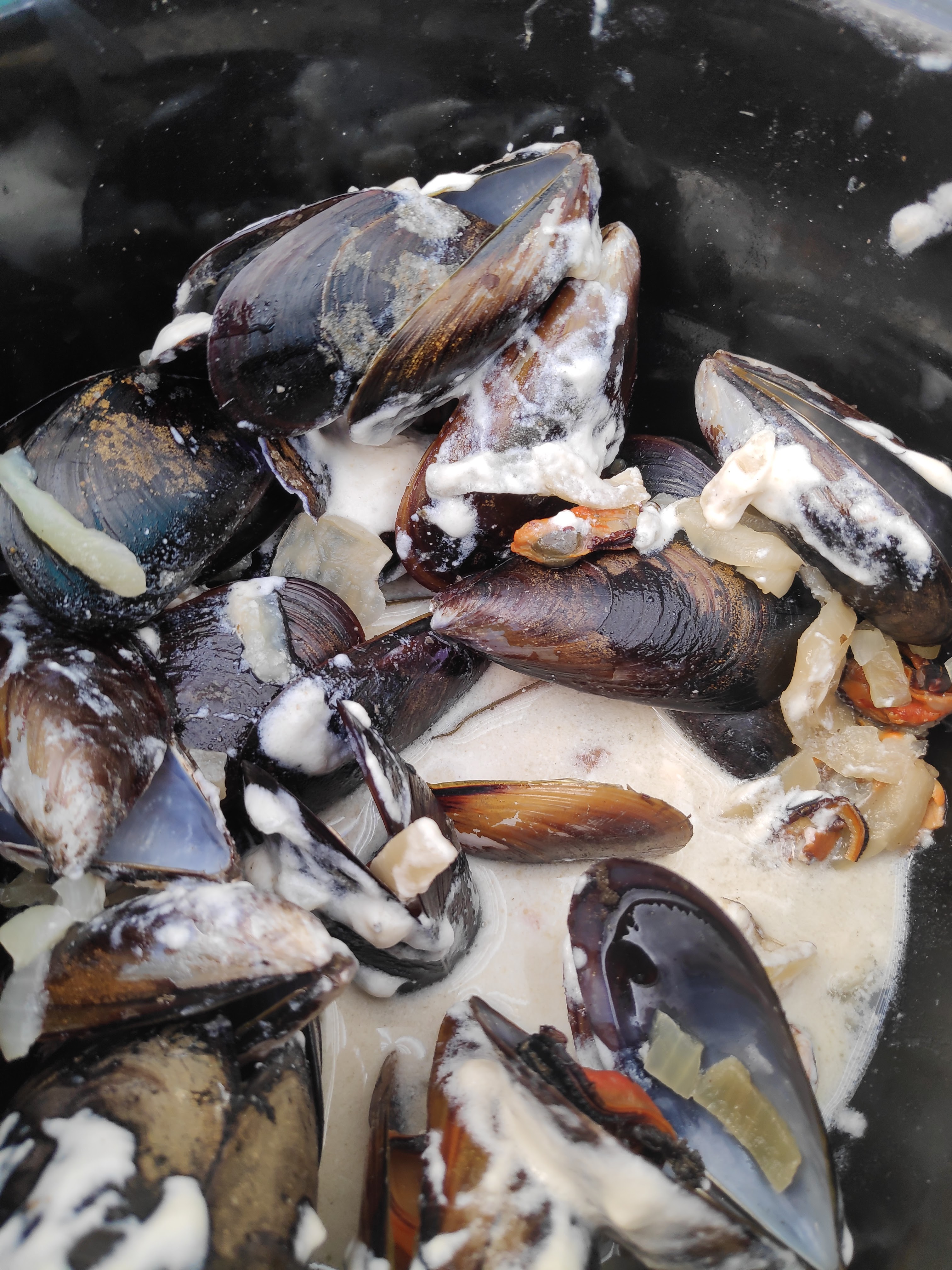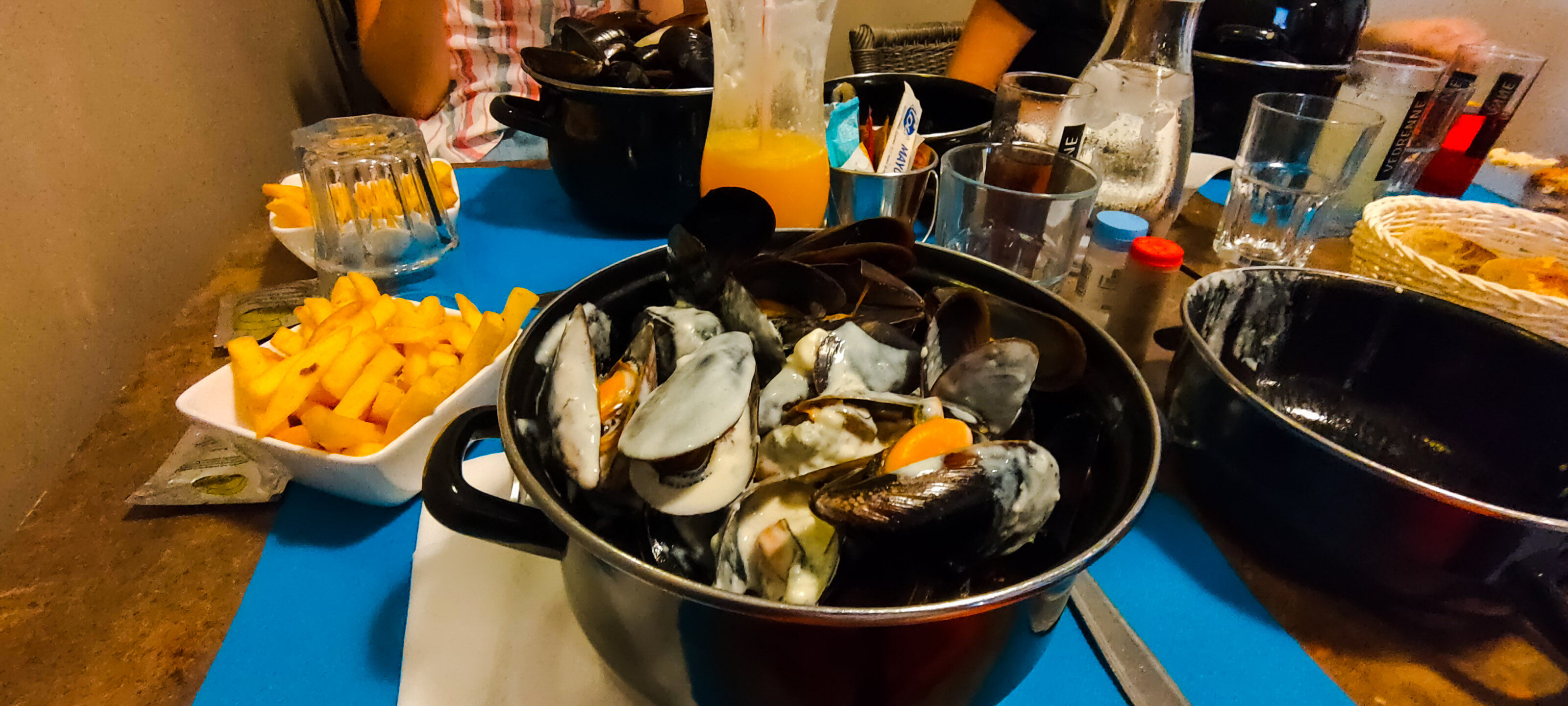 De l attrapé tourisme. .des moules ..pas locales.. d Espagne et servies mal cuites .desséchées et ratatinees avec un filet de crème..fraîche ? . A fuir. Geste commercial malgré tout ..bières gratuites .