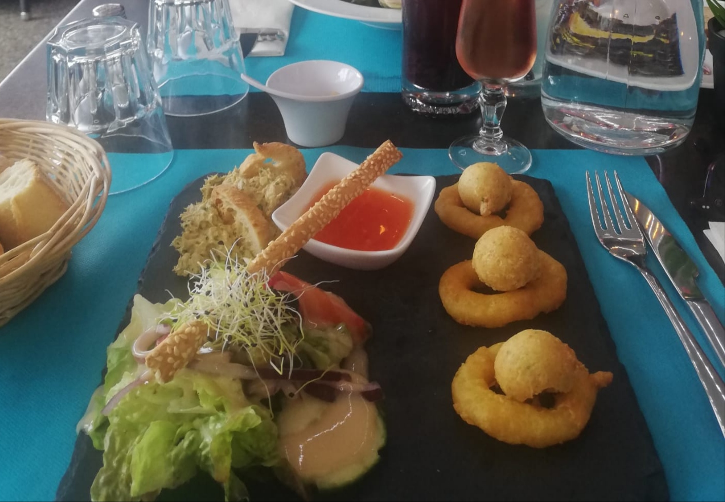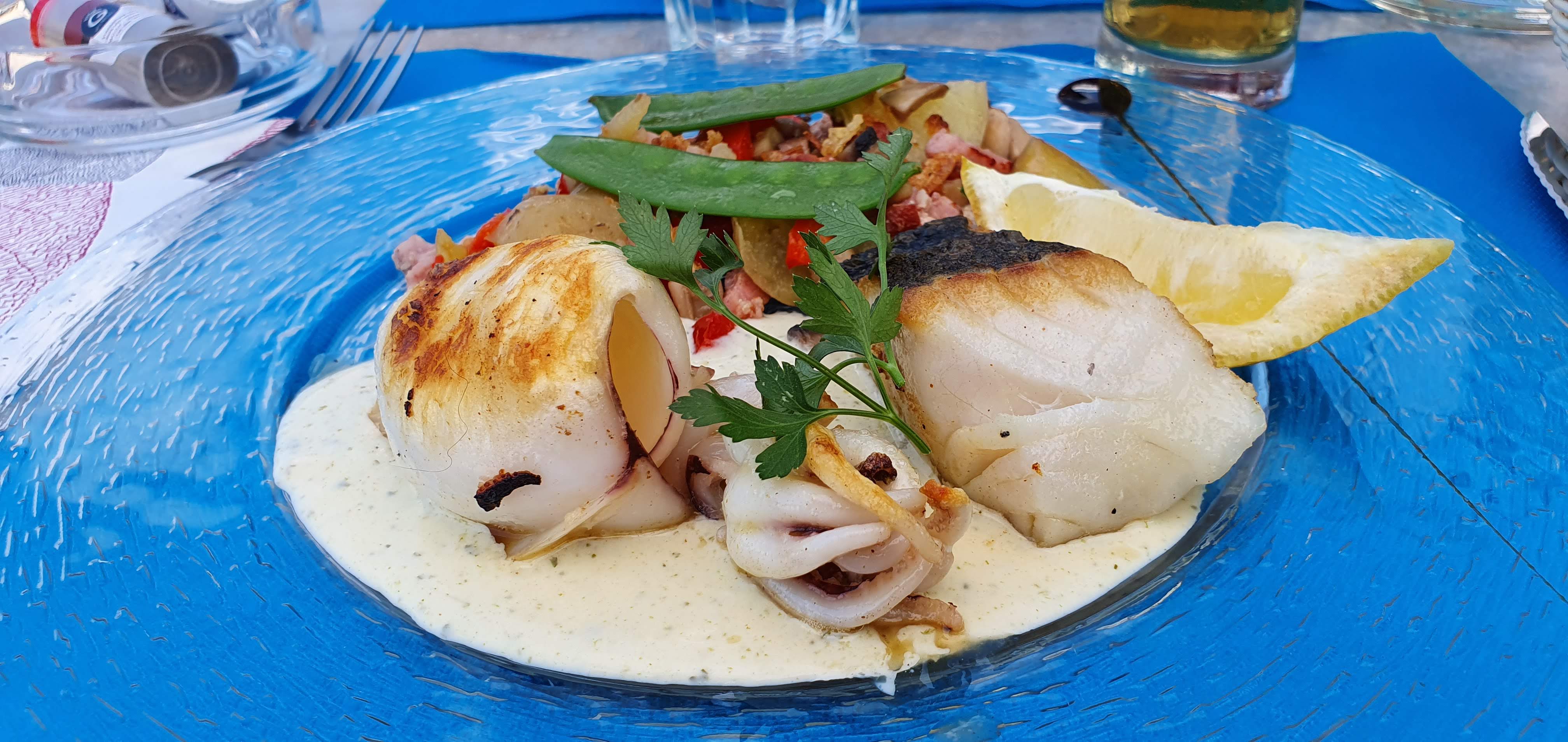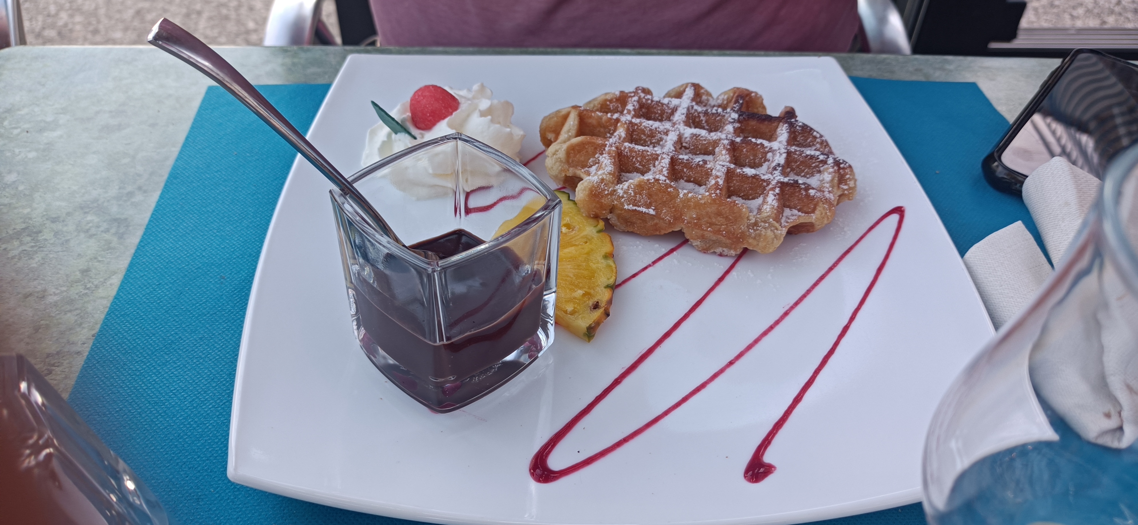 Bon accueil. Nous avons réussi à avoir une table pour 3 sans réservation (chance?) car la ville était particulièrement animée ce jour-là. Nous avons été servies rapidement malgré le monde. Le plat de gambas était très bon, la raie également qui était en plat du jour. En revanche, les moules étaient un peu trop salées. Les desserts étaient plutôt bons, la déco des assiettes auraient pu être un peu plus agrémentée ou servis dans des assiettes plus petites (impression de vide dans l'assiette alors que le dessert est copieux). Attablés en intérieur au frais malgré la chaleur, des ventilos sont à disposition ce qui est appréciable, ce qui l'était moins, dû à notre disposition proche du bar, était d'entendre la communication, parfois un peu bruyante, du personnel. Nous avons passé un bon moment et apprécié ce repas.