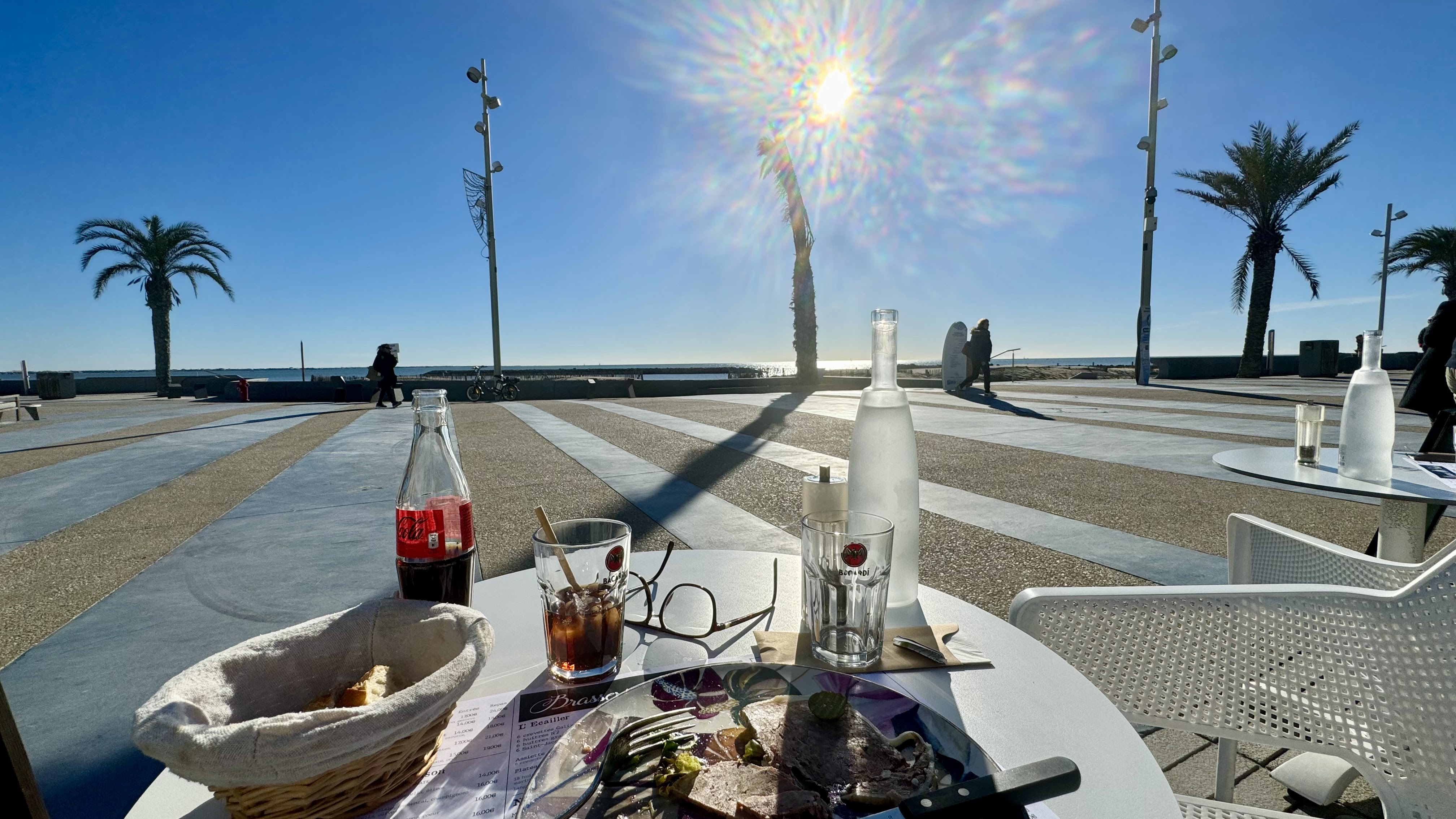 Dimanche 19 février 2023, un temps magnifique, un vrai weekend de printemps avant l'heure et en plus le début des vacances scolaires dans la région. La Grande Motte est logiquement noire de monde, fréquentation digne d'un mois d'août, toutes les terrasses et glaciers sans exception font le plein. On trouve miraculeusement une table libre dans cette nouvelle brasserie, on s'y installe. On est jeté 2 minutes plus tard par le serveur qui nous dit qu'il a finit son service. D'où on refuse du monde un dimanche de forte affluence à 16h ?! Bon bah du coup on reviendra plus 🤷♀️