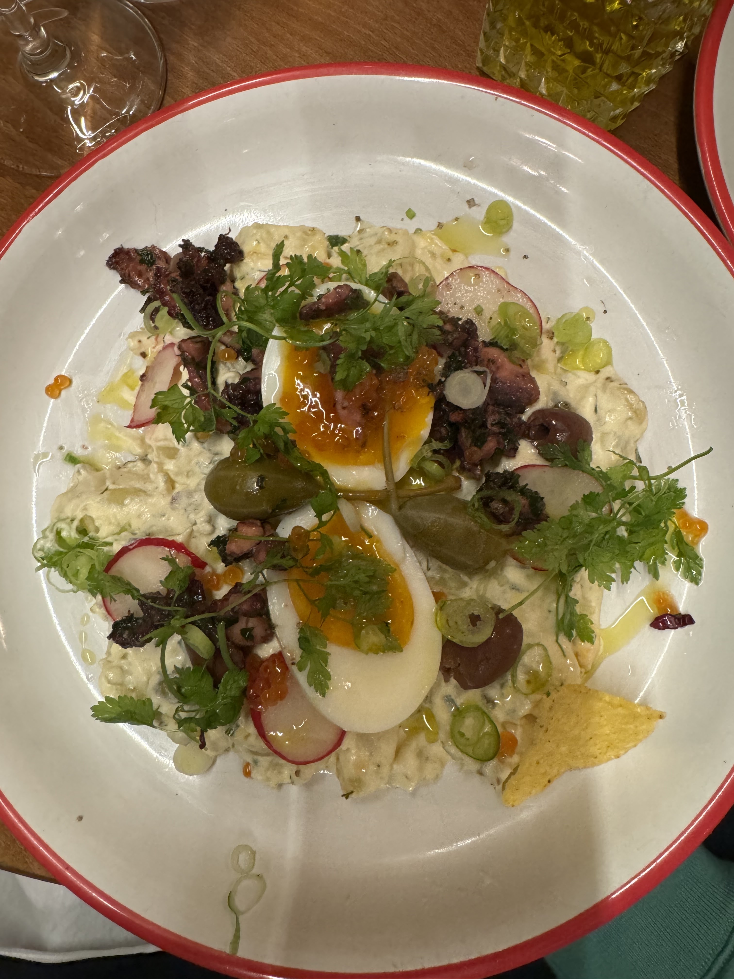 24€ pour une salade de pomme de terre où j'ai vu passer quelques bouts de poulpe... 12€ pour un guacamole, le tout avec une serveuse au sourire fragile. Il y a bien mieux à Paris, heureusement !