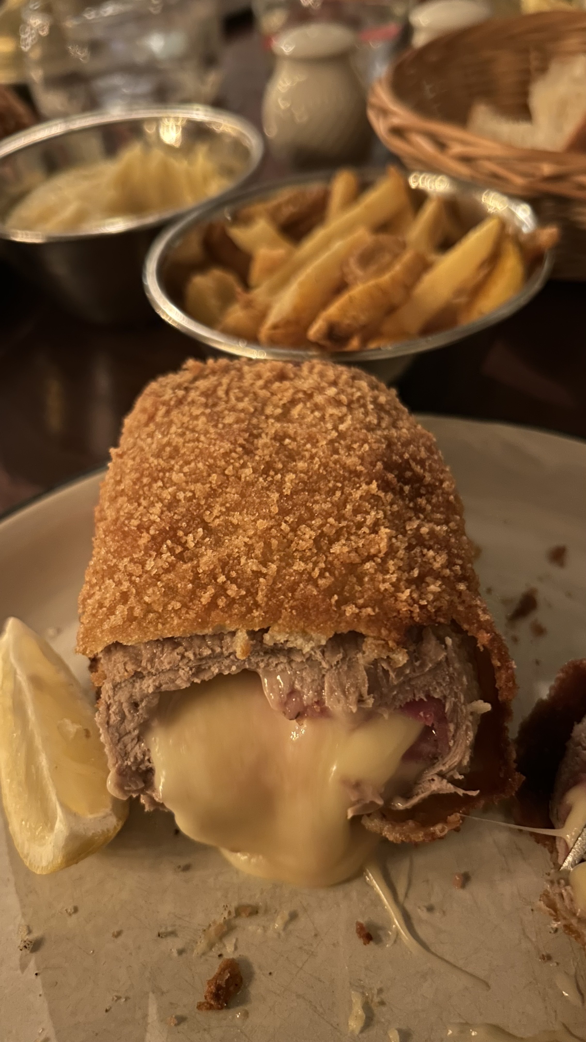 Serveurs sympathiques et professionnels avec un lieu chaleureux. Je n’ai testé que le cordon bleu “fait maison” au jambon blanc et au gouda qui a été une véritable déception. Plutôt un produit congelé réchauffé avec la panure qui se détache, de l’eau qui s’échappe, du poulet gris (et non du jambon blanc), du fromage industriel encore dur et pâteux (et non du gouda fondu). À 26€, ce n’était pas le cordon bleu que j’espérais. Je ne recommande pas ce plat.