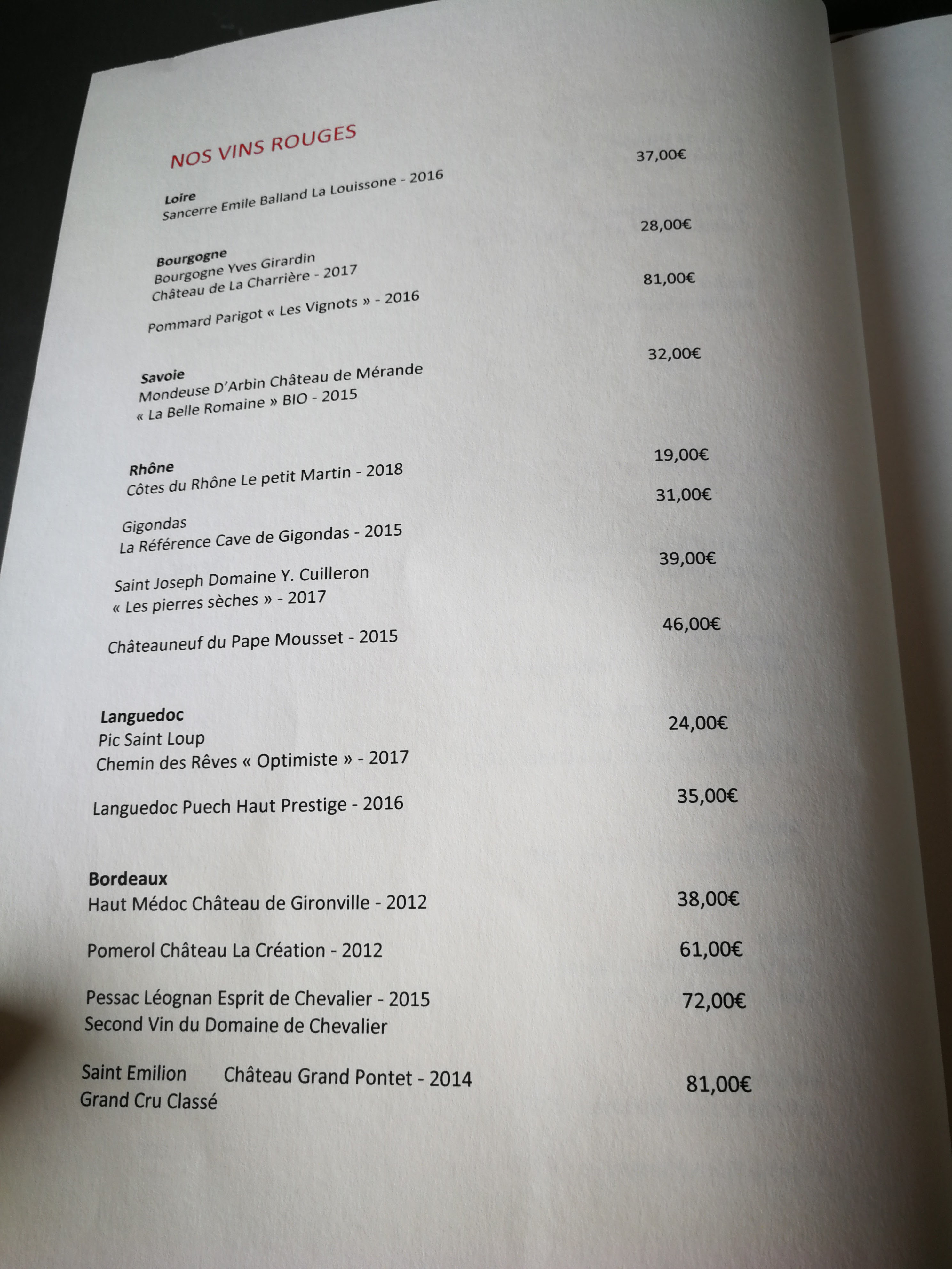 Plat du jour 15€, menu 25€ prix très corrects . Mais ce mardi il n’y avait plus de plat du jour à 12h45. On a donc pris la noix d’entrecôte à 25€. Sauf que c’est 25€ les 100g (soit 250€ le kg !) Résultat plus de 140€ à 2 et des serveurs qui en rajoutent “vous n’aviez qu’à bien lire la carte”. Moralité ce sont des voleurs et s’il n’y a plus de plat du jour courage fuyez !
