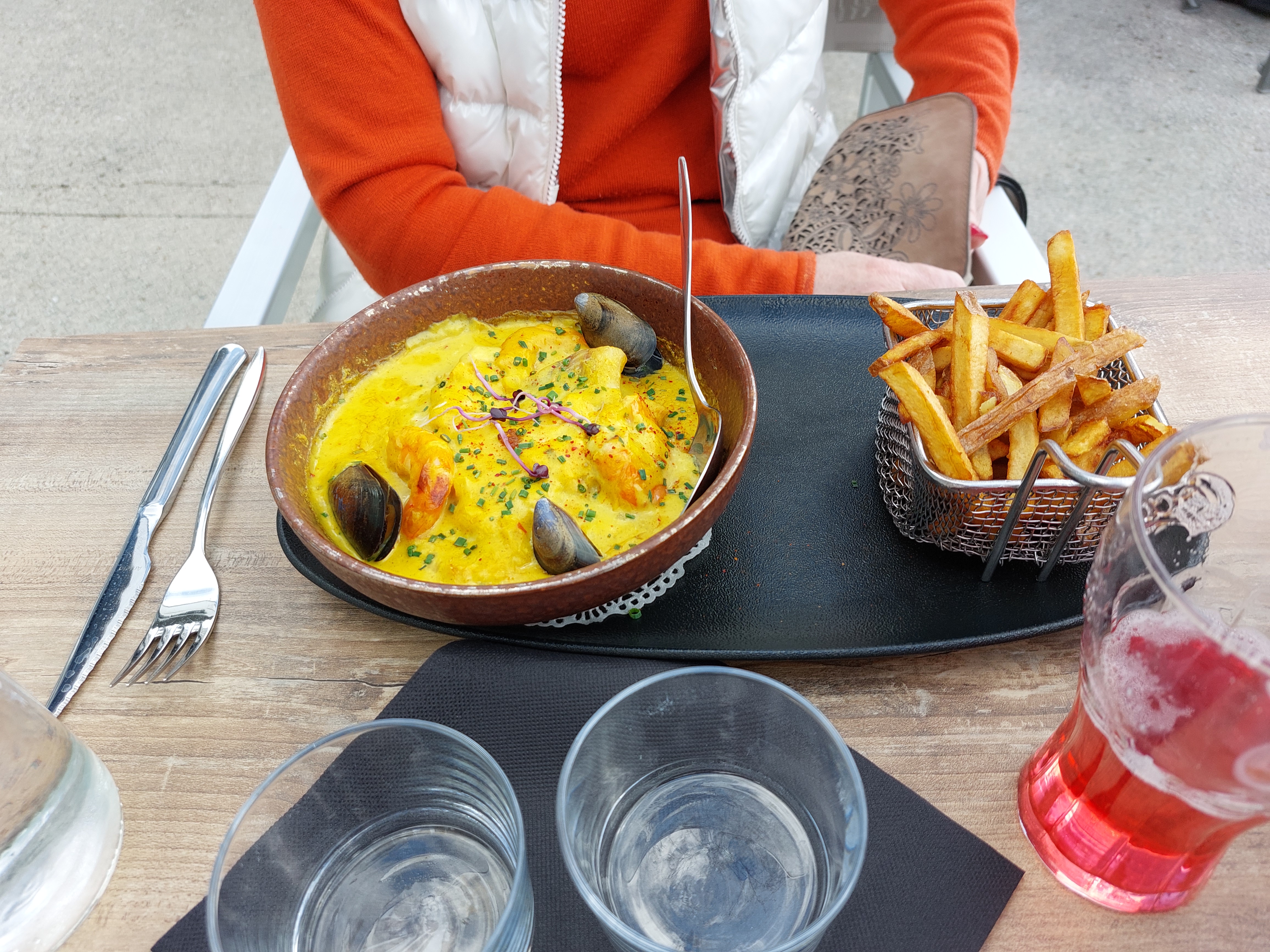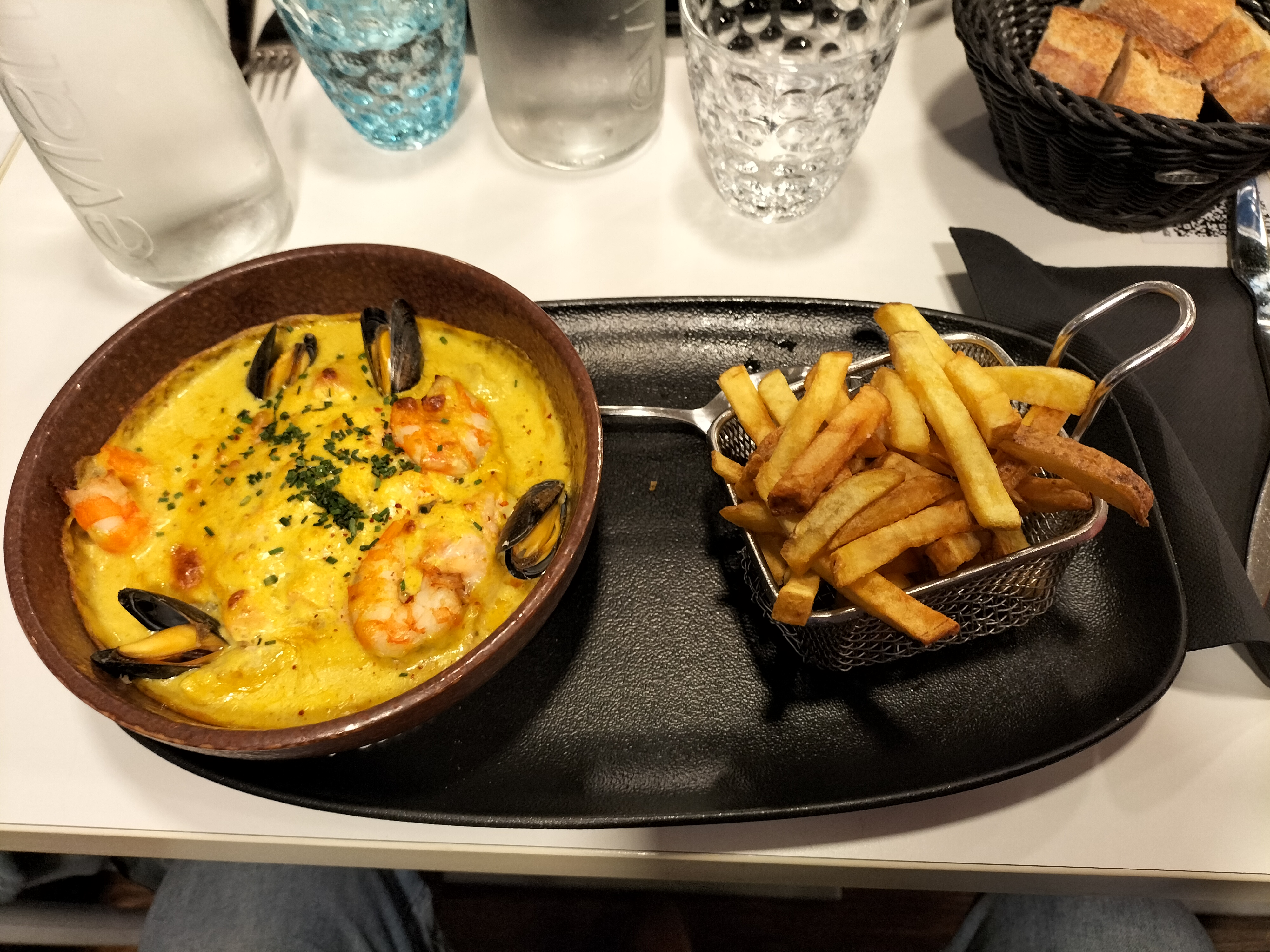 Cadre agréable. Entrée (gravlax de saumon) très bonne. Moule fraîche mais frites un peu fade et sèche. Dommage.