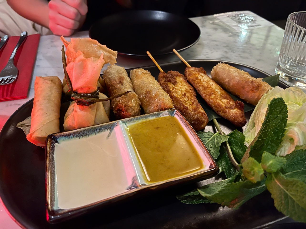 Nous sommes arrivés vers 14h30 dans le restaurant et nous avons été bien reçus . L'assortiment de nems et les brochettes étaient suffisantes pour deux personnes. Nos plats étaient délicieux ! Légumes frais et épices et herbes nous faisant voyager du bon côté de la plaque eurasienne 😉❕ je vous le recommande !