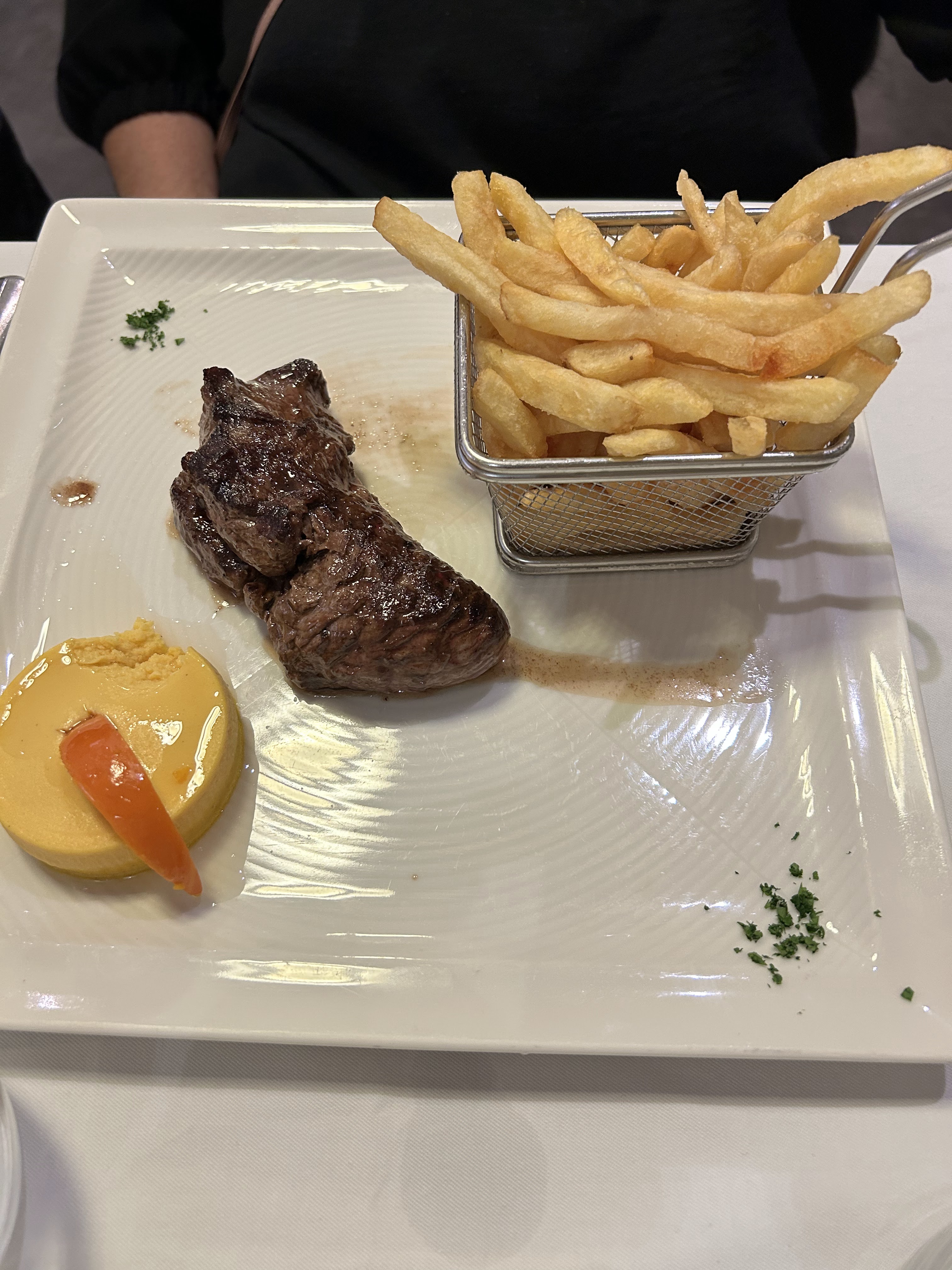 Plat dont la viande est dure, décongelée trop vite ? les frites sont blanches et à la limite du cuit, une cuillère à soupe de petits pois pas top non plus. Vraiment déçue par le plat. Heureusement que le buffet de desserts rattrape la cata du plat