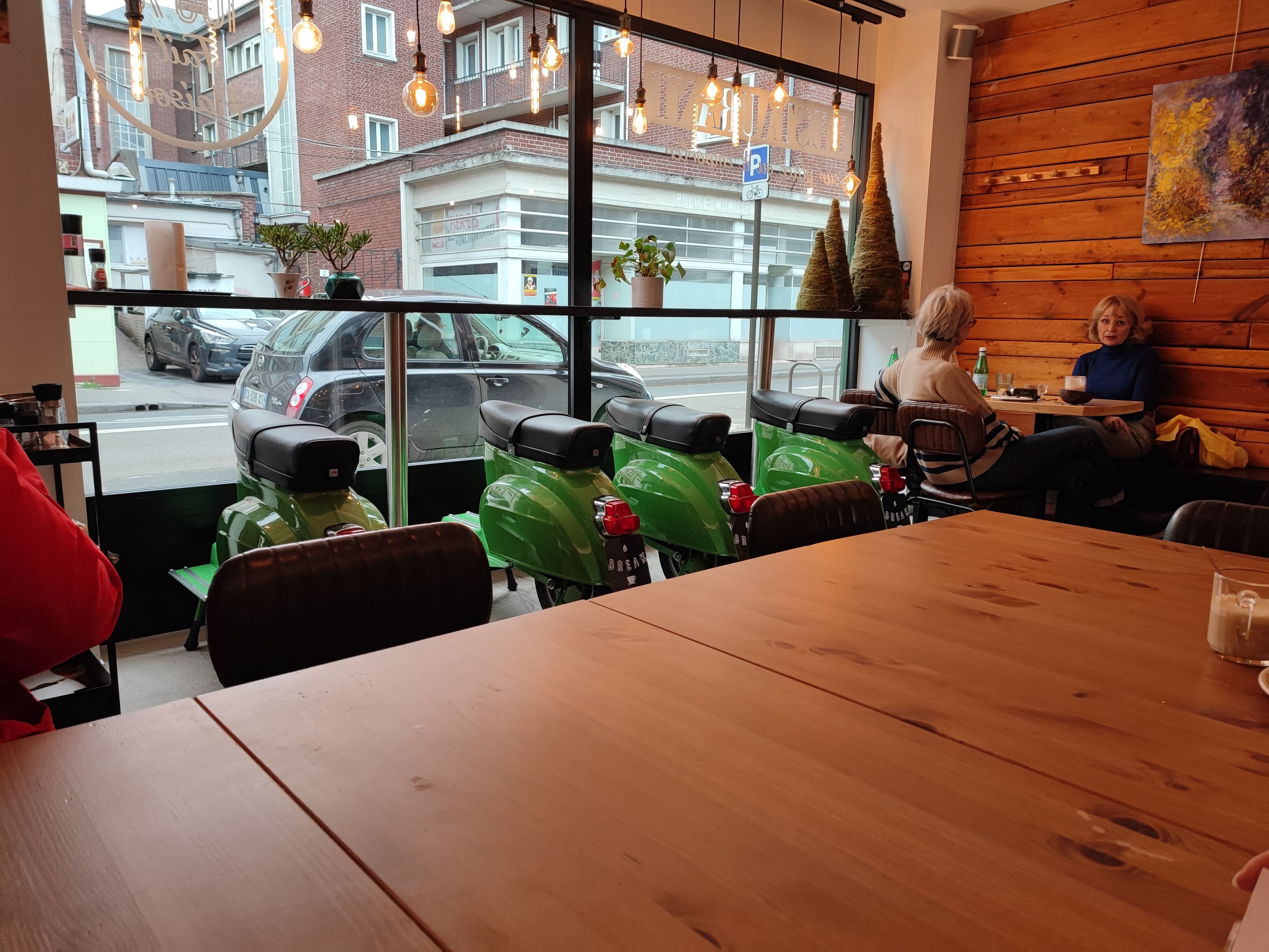 J'aime bcp cet endroit, tout est siii bon, c'est terrible :) , j'ai tjs ete bien recu, c'est propre. On peut etre une grande tablee, en tete a tete ou seule, on trouve tous notre coin favori. La deco, la vaisselle vintage, la terrasse, le service sont vraiment impeccable. Le seul truc qui ne matche pas, ce sont les sieges de scooter vert : personne ne s'y asseoit car on s'y sentirait ridicule et ca na pas l'air confort car nos jambes seraient arches et le dos en avant, bref, c'est no way + des places de perdues...dommage, des tabourets simples suffiraient tres bien pour avoir vu sur la rue ;) merci