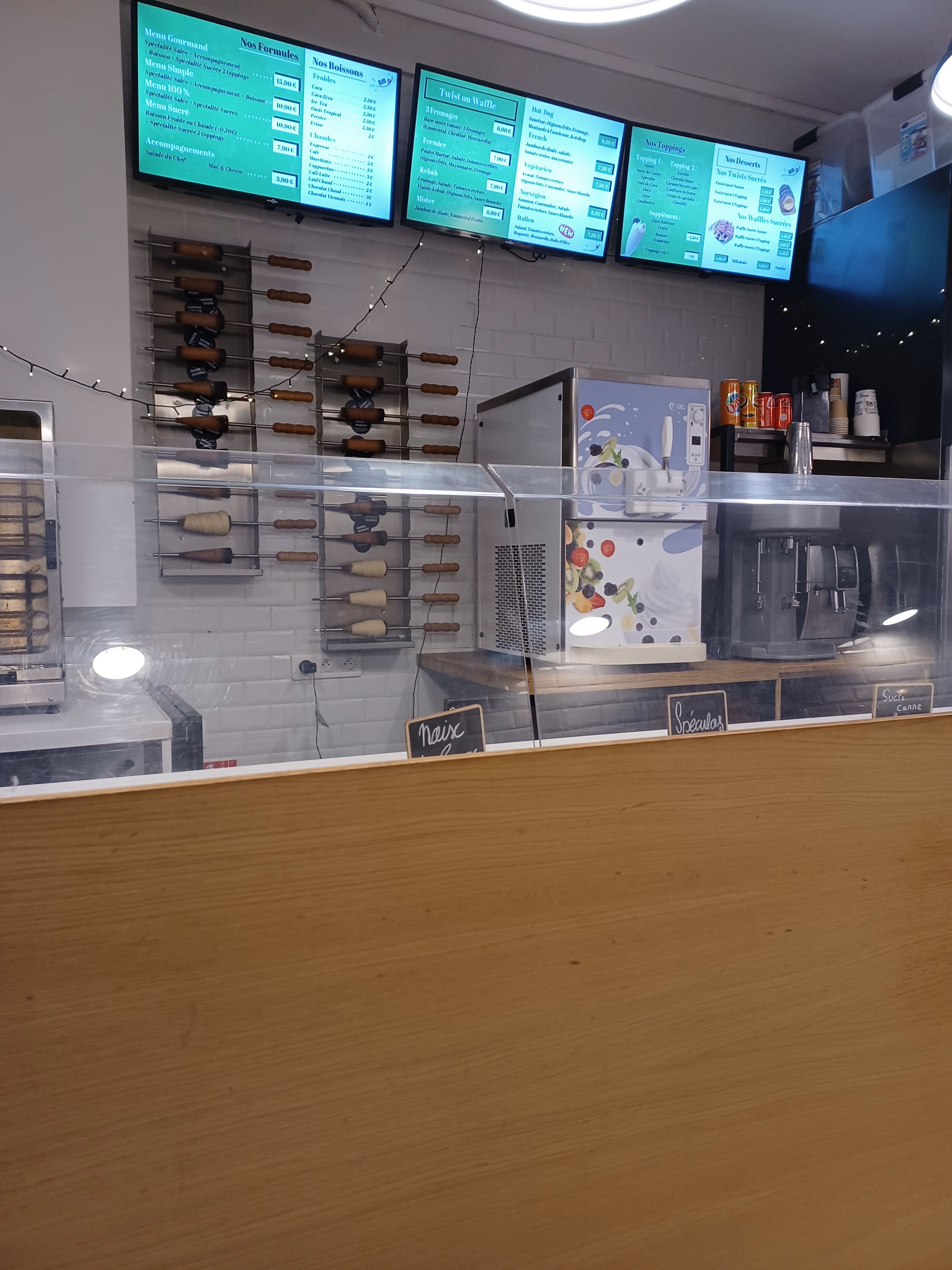 Accueil chaleureux avec une belle ambiance avec des employés de qualité bien accueilli par la caissière gentille et accueillante qui m’a conseillé, avec un établissement propre ,j’ai pris une gaufre délicieuse avec une employé rapide et efficace je recommande !!!!