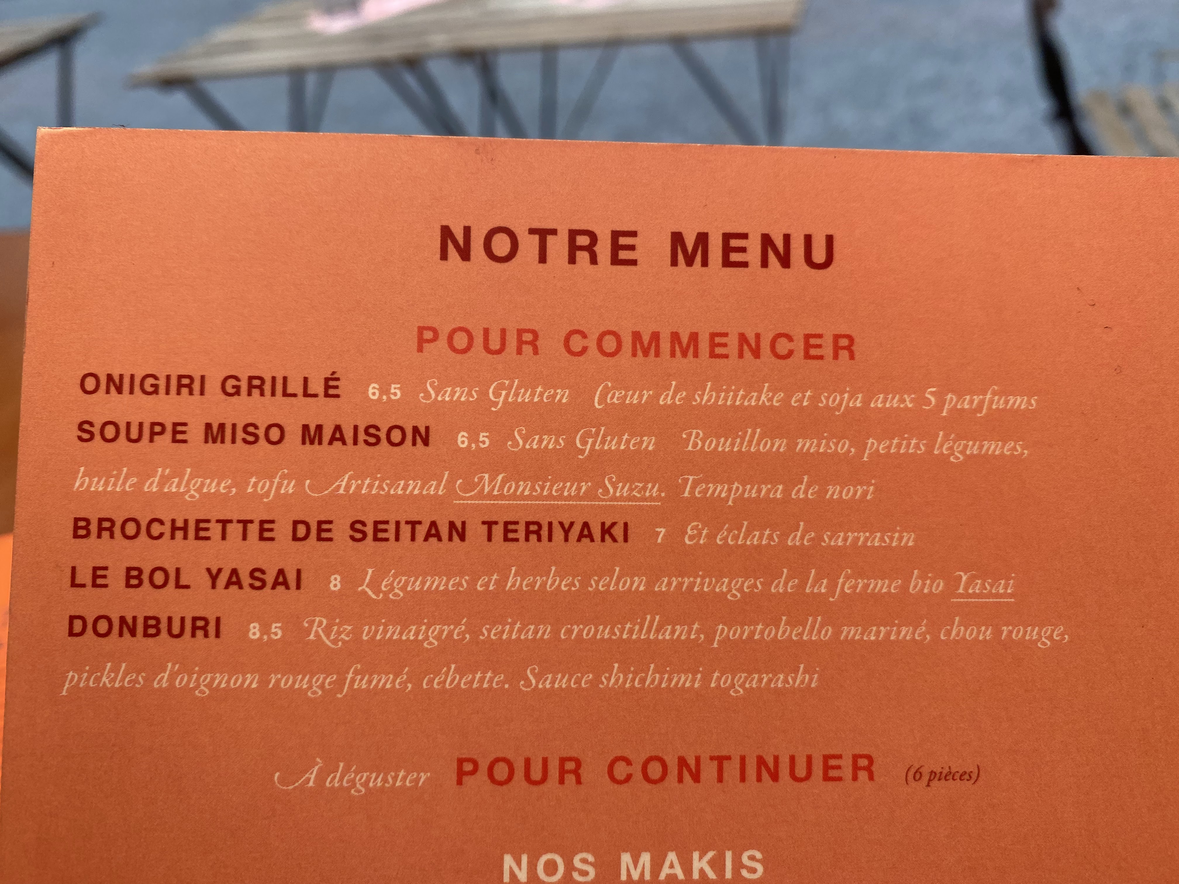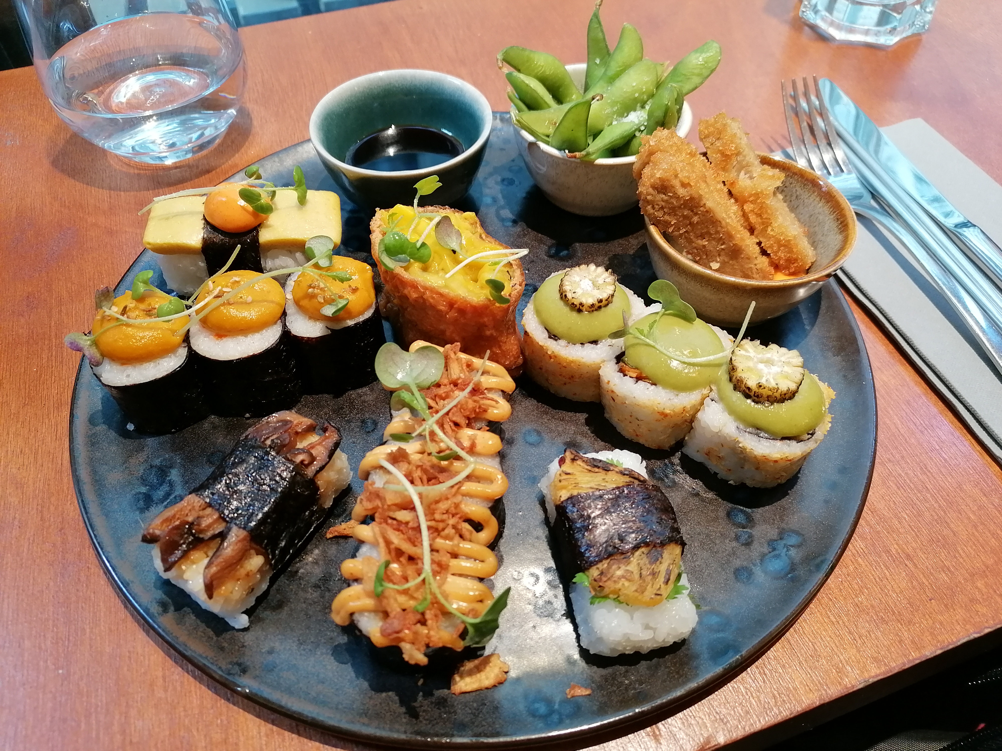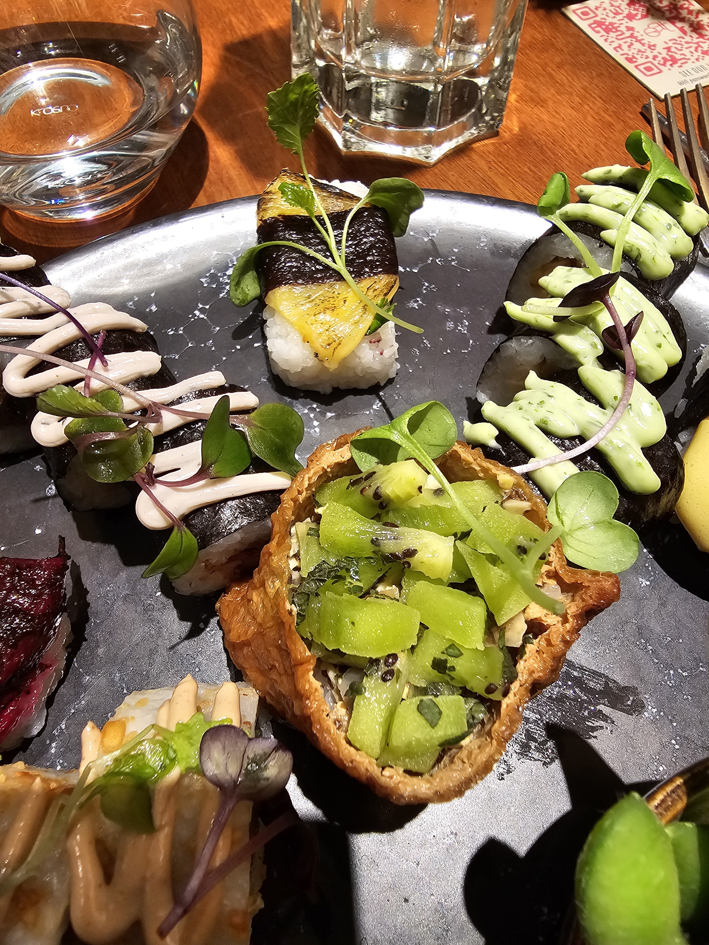 La cuisine est super originale et bonne, ça fait très plaisir de voir un restaurant de sushi (+autres) complètement vegan. Seul petit bémol pour les moins technophiles: il faut un téléphone avec un accès internet pour accéder au menu. En avoir quelques uns au format papier en secours serait bien. (photo du menu découverte)