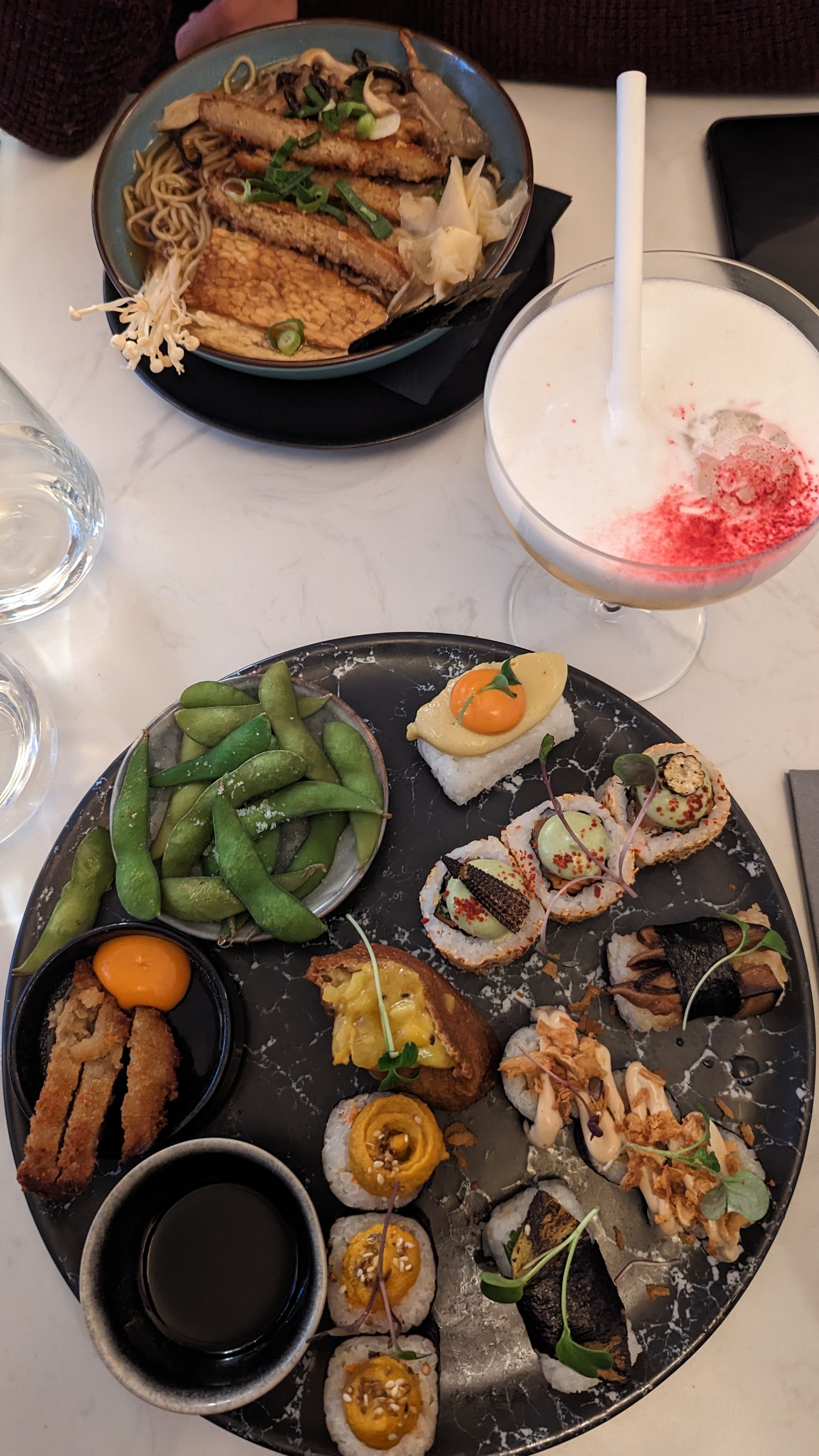 Restaurant d'influence japonaise mais vegan. On y retrouve des plats : makisushis vegan, un peu en mode World fusion. Makis asperges, makis chimichurri, etc. C'est bon, élégant, bien exécuté mais rien qui ne me laisse un souvenir mémorable, à l'exception du chimichurri qui était délicieusement relevé, juste ce qu'il faut. Le principal intérêt niveau plat se situe au niveau des entrées : le Karaage de seitan bien fait (même s'il mériterait plus de condiments) et le oyakodon, sans oeuf ni poulet (ce qui est étonnant vu le nom japonais du plat) mais qui était délicieux. Au point de regretter que les entrées ne soient pas les plats et réciproquement. Autre point positif, le sobacha gourmand : les trois petits desserts sont délicieux ; le sobacha aurait toutefois pu être plus généreux. Au niveau des gros bémols : une carte de deux sakés / nihonshu mais un des deux en rupture (pour cause de renouvellement de carte). Celui qui restait était très bon certes, mais peu accessible et peu abordable. Et surtout le menu dégustation, à la carte mais en rupture, frustrant, nous avons du nous rabattre sur la carte. Dernier point positif, les cocktails, qui ont fait l'unanimité. En résumé : c'est bon, c'est végétarien et original, mais c'est perfectible.