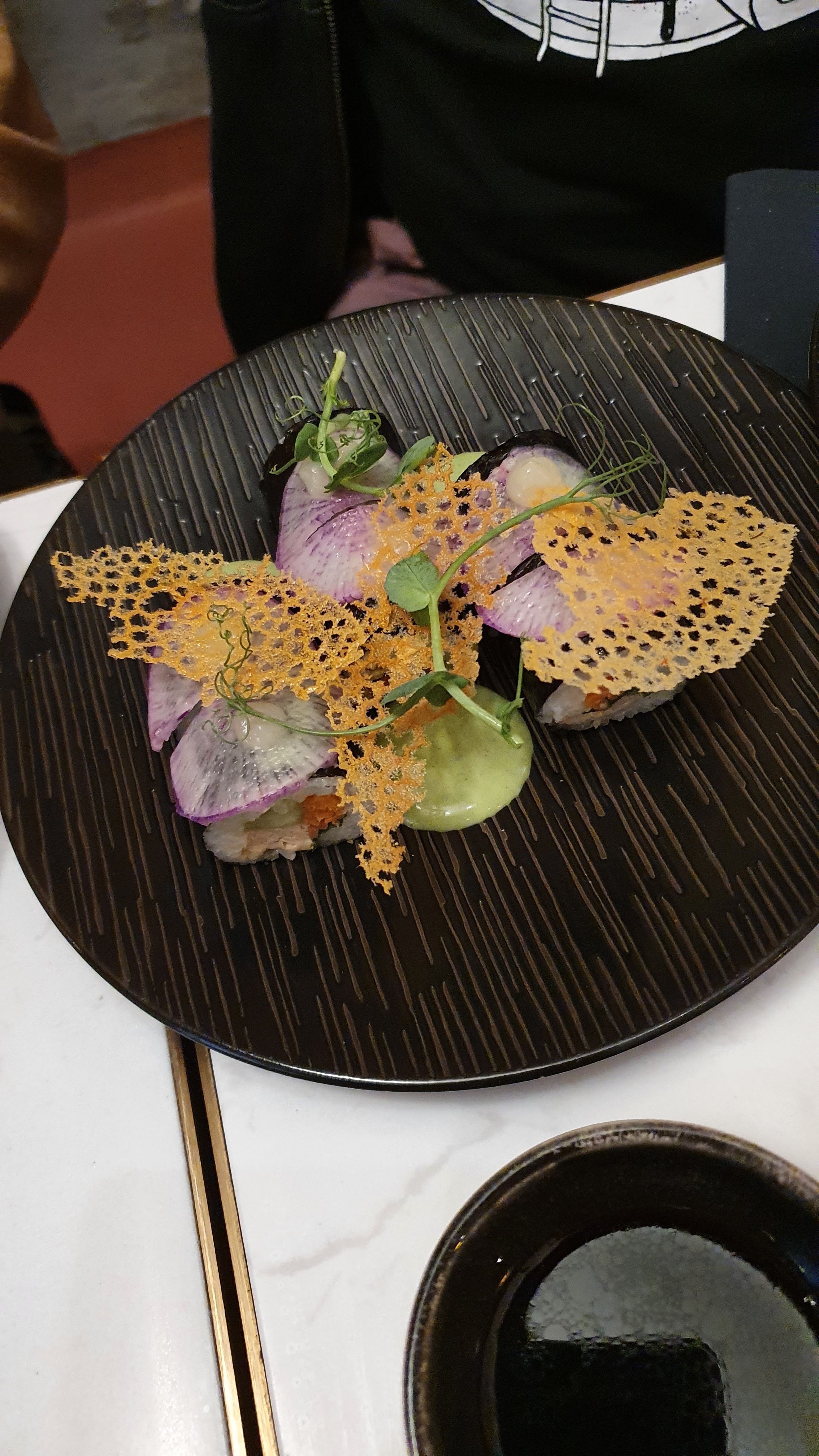 C'est un restaurant original ! Des sushis vegans on n'en trouve pas à tous les coins de rue. J'ai pris le menu découverte qui était bien pour un premier repas chez vous (bon et copieux). Je note le service 4 car je trouve dommage qu'il y ait un second tour. Ça oblige à quitter le resto un peu rapidement...mais les serveuses étaient tres bien. Concernant la dégustation : Les Nigiri sont incroyables. Par contre je trouve que dans certains sushis on ne sent pas assez ce qu'il y a à l'intérieur. Peut être trop de riz ou pas assez de garnitures. le raifort je n'ai pas reussi à sentir les légumes à l'intérieur mais la sauce au dessus était bonne. Finalement la solution que j'ai trouvé pour bien déguster le reste des sushis c'est de les manger par moitié ! 😋 La panko de seitan en bâtonnet je ne sens que la friture. Voilà les quelques retours. Merci pour la soirée et belle continuation.