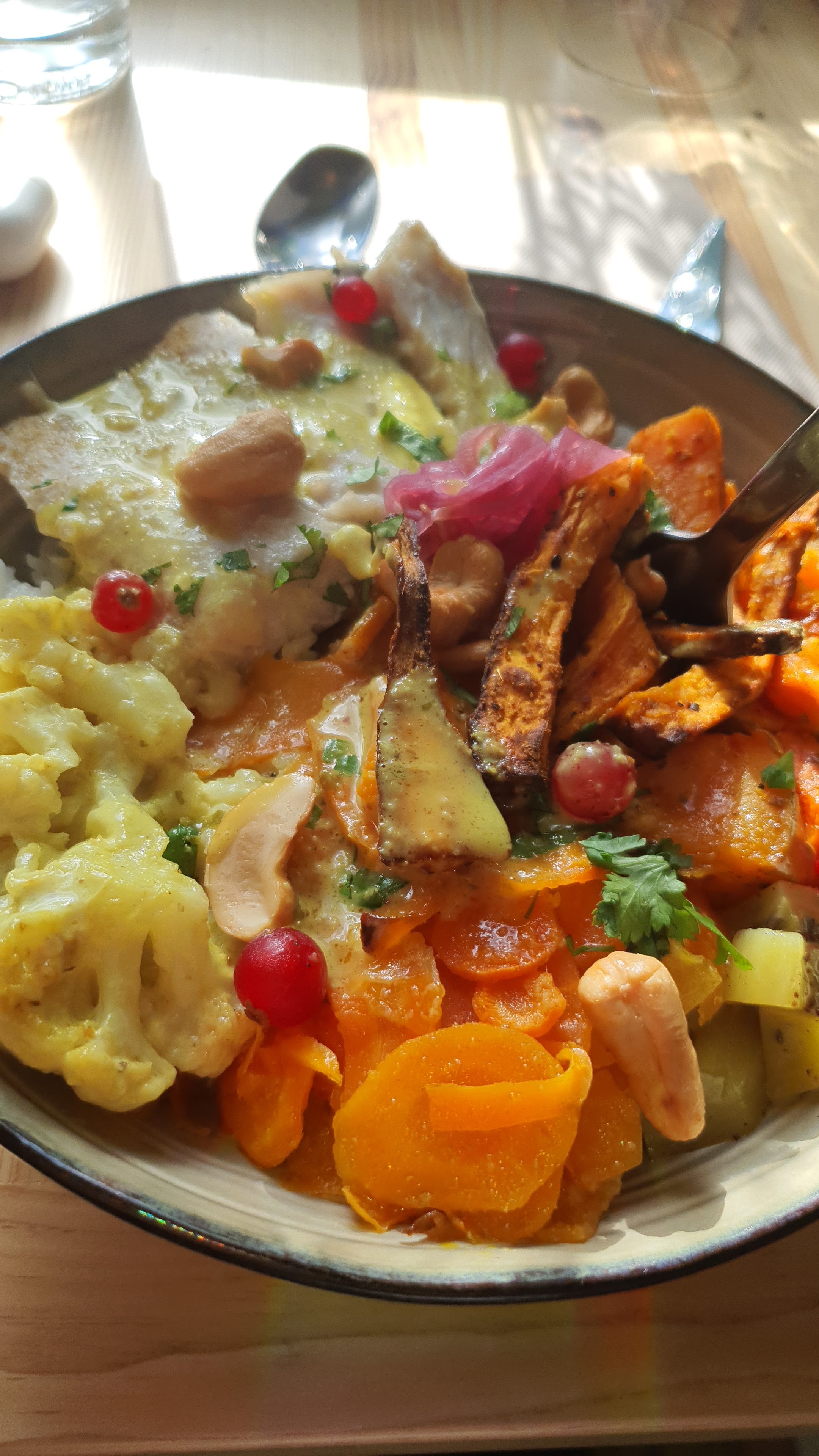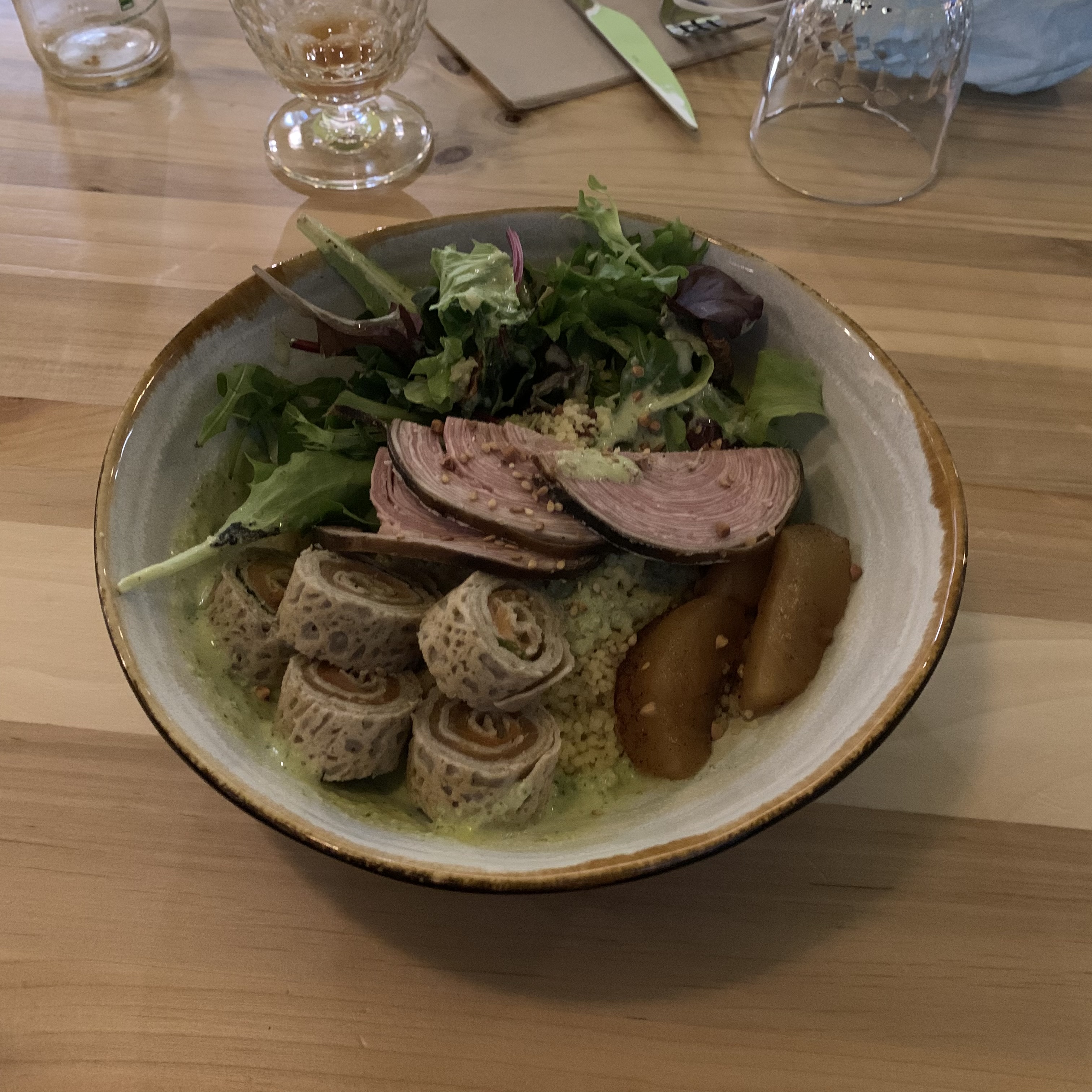 Jolie découverte au détour de la visite de cette magnifique ville. Repas à tendance healthy et bien équilibré, pas mal d’ingrédients dans un seul bowl pour un mélange de saveurs bretonnes et asiatiques ! J’ai beaucoup aimé tout comme le dessert :)