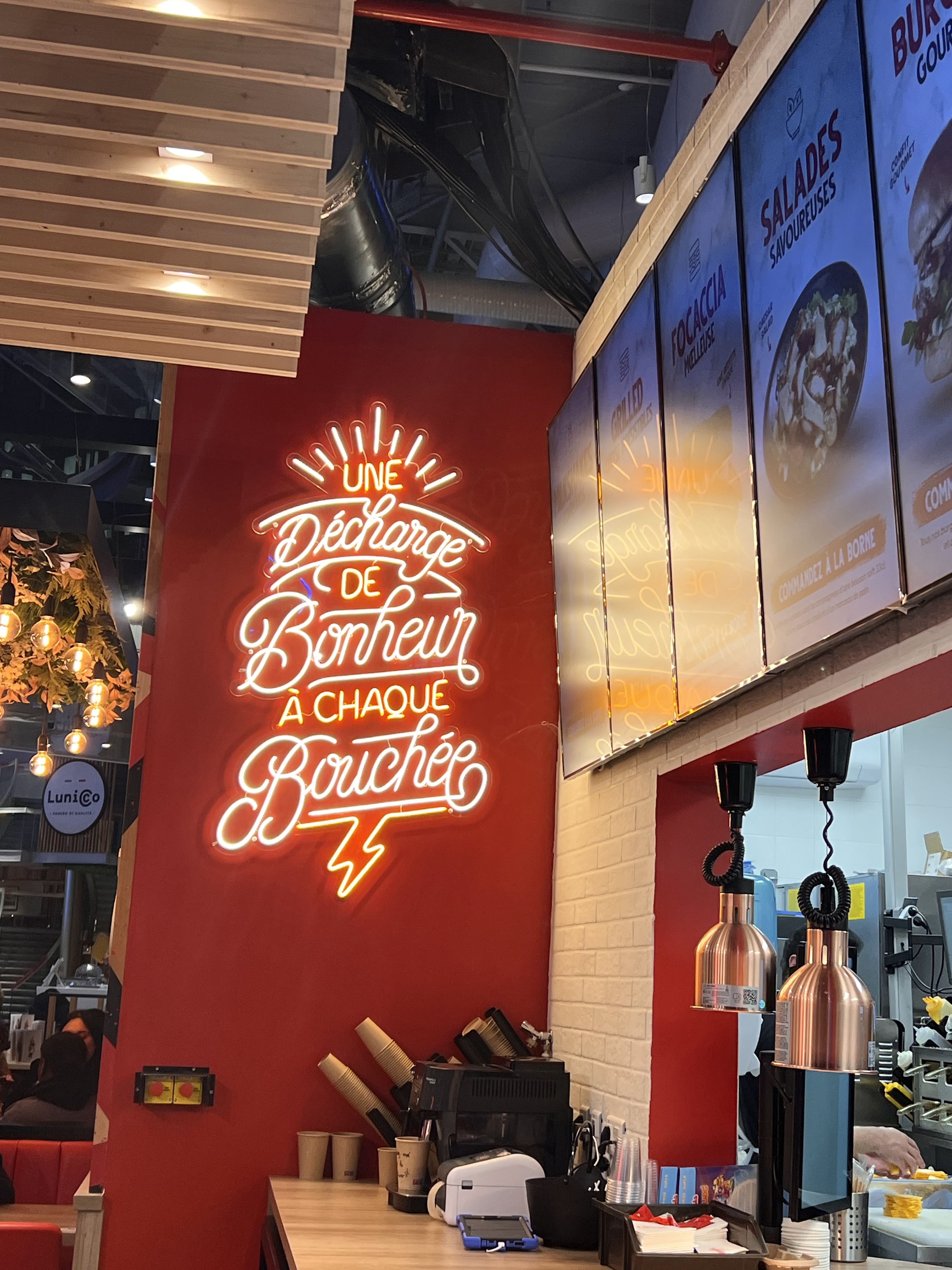 Niveau ambiance on est bien placé, juste à côté du cinéma, de la tête dans les nuages, de Starbucks, y a du passage sans gêner pour autant. Question service, c'est propre, ils sont polis et avenant. Le meilleur pour la fin, hé bien je n'avais pas faim mais cela m'a vite ouvert l'appétit, habitué de la défense j'ai étais surpris de découvrir un fast food de la qualité d'un restaurant, là c'est une sacré surprise, la qualité des aliments est largement au-dessus de ce qu'il n'y paraît. C'était la première fois, certainement pas la dernière.