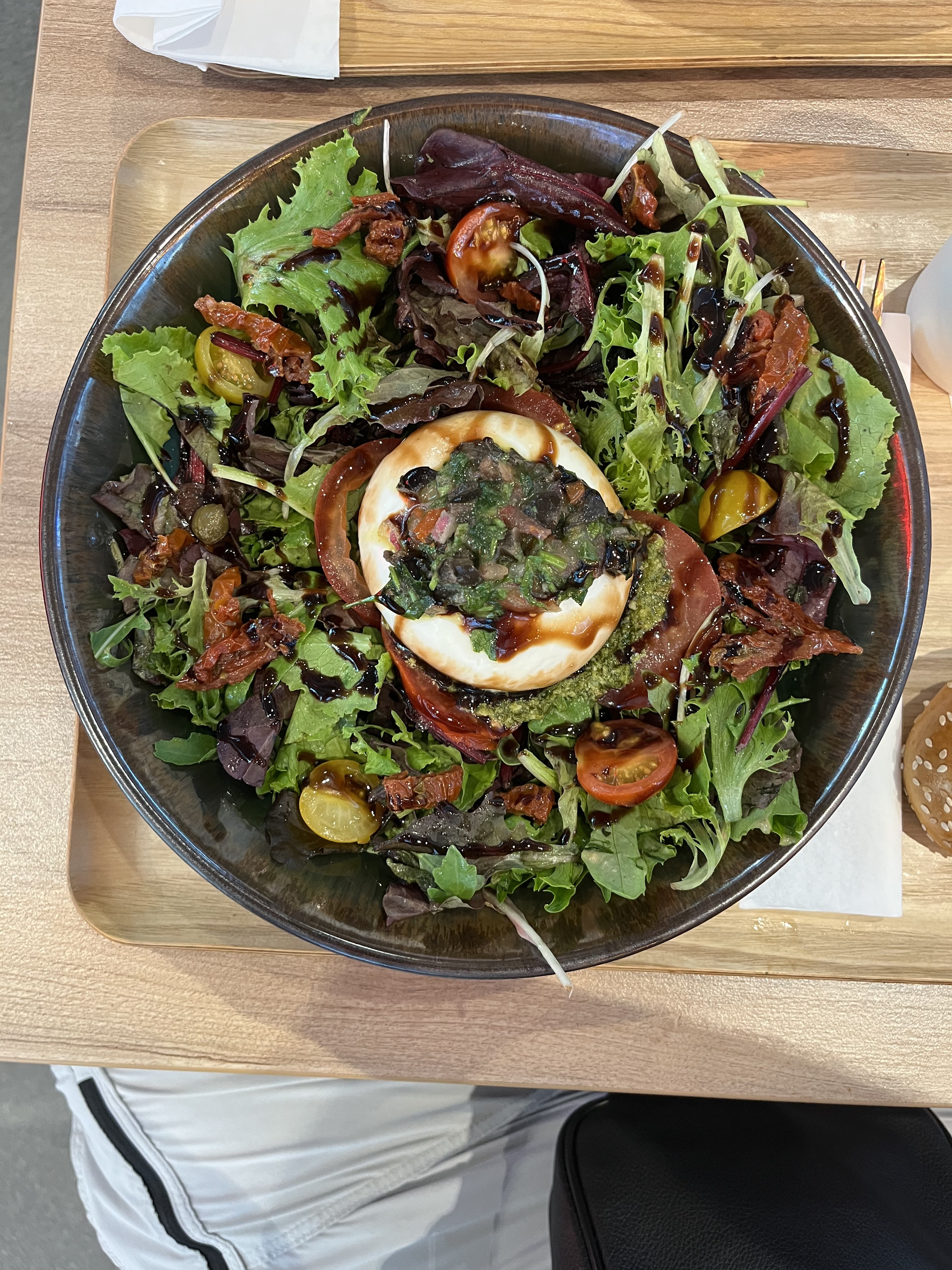J'ai pris la burrata, bah c'était bourré... de feuilles de salade ! C'est vendu comme une burrata avec des tomates, c'est surtout une salade verte avec une burrata et quelques tomates. Après la burrata était assez bonne et crémeuse mais vraiment trop de salade... et 14,95€ ça ! La marge est folle parce que moi j'achète ma (bonne) burrata 3€ et la salade et les tomates c'est pas aussi cher, sachant qu'en tant que restaurateur ils ont forcément des prix plus avantageux car ils achètent en gros. C'est pas croyable de vendre ça plus de 8€. Vous allez me dire ouais bah t'as qu'à la faire toi même ta salade burrata. Euh bah déjà j'ai le droit de vouloir manger ça dehors. Le pain qui accompagne c'est un pain brioché, ça n'a rien à faire avec une salade ça, c'est sucré ça va pas. Il serait aussi bien d'avoir du sel et du poivre sur les tables... J'ai aussi pris des pommes grenaille, elles étaient bonnes Le service était assez long quand même. Mon ami a pris un smash burger avec des frites, il a trouvé ça bon mais pour le prix il a dit qu'il y a pas assez de frites.