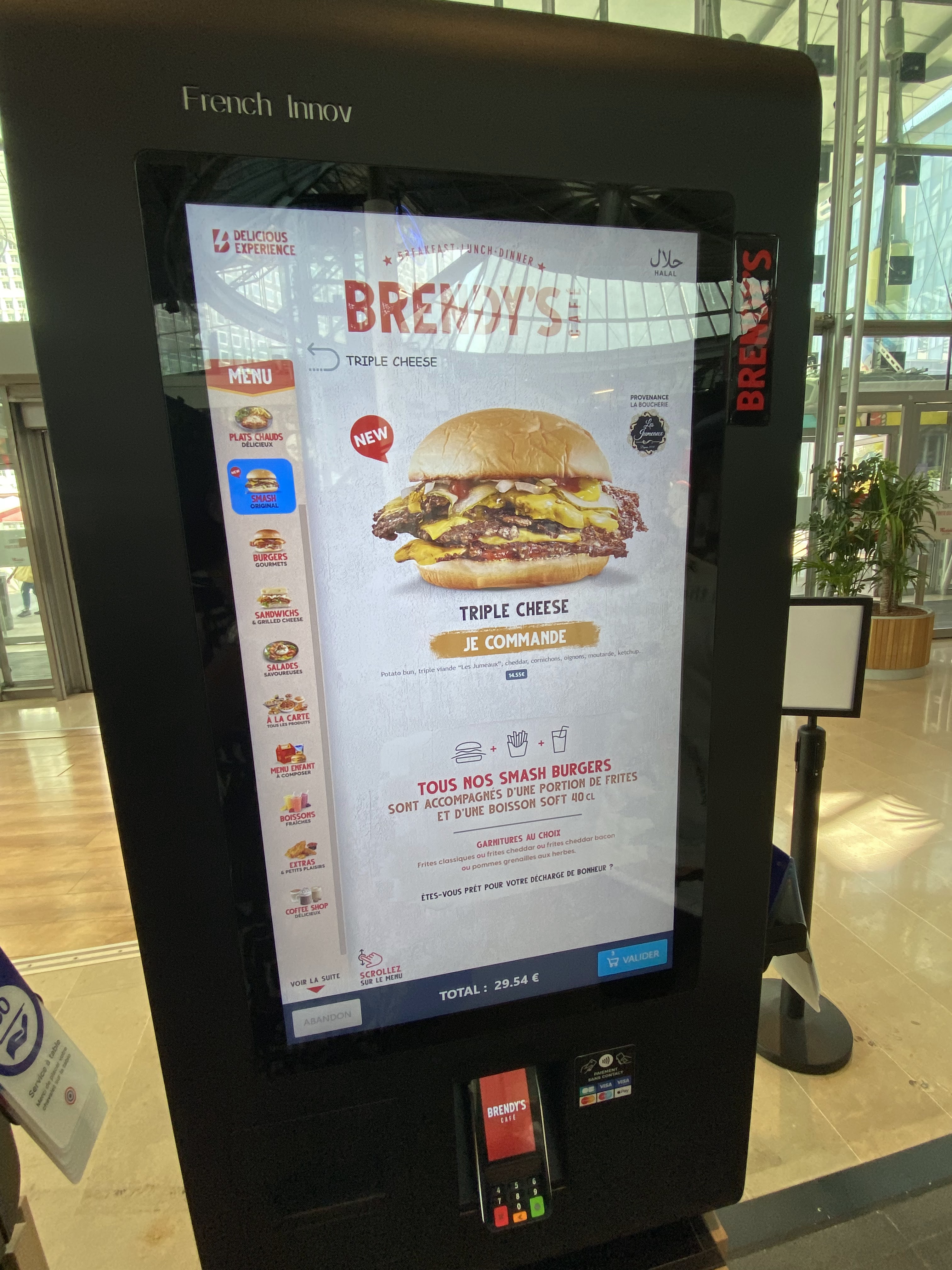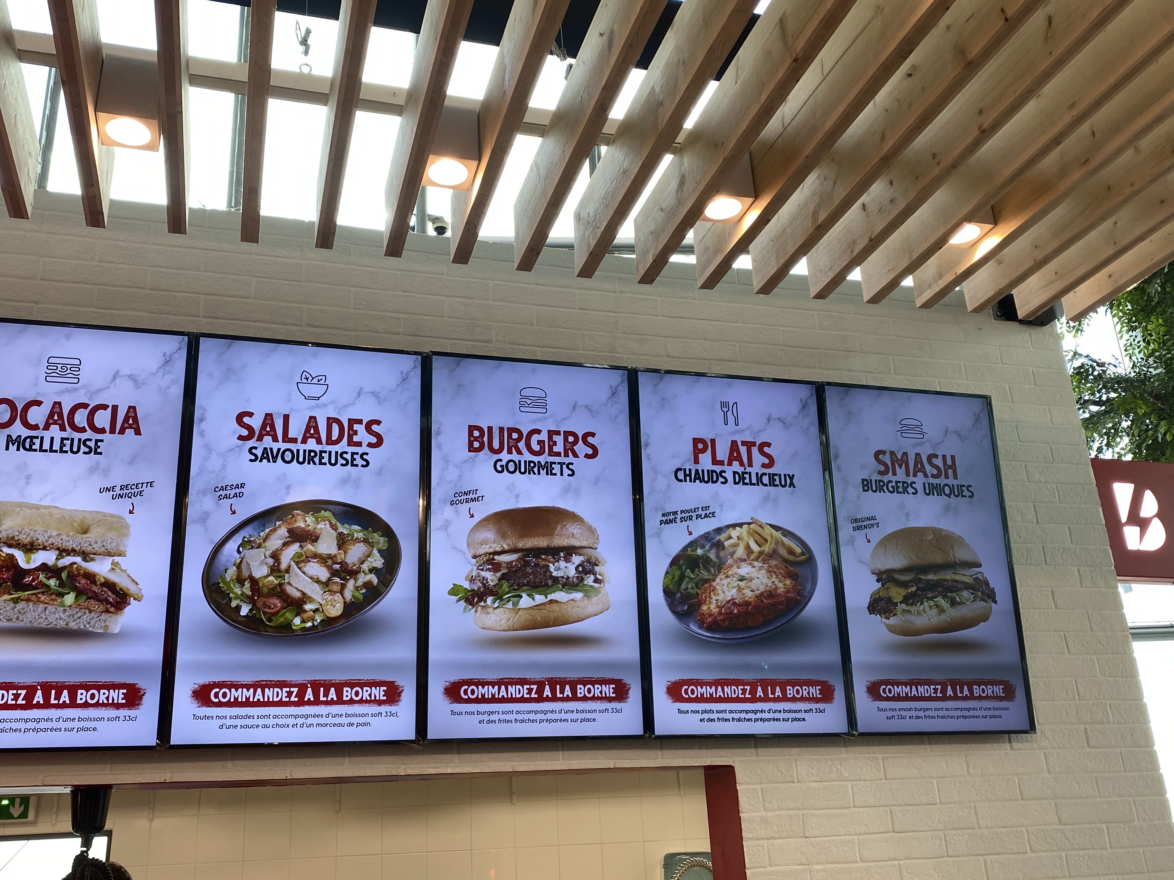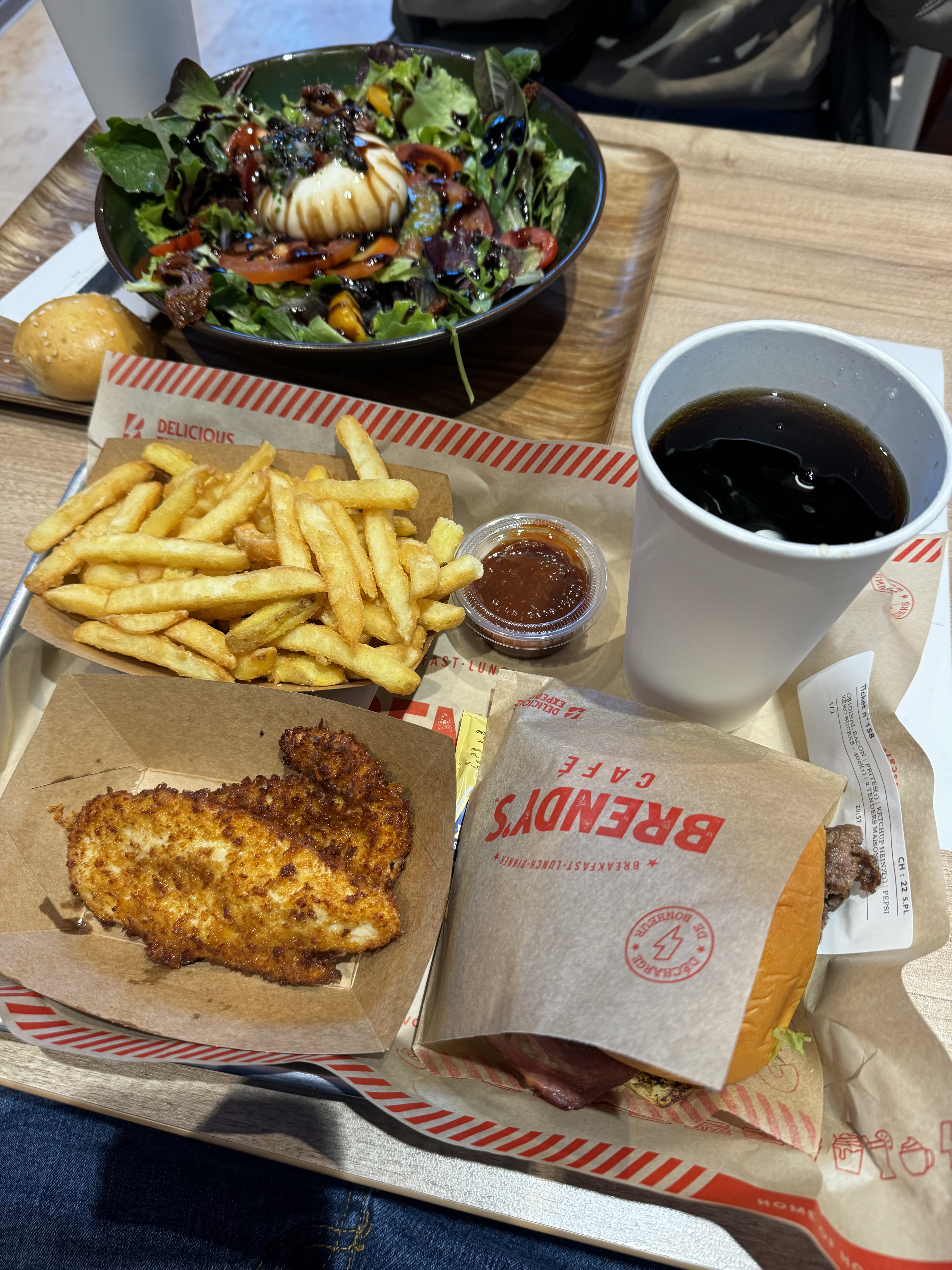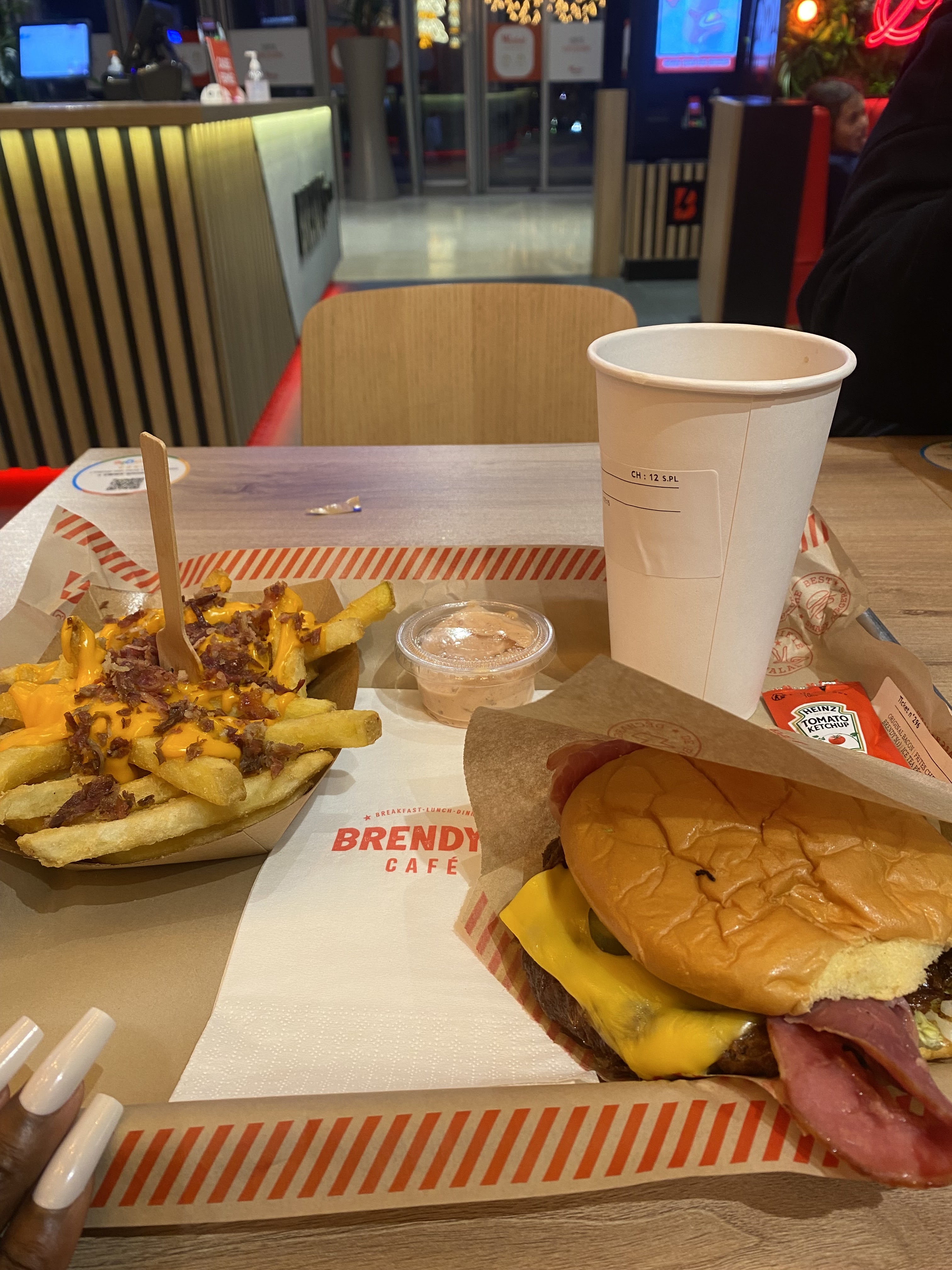 Brendys café la defense centre commercial les 4 temps le restaurant se trouve au niveau des restaurants pres du cinema a coté de sushi shop et de starbucks L’accueil est parfait il y a des serveurs qui sont disponible si on a besoin d aide au borne pour commander. On commande via les bornes puis on mange sur place ou a emporter il y a du choix burger viande poison poulet , smach burger, plat , sanwich, petit dejeuner gouter vous avez enormement de choix peu importe votre envie petite faim ou grosse faim En manger sur place on commande on s assoie et un serveur nous amène notre repas a notre table L’accueil est parfait et le service est rapide Les burgers sont tres bon vraiment fondant de meme que les frites avec cheddar delicieux Et leur tenders excellent rien a dire Dommage qu il y ai pas un menu qu avec des tenders par 6 par exemple. Actuellent disponible que par 2 tenders a l’achat et hors menu. On c est regalé de loin meilleurs que mac donalds burger king et kfc C est meme incomparable avec la concurrence brendys et de tres loin bien meilleur que tous, de vrai burger a l’américaine