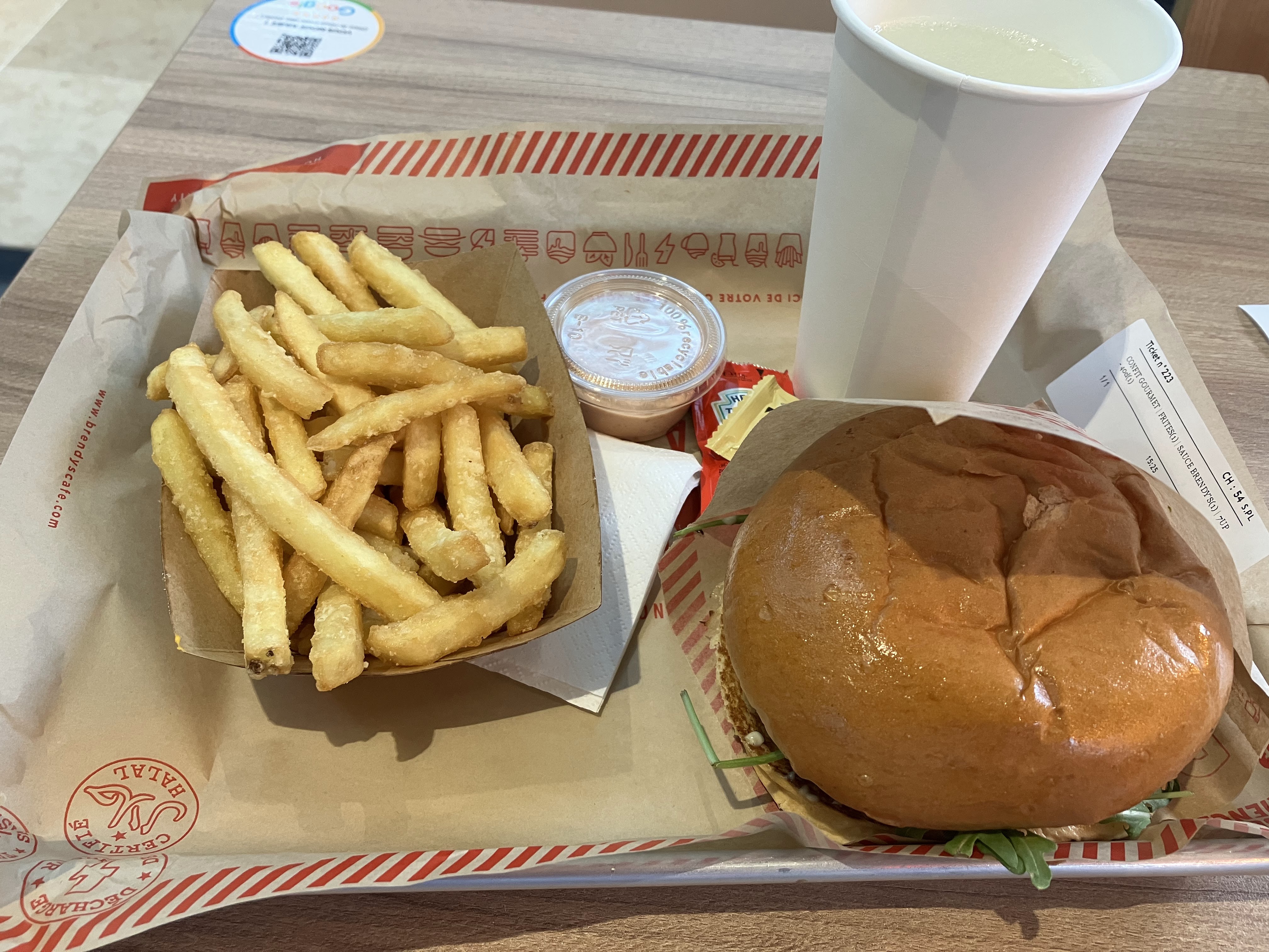 J’ai pris le Burger gourmet confit, 15€ avec frites et boissons. C’est bon et le service est rapide ! (C’est halal) Les serveuses ont même fait le tour des tables pour proposer des bonbons et des serviettes lave main
