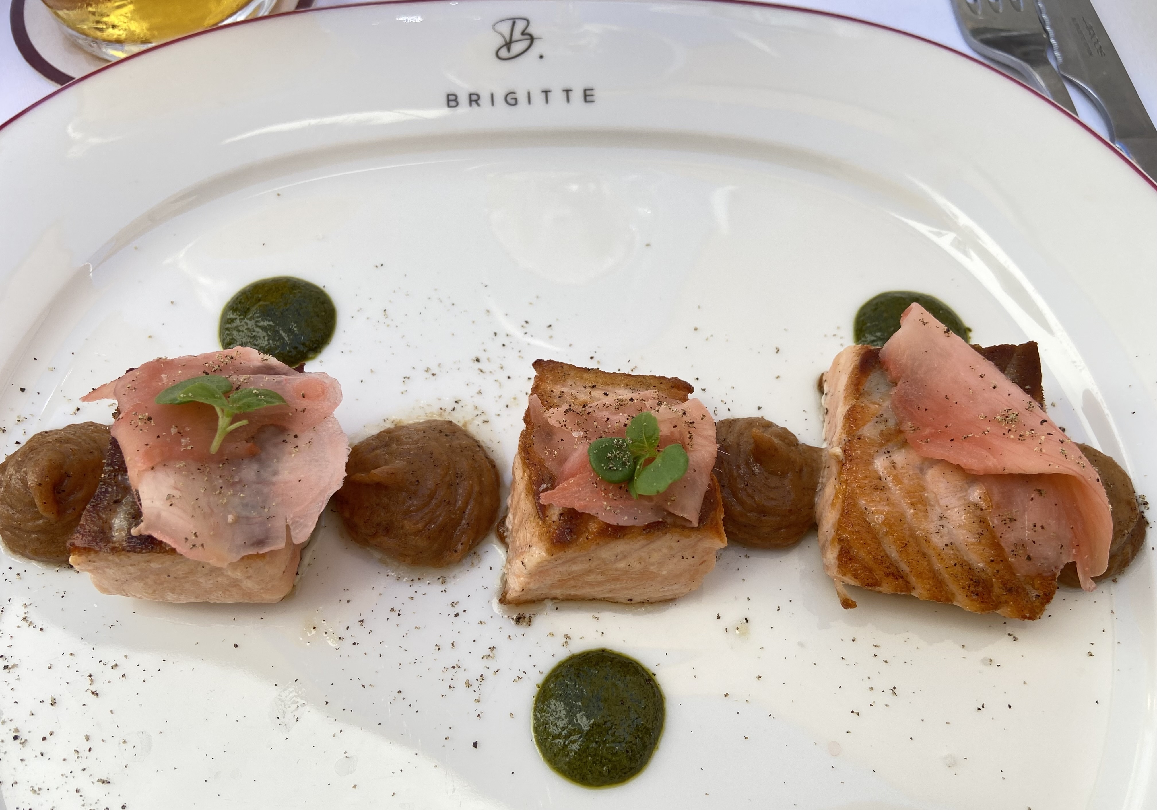 Très heureusement surpris par le Brigitte, qui fait bien vite oublier la Croisette. Tout y est impeccable, une carte au look classique mais avec bien des pépites, un cadre complètement rénové, bon chic et détente, et un personnel quasi tout neuf et pourtant stylé, professionnel, à l’écoute, sans être ni guindé, ni omniprésent. Une belle nouveauté qui a tout pour devenir un must à La Baule.
