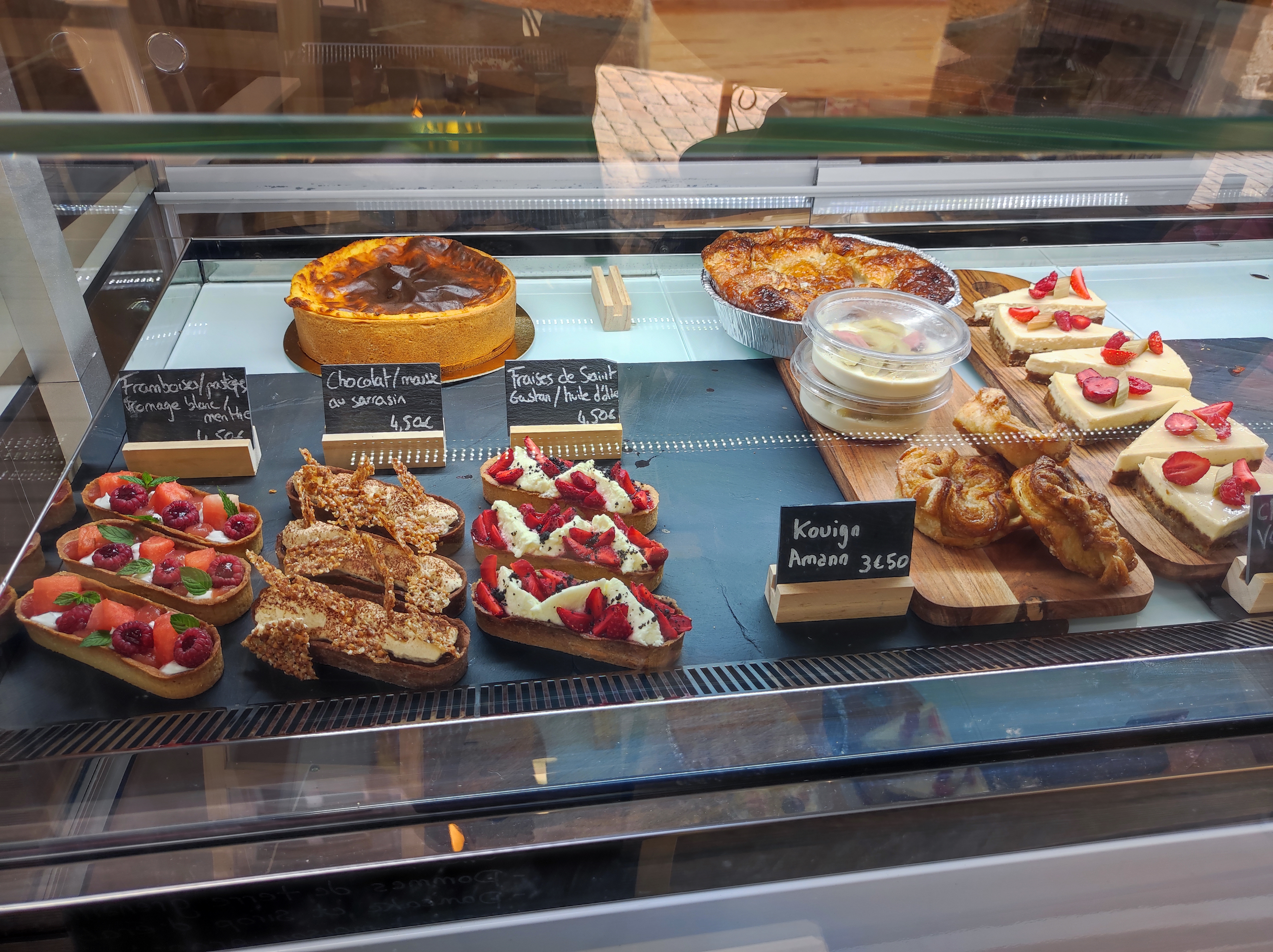 Salon de thé à l'écart des rues touristiques bondées. Mini terrasse bien agréable. Glaces maison aux parfums insolites. Nous avons essayé le sorbet citron/vanille et la glace confiture de lait (il y avait aussi surreau, etc...). Très bons. Ils proposent aussi des pâtisseries sucrées et salées qui ont l'air vraiment excellentes (voir photos). Si elles sont aussi bonnes que jolies, je dis miam!!!