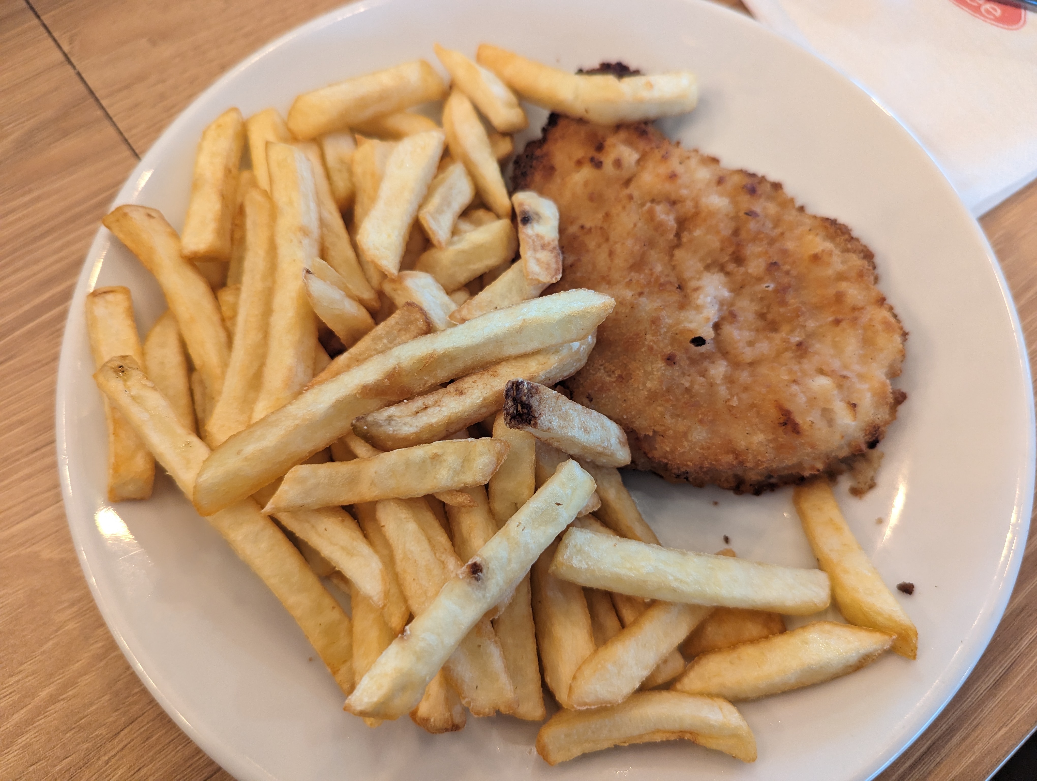 Frites sèches immangeable. Au point que ma fille de 10 ans m'a demandé si elles étaient à base de pomme de terre. 🤔😮 Pas de cheeseburger dispo un dimanche a midi 😮 Le poulet est OK.