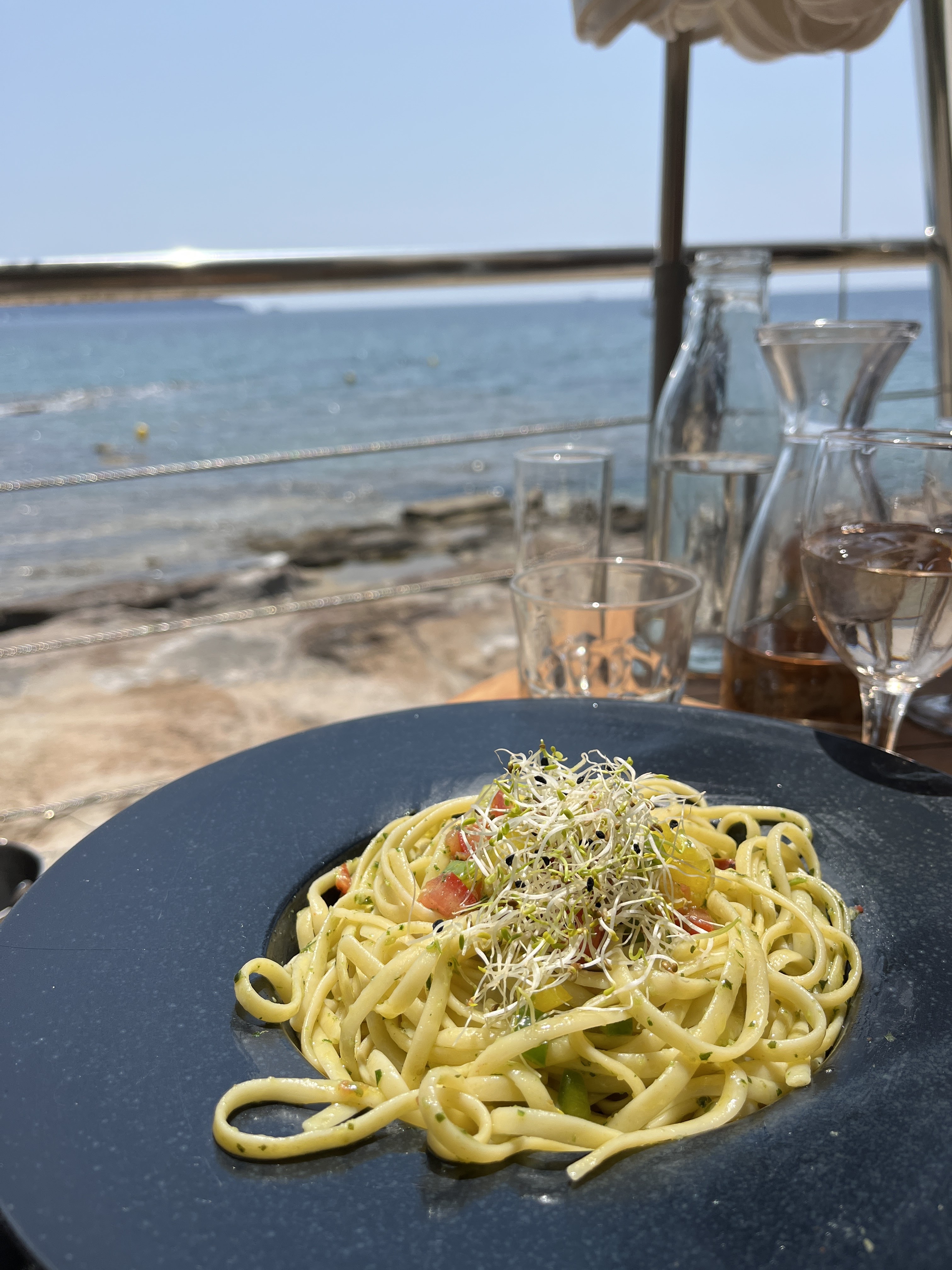 Heureusement que la vue est incroyablement jolie pour faire passer la note et la cuisine très moyenne. Ce n'est pas digne de la prétention du lieu et du prix. C'est dommage. Rosé servie chaud, pâte pâteuse et seulement un filet de poisson pour un bord de mer c'est pauvre. Doit mieux faire.