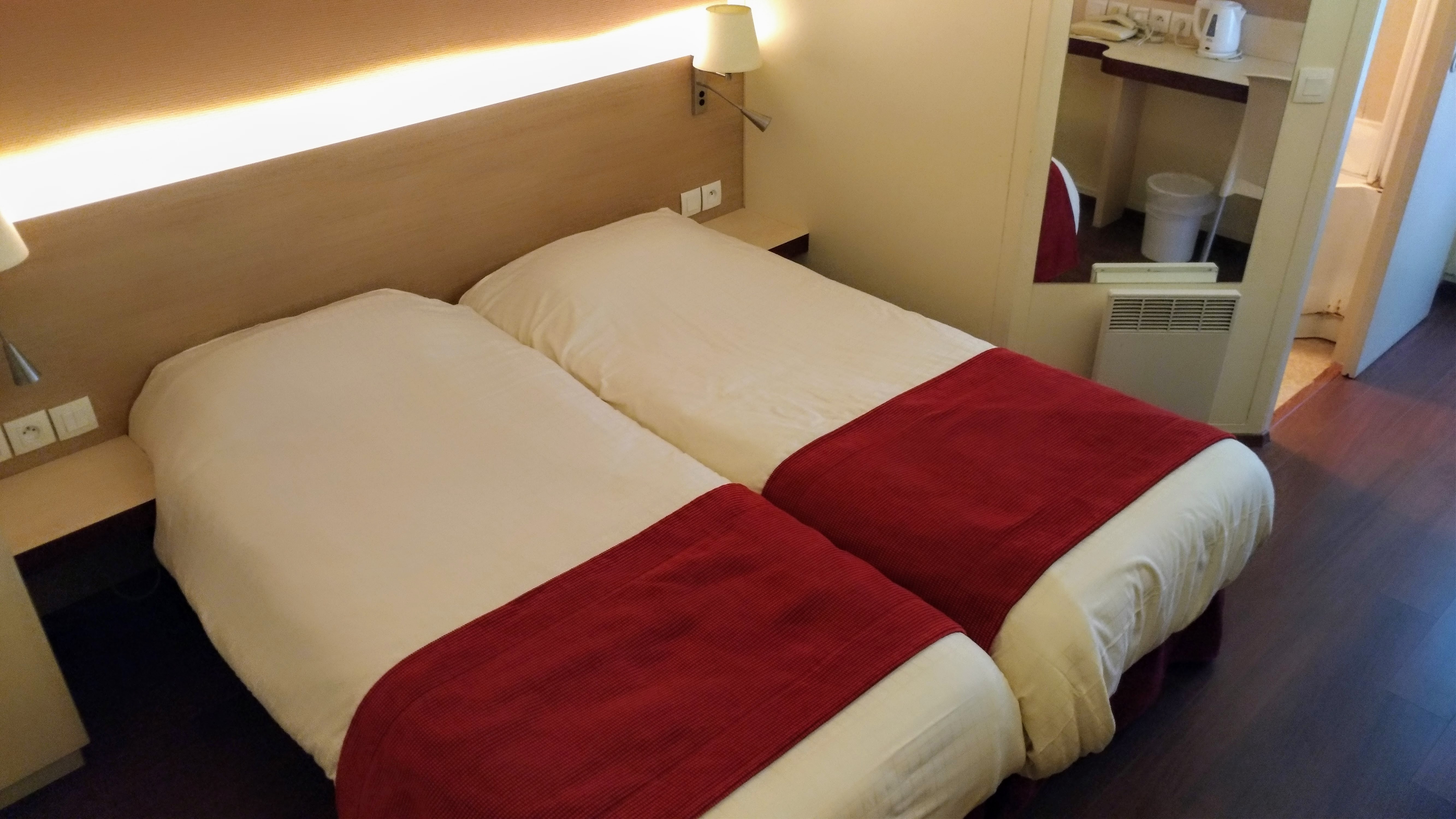 La chambre est toute petite et pour le prix de la nuit c'est juste inadmissible. Quand on rentre ça sent les toilettes dans toute la chambre. Sur le mur de gauche; un trou avec une feuille pour le cacher expliquant que le trou va être réparé. Sur le mur de droite des grandes traces noires. Les draps étaient tachés, le savon pour les mains avaient une tâche qui semblait être une sauce qui aurait séché. La douche était loin d'être propre, la télévision ne fonctionnait pas et en arrivant personne ne nous a fourni de code WiFi qui était pourtant inclus dans le prix de la chambre. De plus, ma belle-mère a dû annuler la chambre en premier lieu puis nous avons finalement pu la réserver pour un autre soir. Quand ma belle-mère a appelé pour annuler, la personne qu'elle a eu au téléphone l'a simplement engueulé parce que ça lui faisait du travail en plus de devoir annuler et faire un remboursement... ah et les murs tellement fins qu'on entends les voisins ronfler comme si ils étaient dans notre chambre... le prix du petit déjeuner on en parle même pas, j'espère qu'il y a du caviar à ce prix là. C'était une nuit horrible et je ne suis pas près de remettre les pieds là-bas. Tout ça pour 88 euros la nuit, c'est juste une honte surtout pour un soi disant 3 étoiles !!!