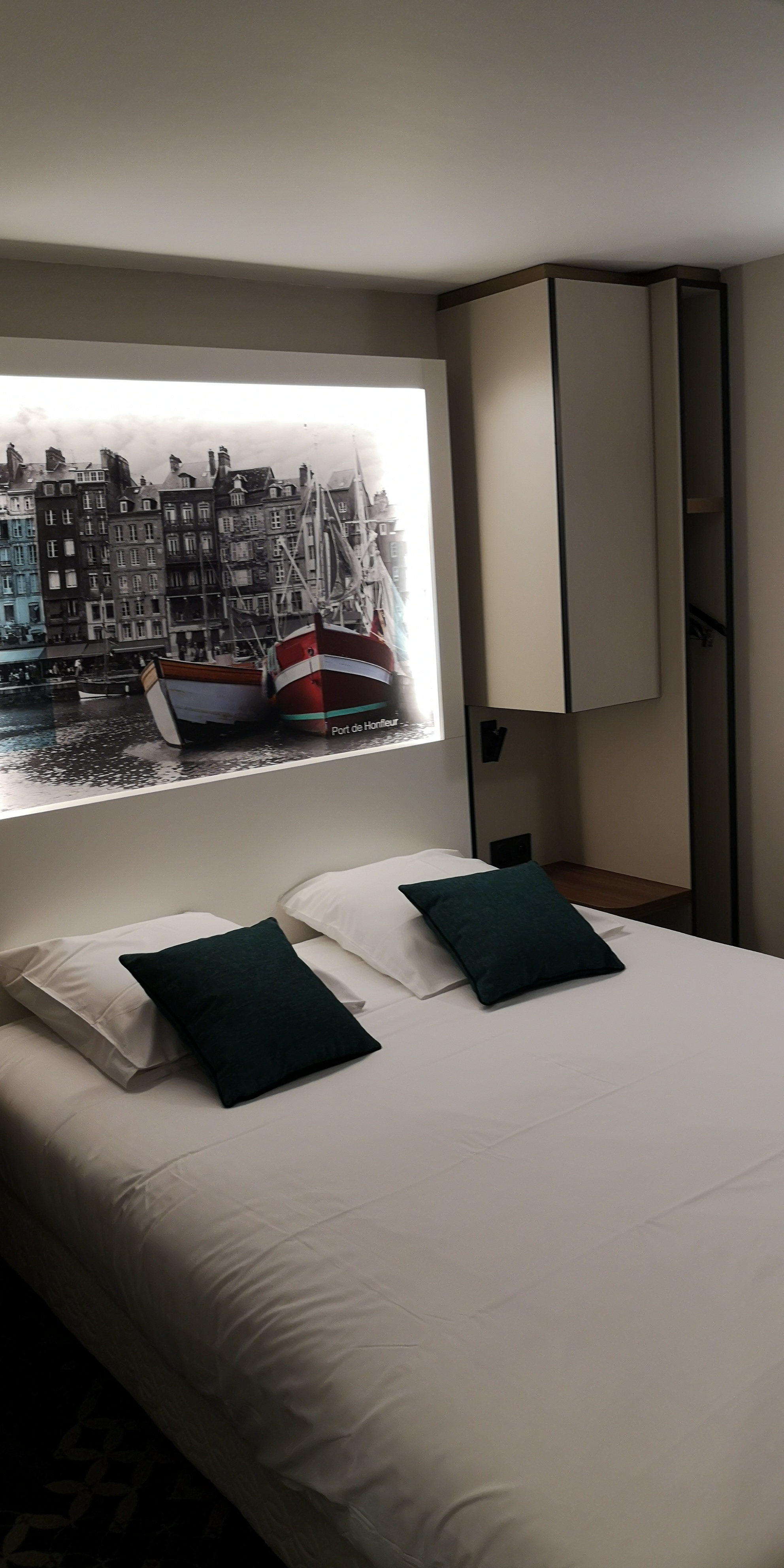 Très grande chambre, avec 5 couchages !!! Propreté irréporchable. Restaurant aux couleurs normandes, très bon, servi rapidement.