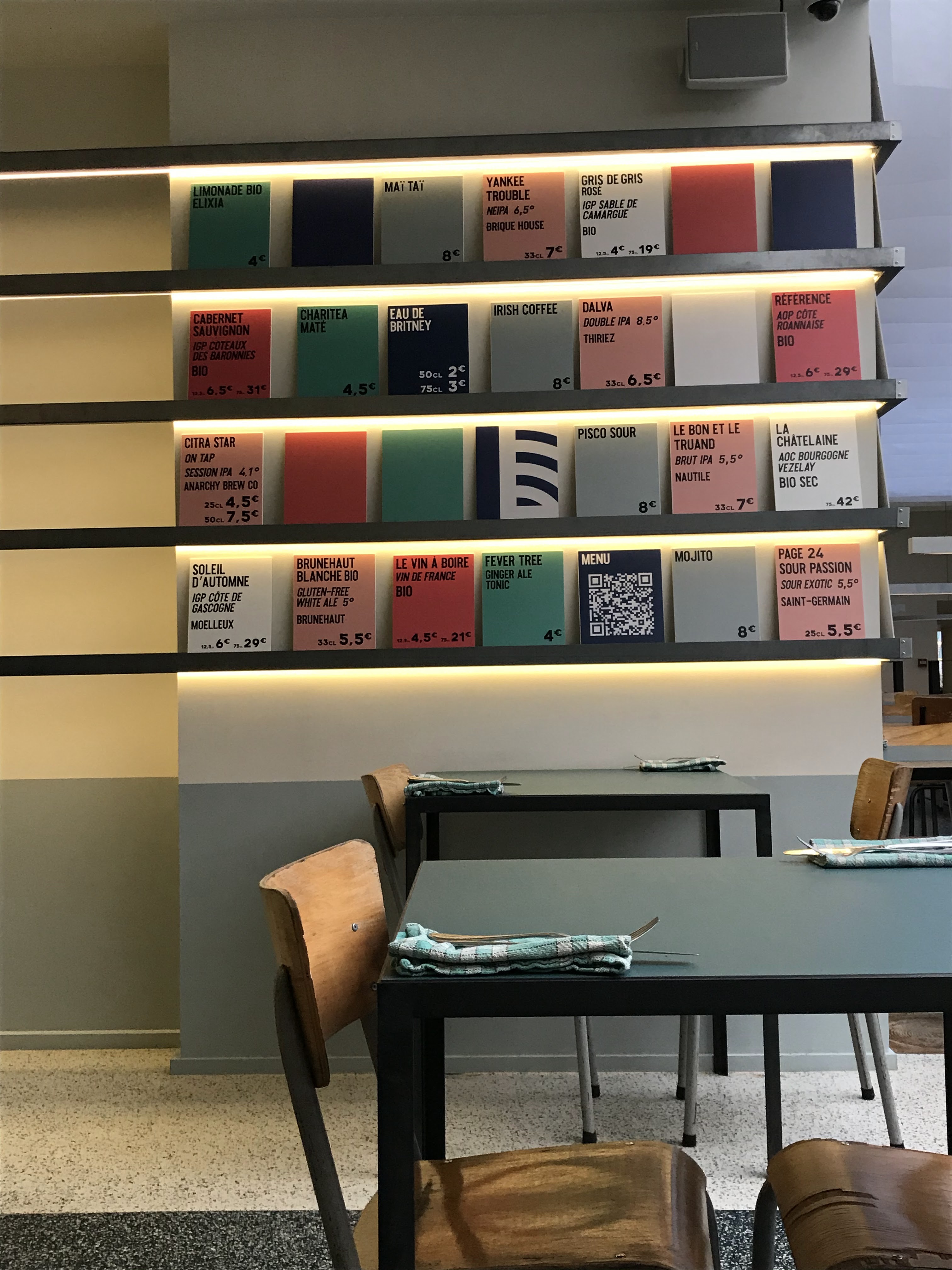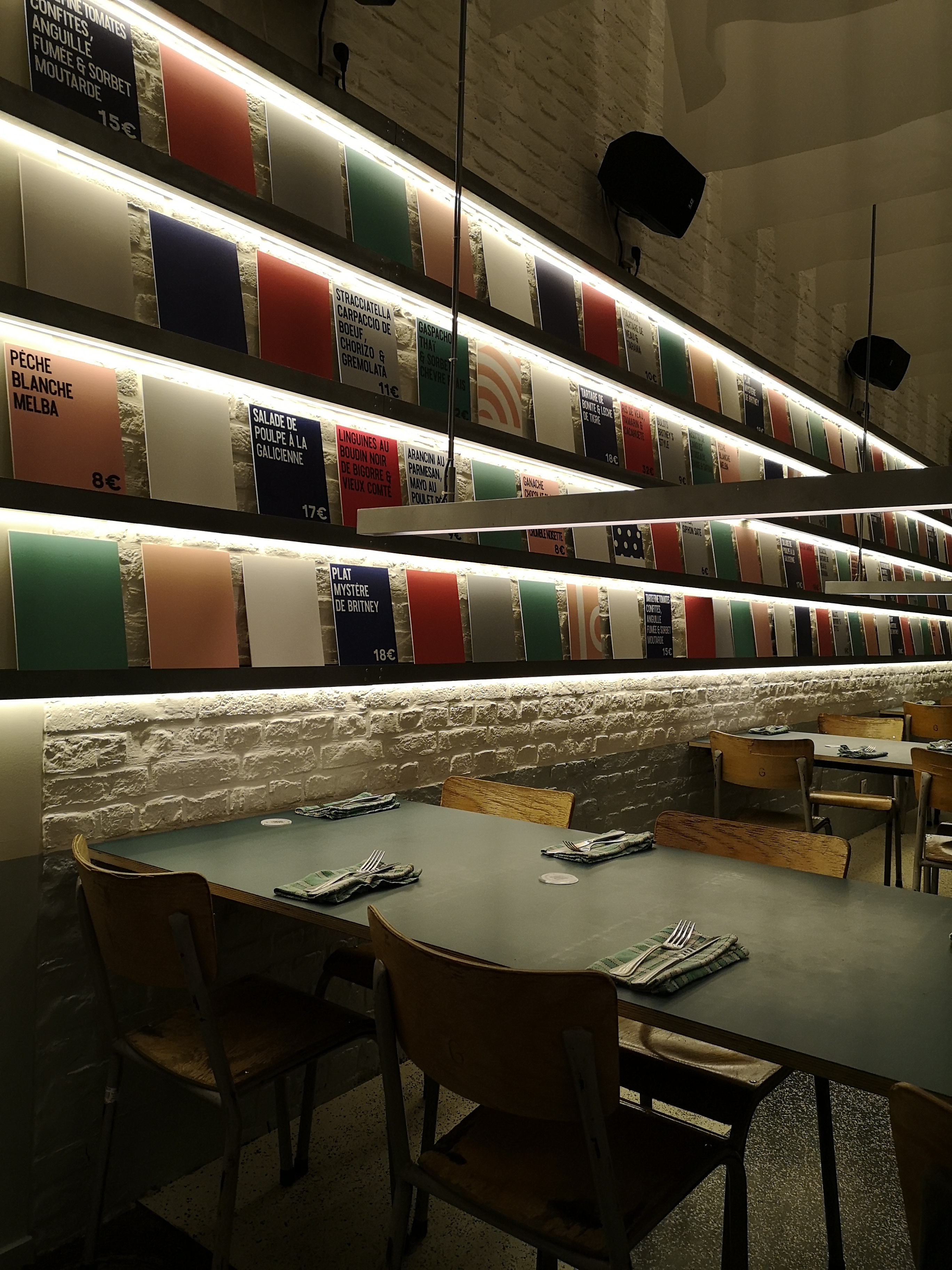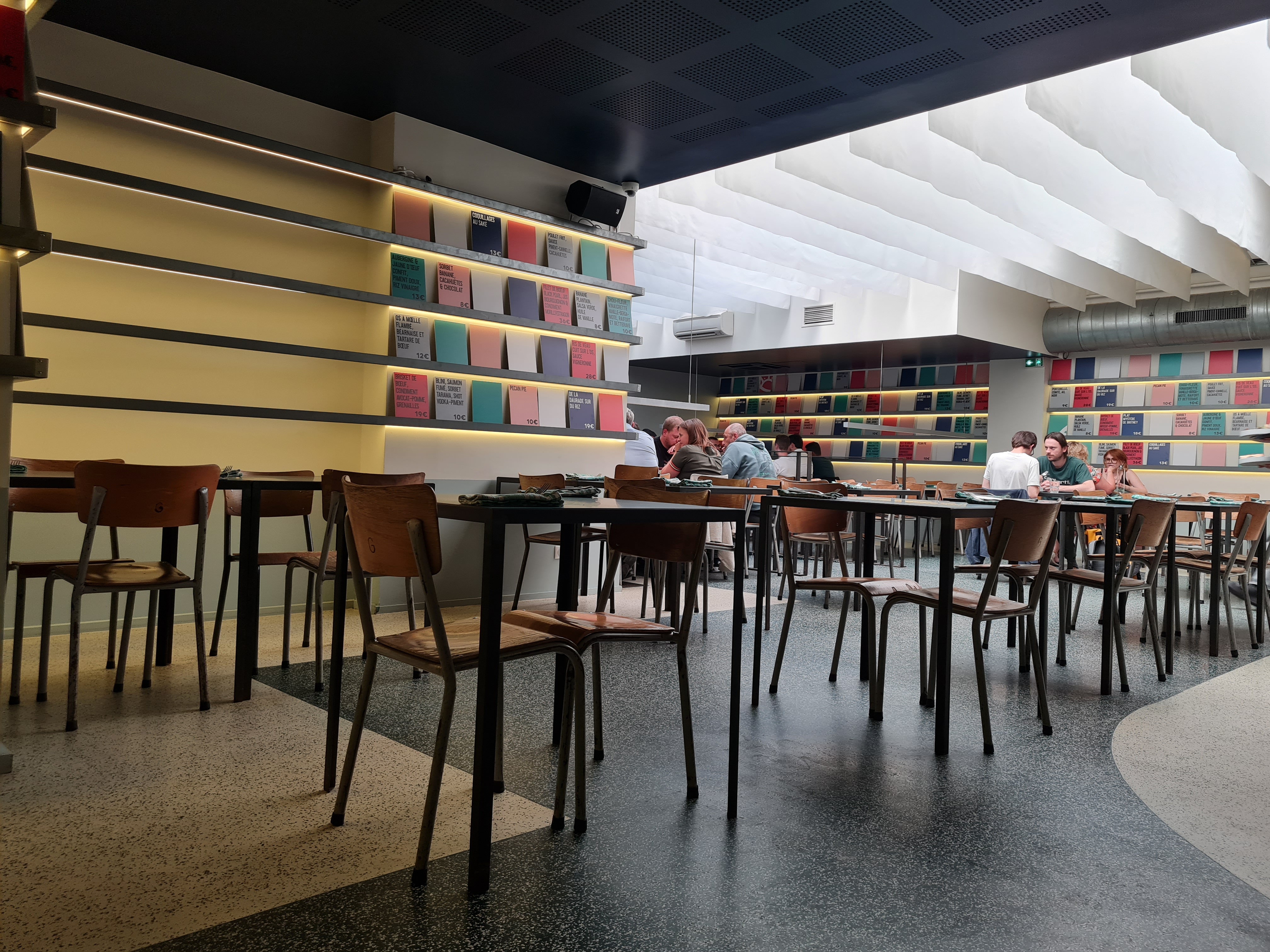 Restaurant branché dans un décor de grande cantine revisitée avec des plats de grande qualité avec de bons produits, possibilité de prendre à partager. Les choix (de 10 à 30 euros) sont affichés sur des cartons de couleurs (rouge pour la viande, bleu pour le poisson, vert pour le végétarien, gris à partager) qui bordent les longs murs du restaurant. La cuisine est audacieuse et associe des saveurs originales, inspirés de cuisine asiatique, africaine, européenne. Malheureusement la musique est trop forte et le lieu trop bruyant pour apprécier les plats à leur juste valeur.