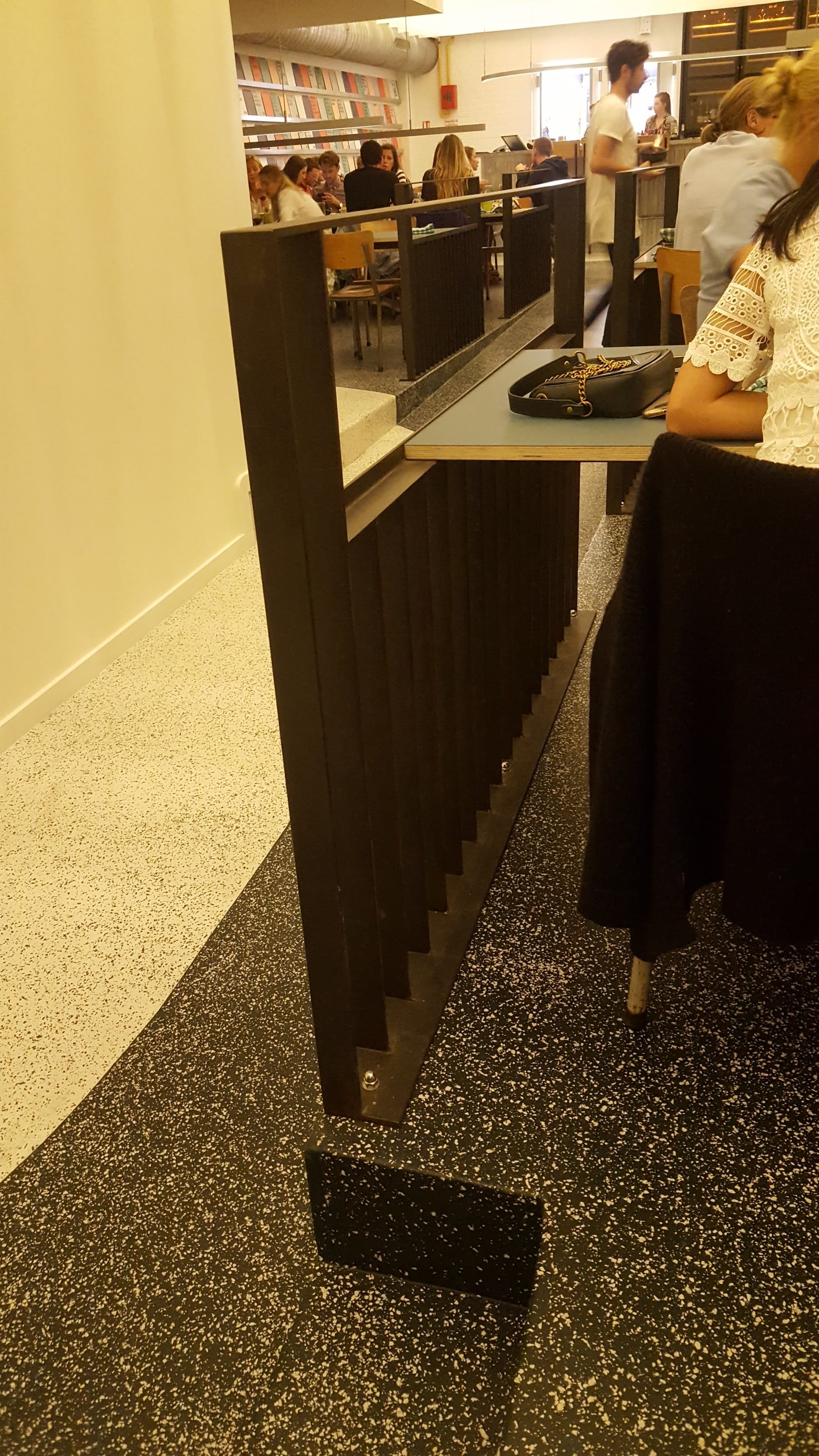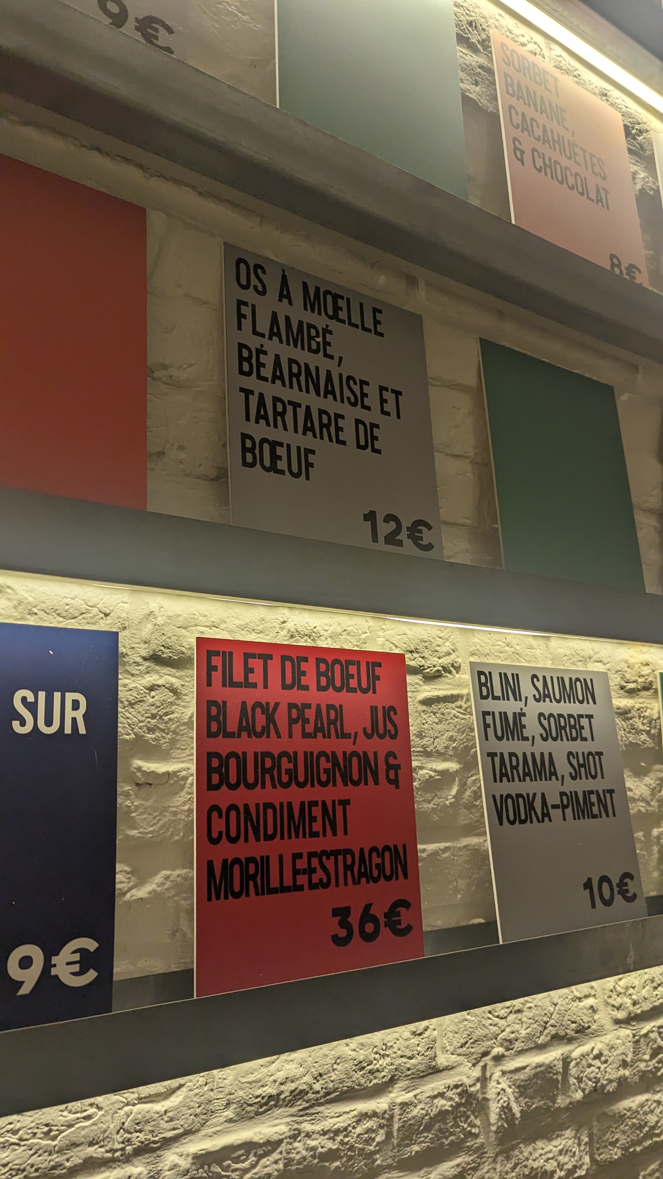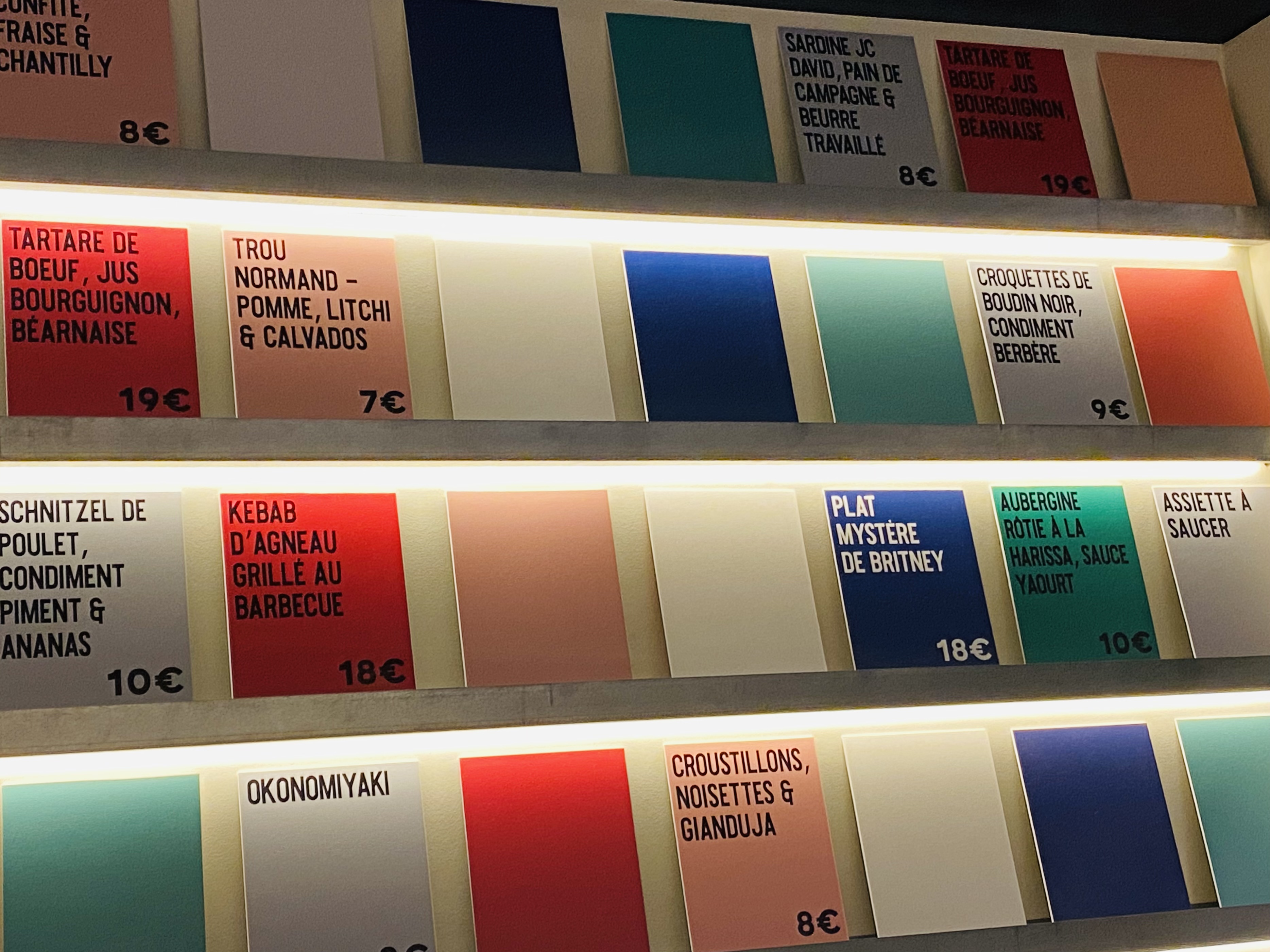 Restaurant branché dans un décor de grande cantine revisitée avec des plats de grande qualité avec de bons produits, possibilité de prendre à partager. Les choix (de 10 à 30 euros) sont affichés sur des cartons de couleurs (rouge pour la viande, bleu pour le poisson, vert pour le végétarien, gris à partager) qui bordent les longs murs du restaurant. La cuisine est audacieuse et associe des saveurs originales, inspirés de cuisine asiatique, africaine, européenne. Malheureusement la musique est trop forte et le lieu trop bruyant pour apprécier les plats à leur juste valeur.