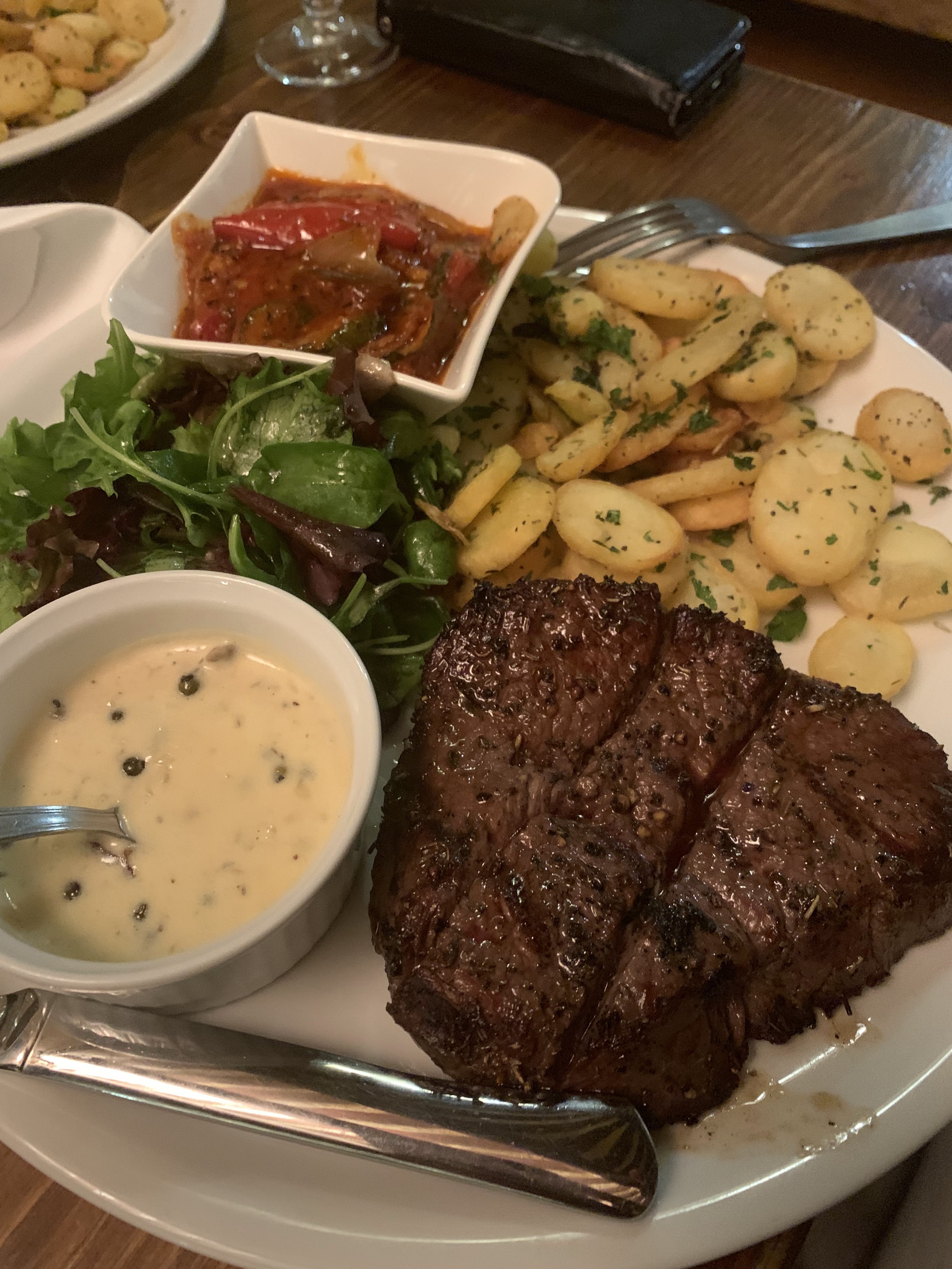 Nous avons mangé le gros steak que vous partagez. Nous étions tellement contents et tellement rassasiés. Nous avons tellement aimé le vin rouge de la maison que nous avons acheté une bouteille supplémentaire à emporter !