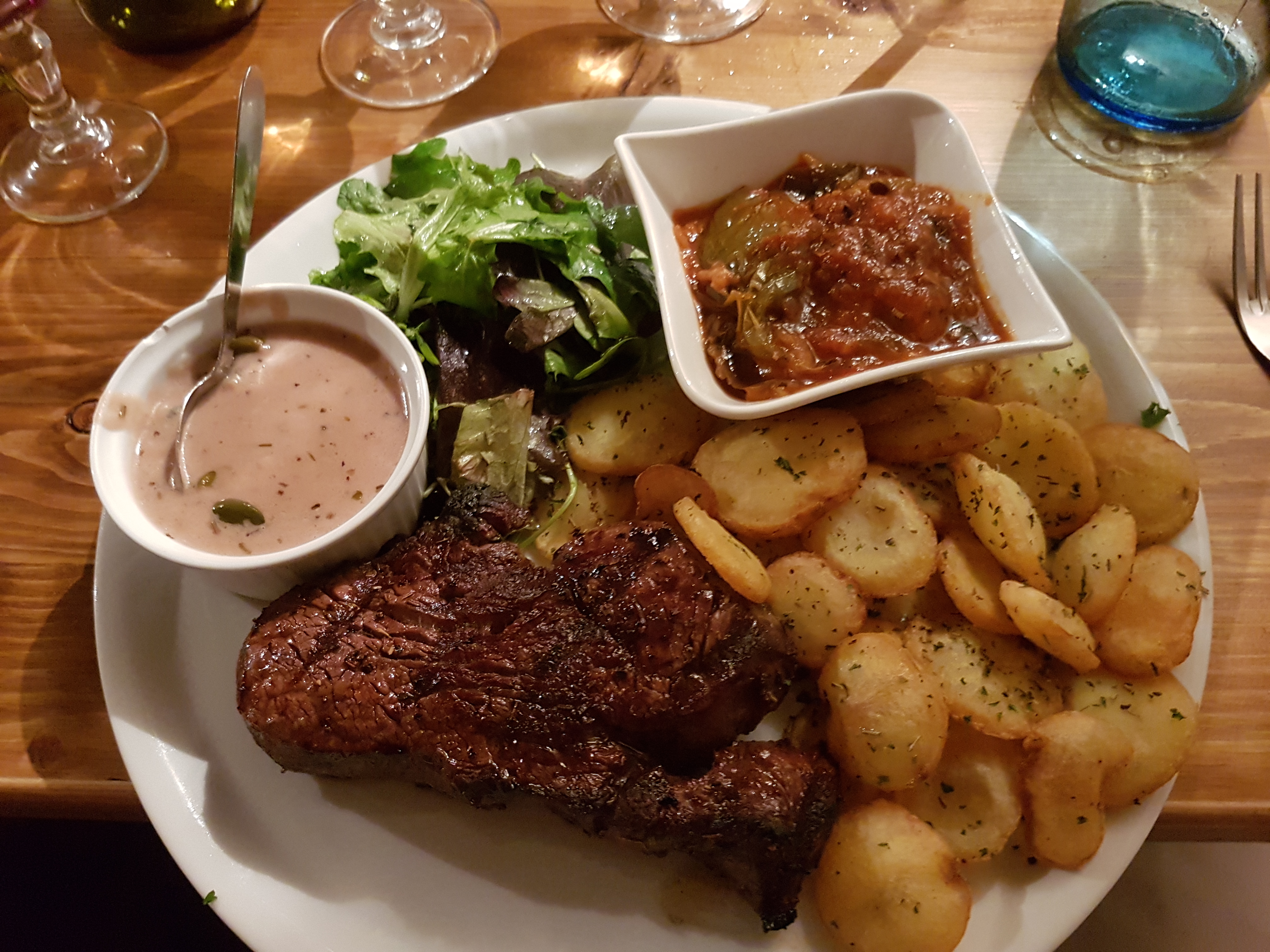 Le steak de filet était parfaitement cuit et le feu créait une belle écorce à l'extérieur. Bon rapport qualité prix et vin de table pas cher aussi