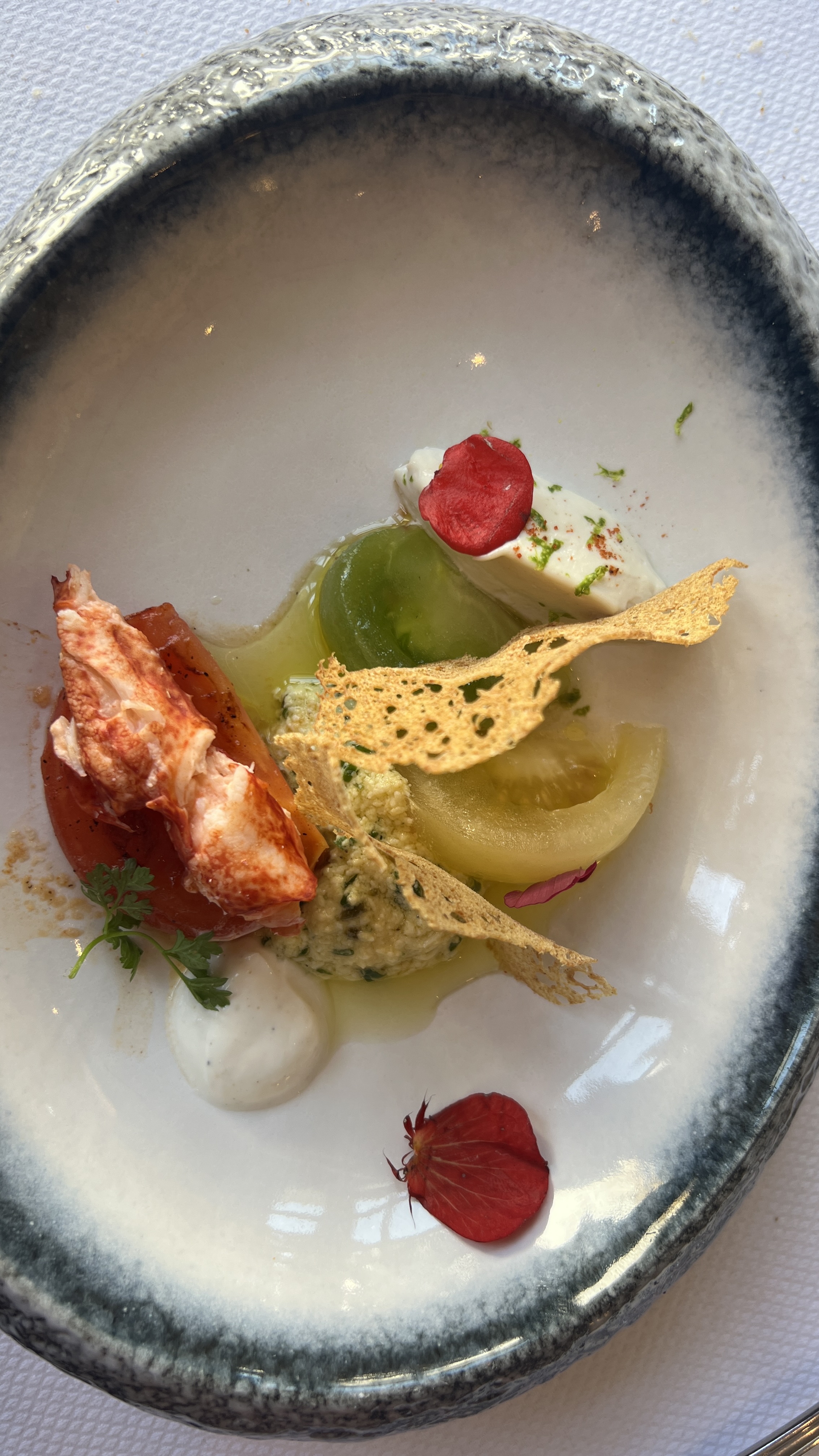 Belle décoration de la salle et présentation des assiettes soignées. Pour le reste, il y a du boulot. Nous avons pris le menu homard « signature », qui est en fait la même chose que le menu normal, sauf qu’ils ajoutent des morceaux de homard. Côté saveurs, la première entrée était trop sucrée, la suivante trop salée, le fenouil du plat trop cuit, la pince du homard servie sans avoir enlevé le coagulât. Deux serveuses discrètes et sympa, mais la chef de salle est hautaine, prétentieuse et de mauvaise foi. Non, le carafage n’est pas réservé aux vins rouges comme elle nous l’a soutenu, par contre carafer au dernier moment est inutile, il aurait fallu le faire quand on l’a demandé, bref, on a laissé tomber le carafage, non sans échanges tendus avec cette jeune fille très désagréable. Les deux bouteilles de vin blanc étaient tièdes. Les millésimes ne sont pas indiqués sur la carte. À 75€ le menu et tant de chichis, vraiment décevant. Au vu des réponses de la direction aux commentaires négatifs passés, plutôt que de continuer à répondre ici de façon insultante, peut-être faudrait-il se remettre un peu en question.