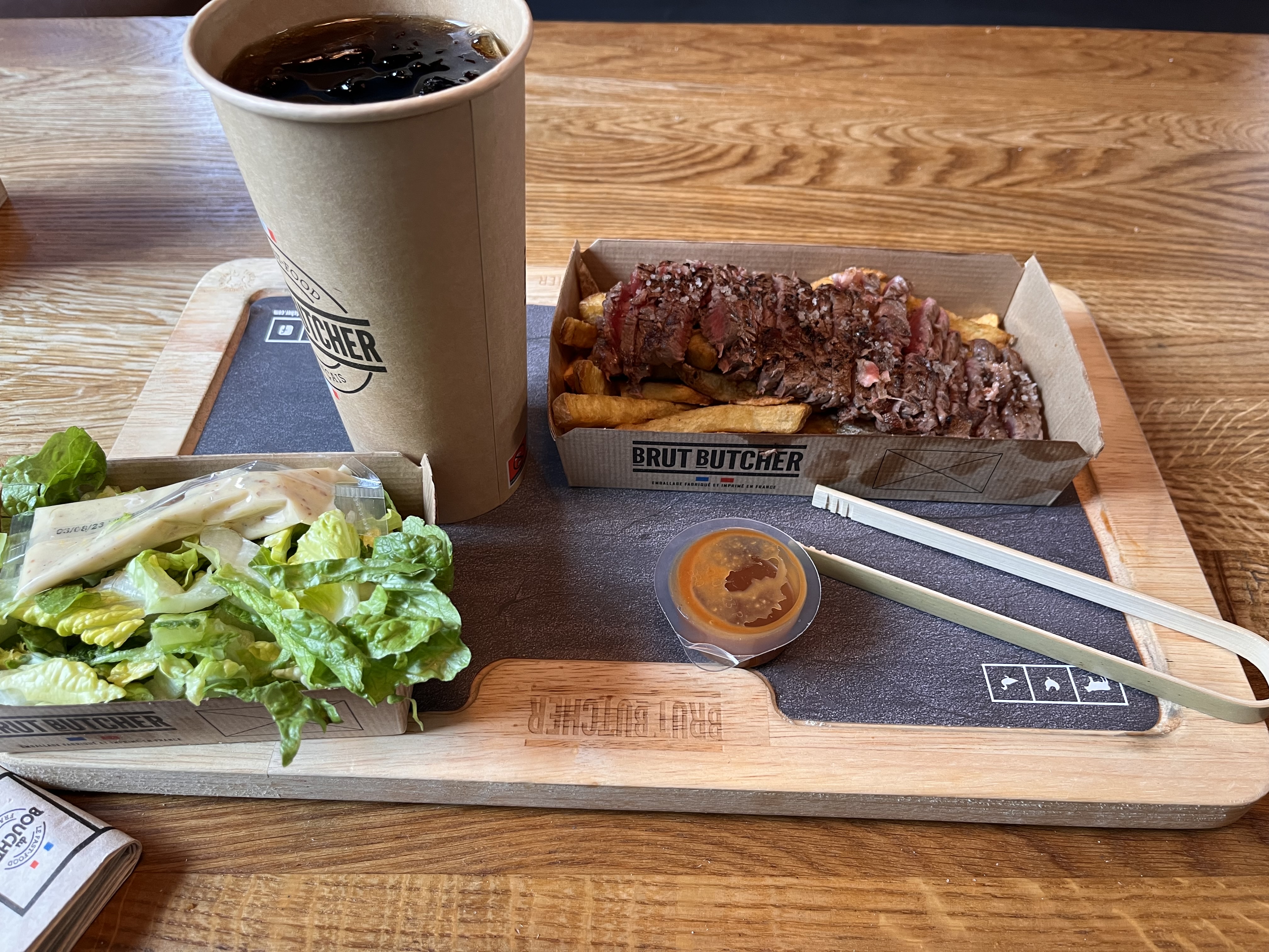 Ma compagne voulait manger des ribs. Elle a choisi votre restaurant. Entrée dans le restaurant, des bornes de commande. Ça jete un froid.... Pas de menu. Très peu de choix, car beaucoup de produits indisponibles. Heureusement, il y avait des ribs. Ouf ! Pour moi, végétarien ( pour des raisons de santé). le sandwich à compose, ben ...... j'avais droit qu'à de l'oignon et cornichon, le fromage et le steak. Le reste, indisponible pour 15€. Bof , j'ai pas pris. Du coup, salade, pomme de terre grenaille, jus de pomme et yaourt. Menu hôpital, quoi. Ribs correct. Frites maison inmangeables : molles, non saisies, farineuses. Pareil pour les grenailles. c'est tout parti à la poubelle. (C'est du sous vide mal préparé) Le coca de madame inbuvable. Elle a commandé un normal, un avec édulcorants servi. Erreur. Poubelle. Le jus de pomme yuzu : je connaissais pas. Allergique aux agrumes (je ne savais pas que le yuzu est un agrume). Poubelle. J'ai mangé ma salade sans sauce avec les doigts. Les pincettes comme couvert, pas pratique pour manger une salade. Lol. La vinaigrette industrielle, non merci. direct poubelle. Pas de soucis avec le personnel car on choisi sa place et on la débarrasse nous même. Très peu d'échange verbal. Nous aurions pu faire des réclamations, mais nous avons préféré abreger. Bref, sorti avec faim et soif. Mauvaise expérience. Désolé, mais il fallait que je le dise.