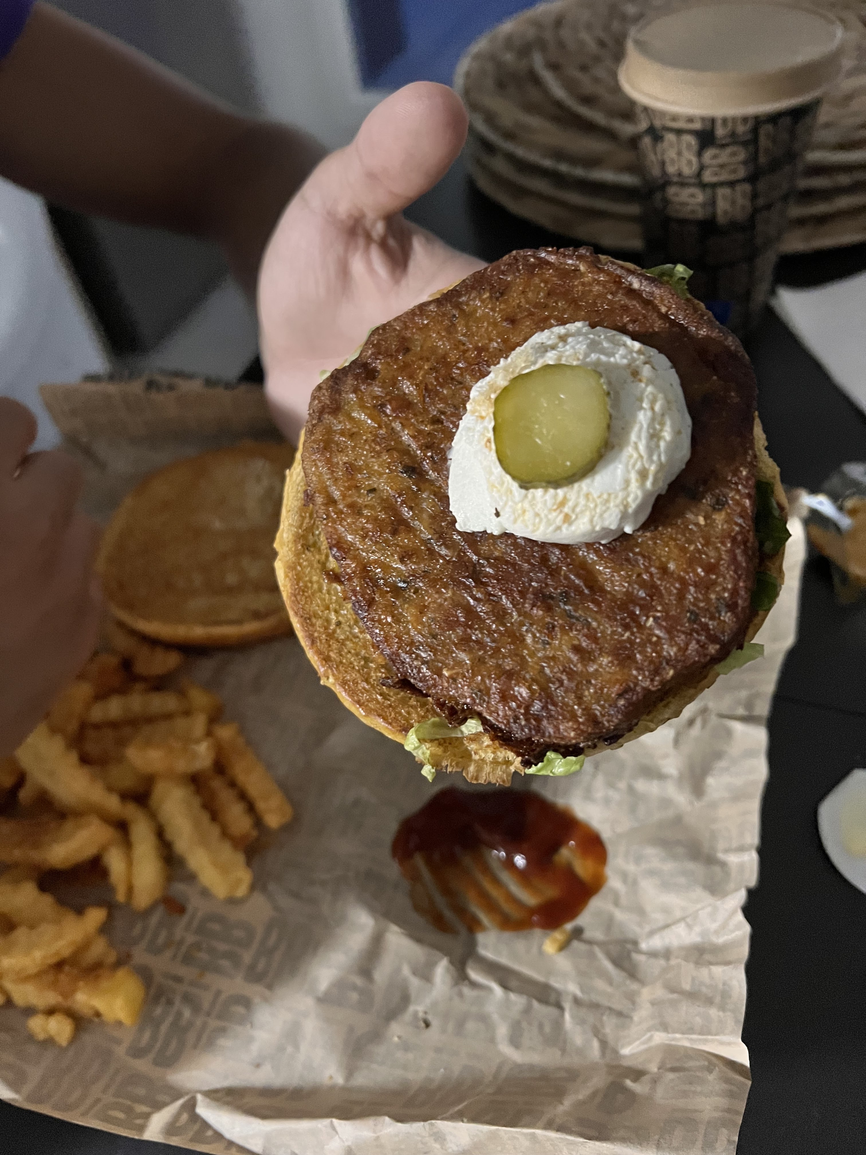 Un peu de concurrence aux grosse marques de fast food, ça ne fait pas de mal... Sandwich mangé un peu sec , manque de sauce. Les frites sont bonnes, bien croustillante et la portion généreuse. Un peu plus de sauce dans le sandwich et ce sera 4 étoiles si j'ai l'occasion d'y retourner.