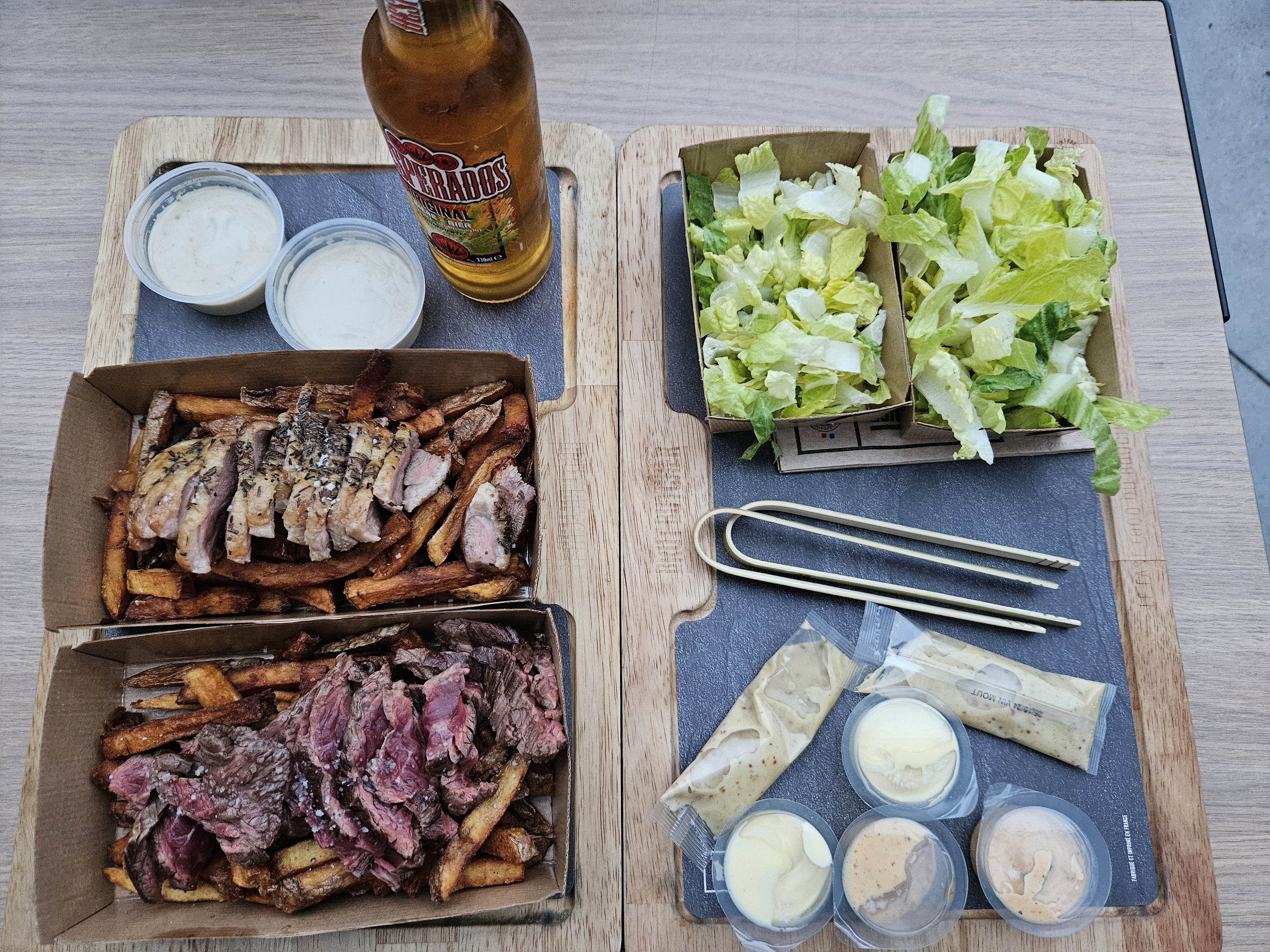Belle et bonne découverte. Un concept sympa. Accueil à l'entrée. Tranché de bœuf excellent: cuisson respectée, gouteux et copieux. Super pour un moment en famille, ou entre amis. Sur place, ou à emporter.
