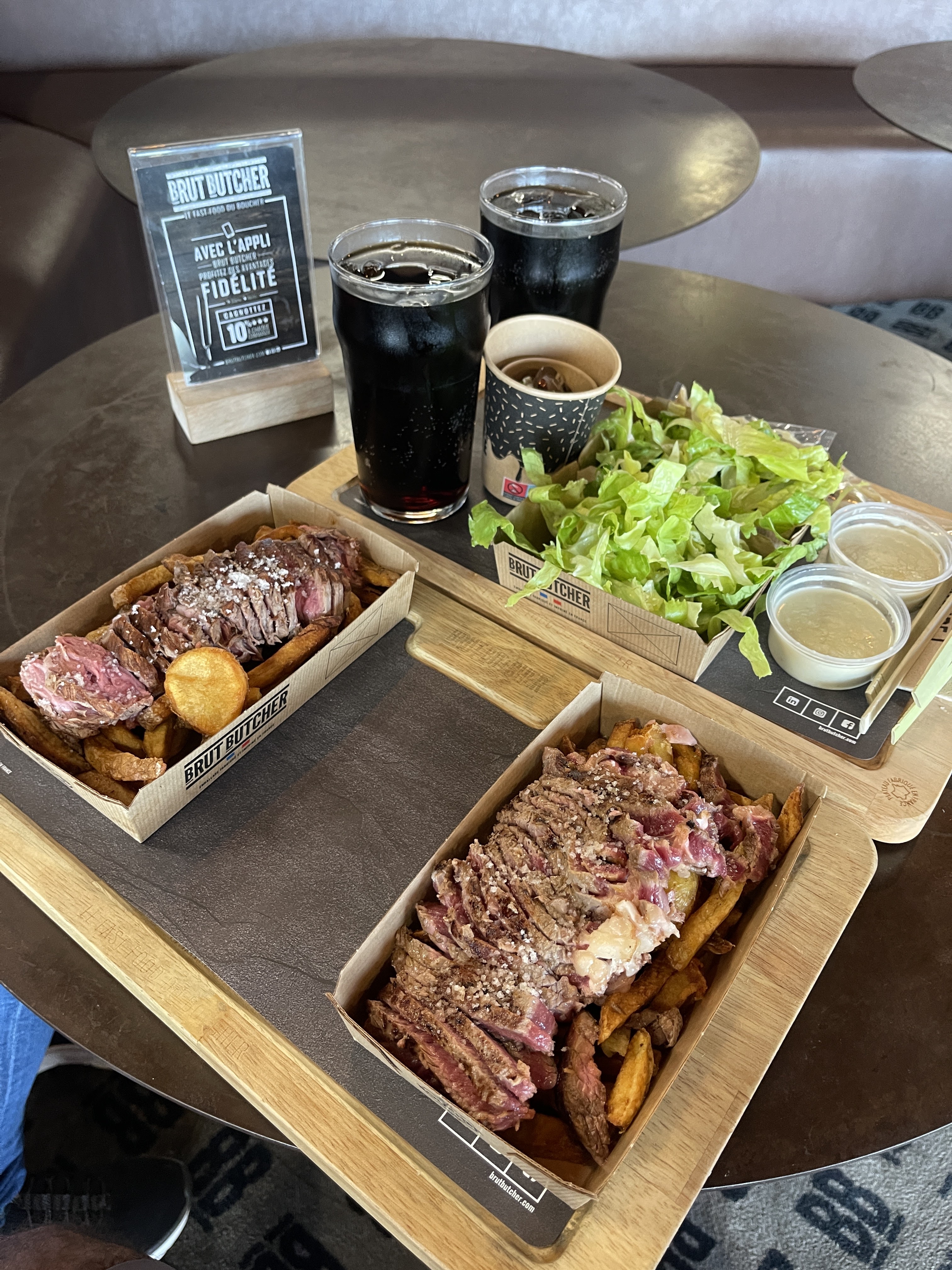 Pas de service, pas d'accueil et très cher pour manger dans du carton avec une pince en bois. La viande tranchée est bonne (faux filet et onglet) , les sauces sont industrielles, la salade de mauvaise qualité, le vin en canette aluminium, pour le service il faut récupérer les plats au bar , pareil pour le café. MAIS LE TARIF ...47€ pour 2 plats, une canette de rosé,une bouteille d'eau,un café, une petite glace. Aucun bonjour, aucun sourire de la part du personnel en salle ou en cuisine. Sans compter la personne qui pulvérise un produit de nettoyage sur la table d'à côté pendant notre repas