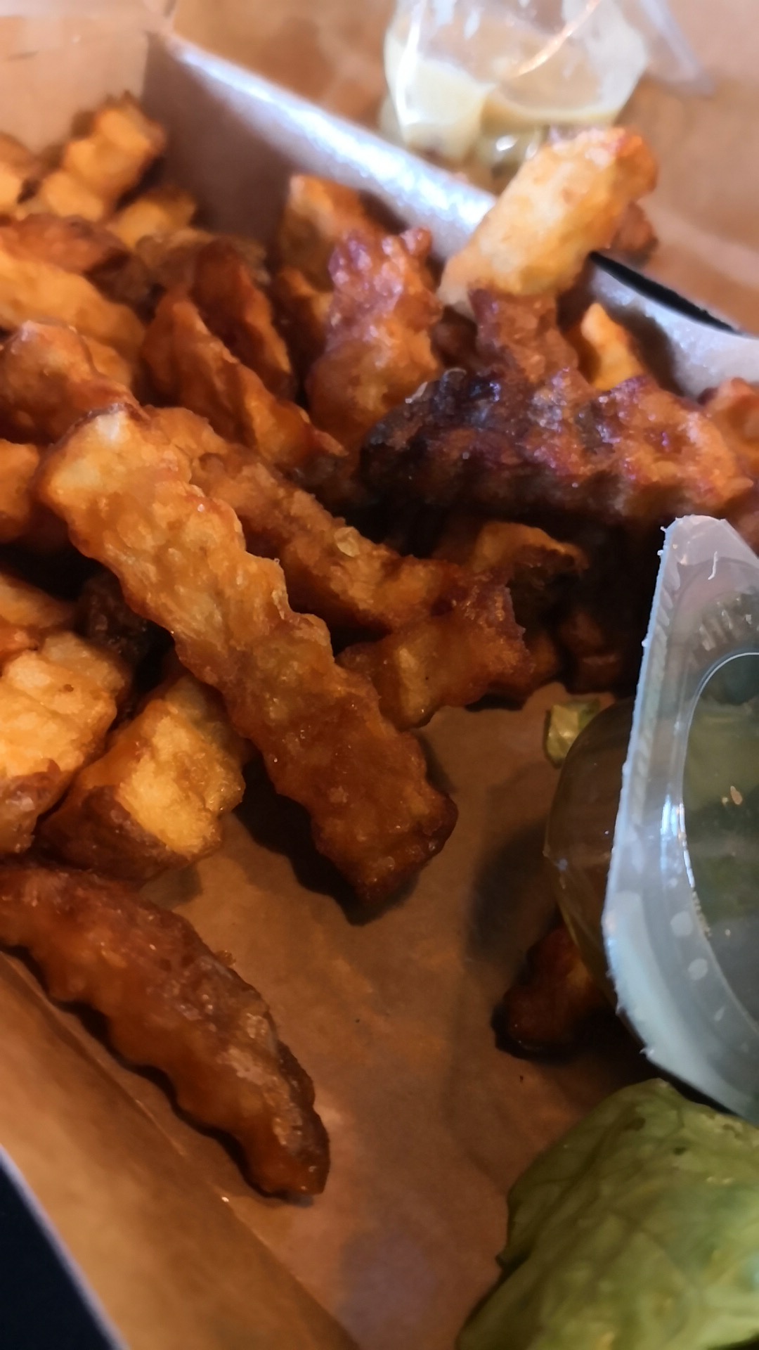 Frites un peu noires et tiéde pour ne pas dire froide comme le burger et pareil pour les 3 autres repas qui étaient avec moi