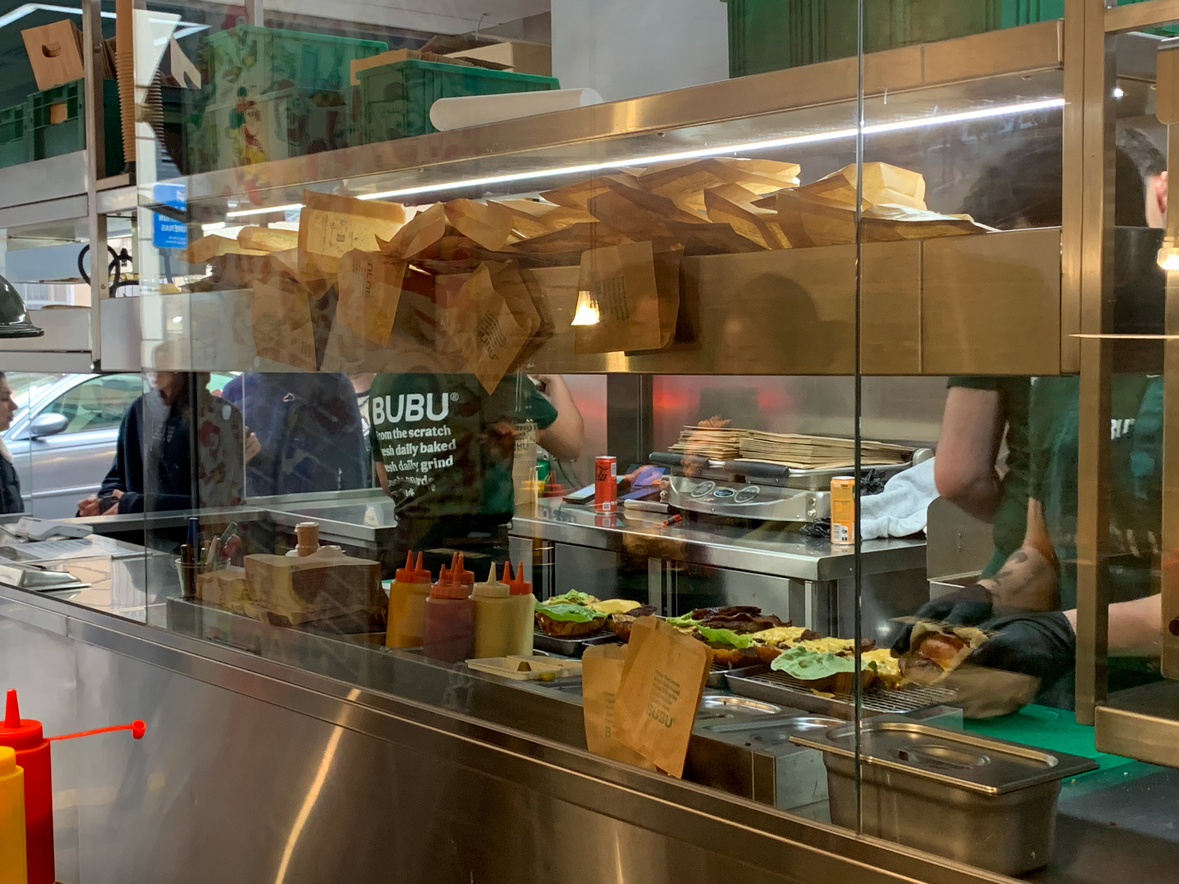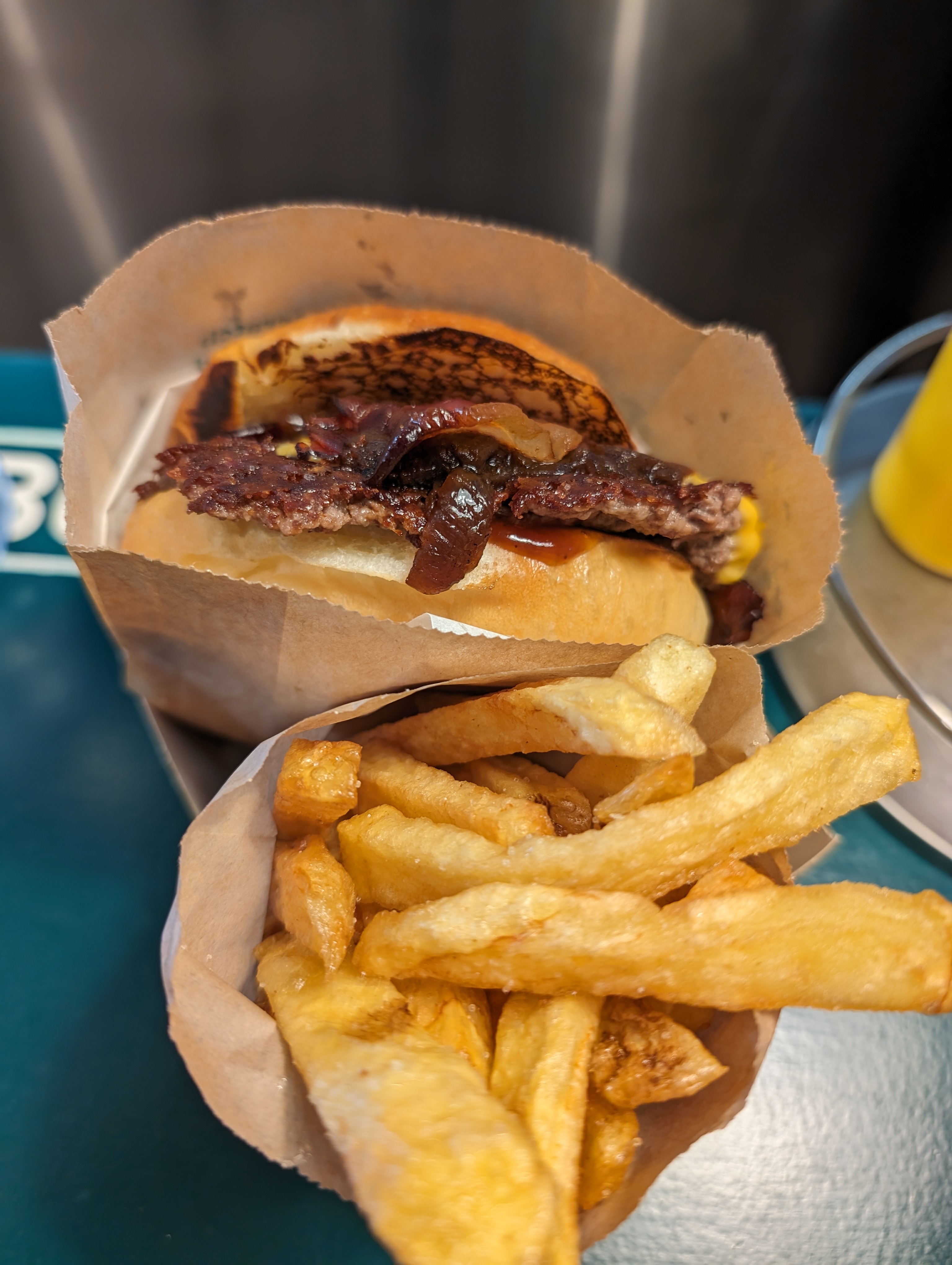 Nous logeons dans le bâtiment juste à côté dans un Airbnb et après une longue journée de visites et d'excellentes critiques, nous avons opté pour un buger à emporter. Le hamburger lui-même était savoureux mais c'était très compliqué à manger. C'était préparé sur commande et frais et le pain brioché était super. Les frites étaient cependant à peine tièdes et n'avaient visiblement pas été préparées à la commande. Ils avaient commencé à devenir durs à cause de la graisse qui se solidifiait et n'étaient pas géniaux du tout.