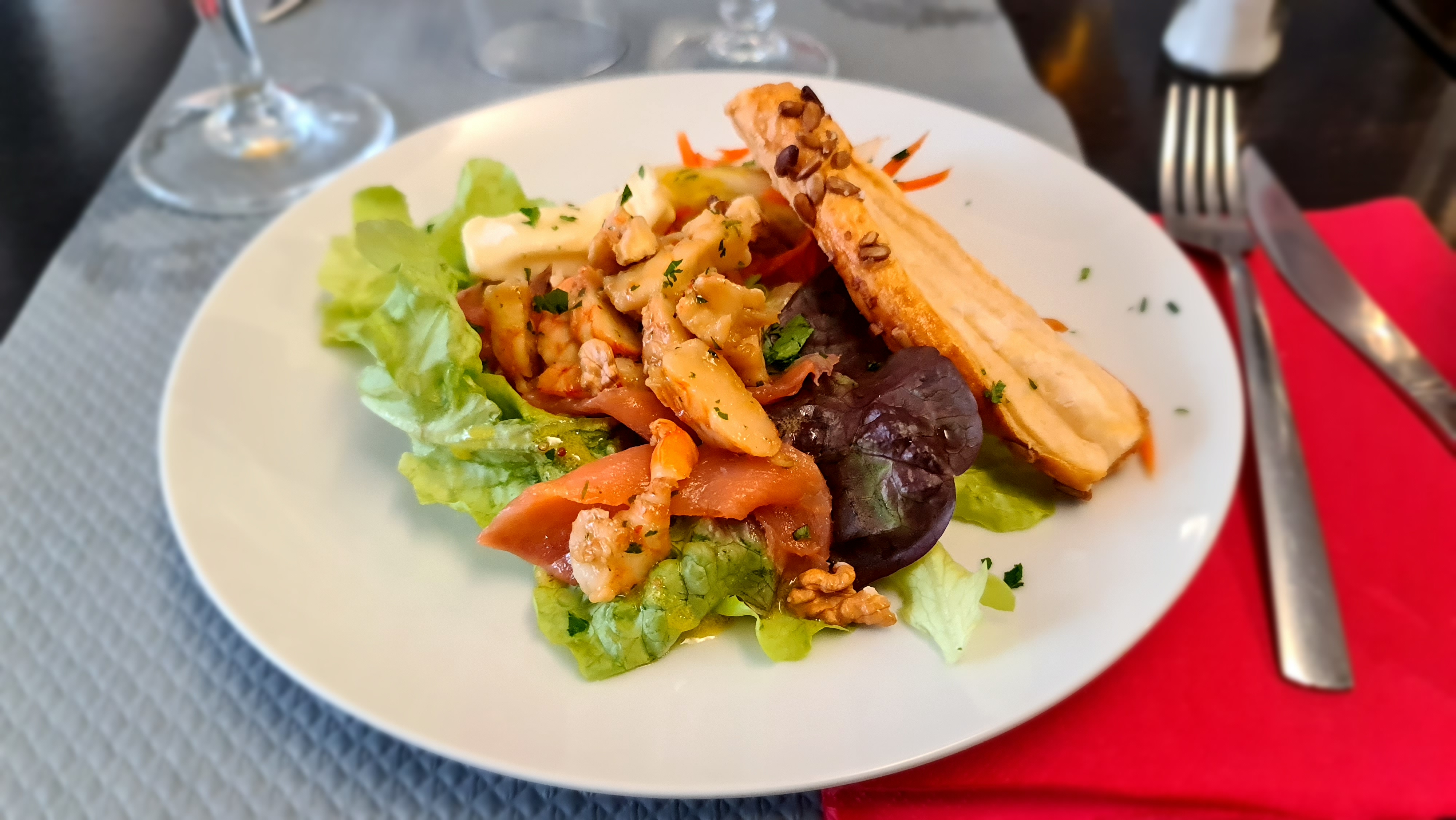 Excellent rapport qualité/prix. Service très très attentionné et agréable. La salade de crevettes, saumon et fromage de chèvre est parfaite. Très bonnes nouilles au saumon. Le calamar farci exquis. Le cheesecake spectaculaire. Hautement recommandé. Animaux acceptés. Je reviendrai.
