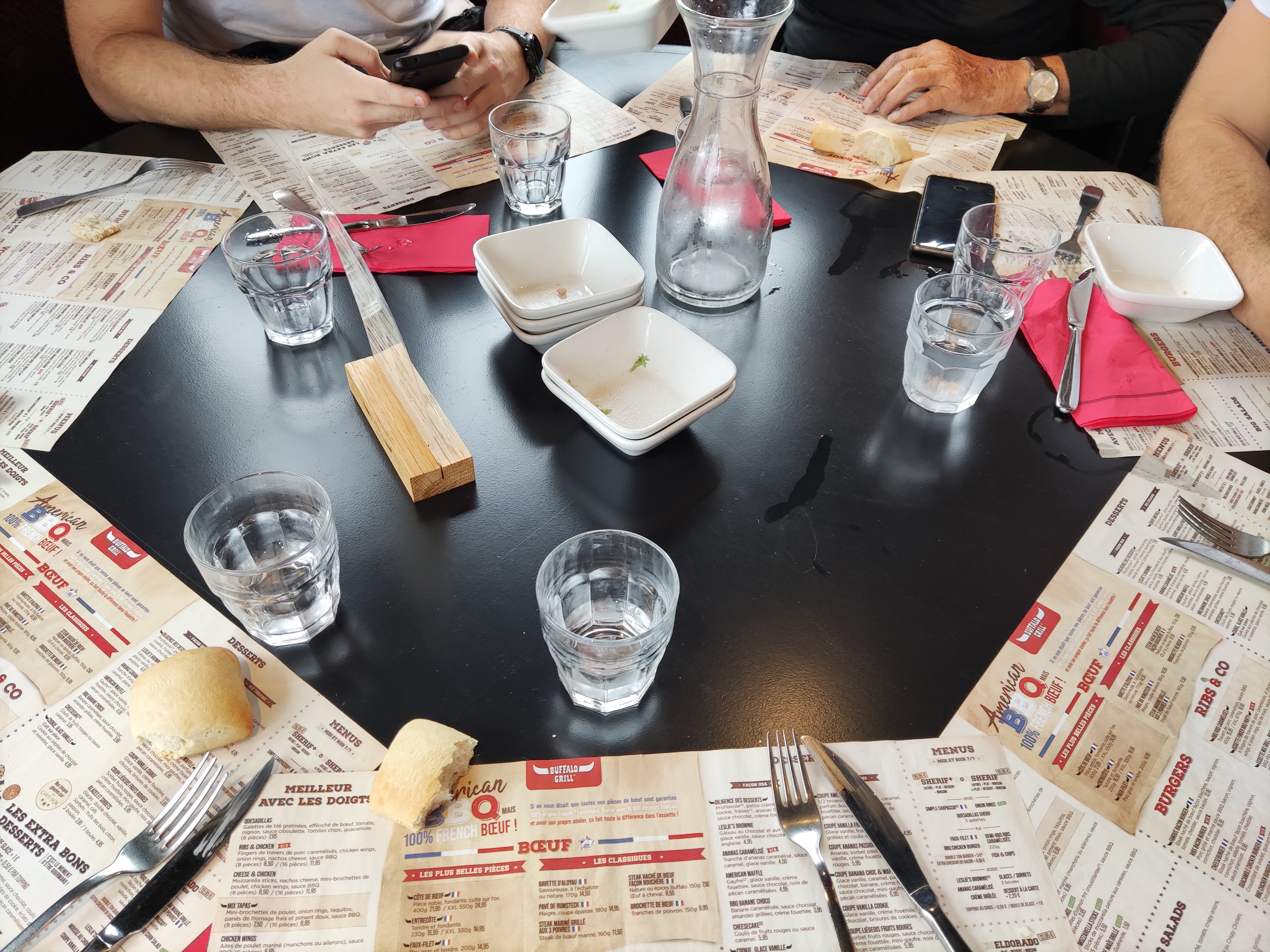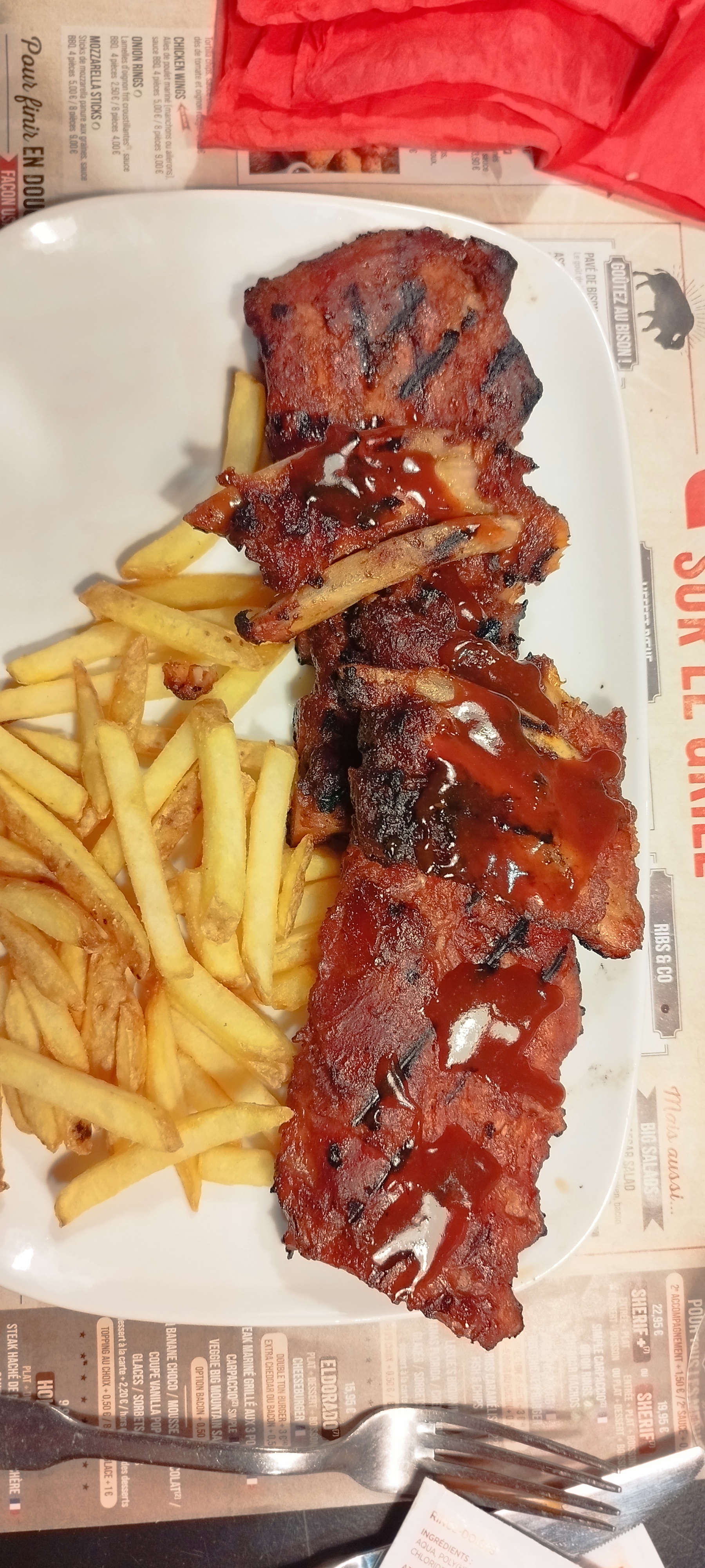 Soirée ribs à volonté : une régalade 😉 Service top avec Patrick, en formation, qui gère parfaitement même s'il se promène sans le savoir avoir des étiquettes alimentaires collées dans le dos : trop drôle ! Bravo l'équipe 👍