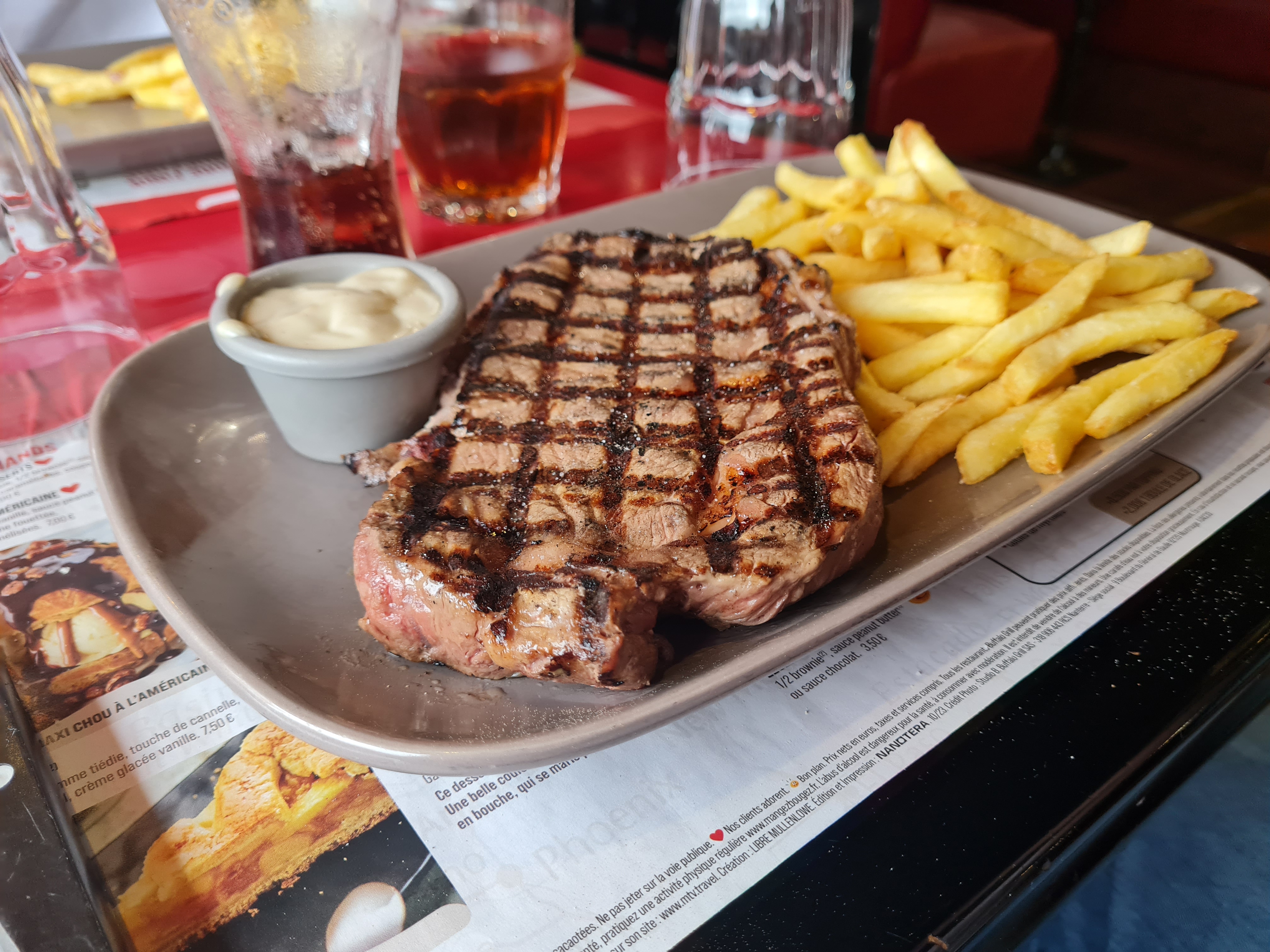 Service à revoir. La serveuse nous a jeté les couverts et les verres sur la table sans les mettre en place... commande apéritif arrive en même temps que les plats. ‘Nous demandons un steak haché à cheval à point, on nous sert un steak haché saignant de chez saignant sans l’oeuf qui doit normalement aller dessus. Nous demandons à la serveuse de nous servir cet oeuf, la réponse fut négative car il n’y a plus d’œuf... il aurait été sympathique de nous le préciser à la commande. Aucun geste commercial en contre partie... Le restaurant est vieillissant et l’hygiène n’est pas vraiment au rdv! (Banquette et moquette franchement sales)!