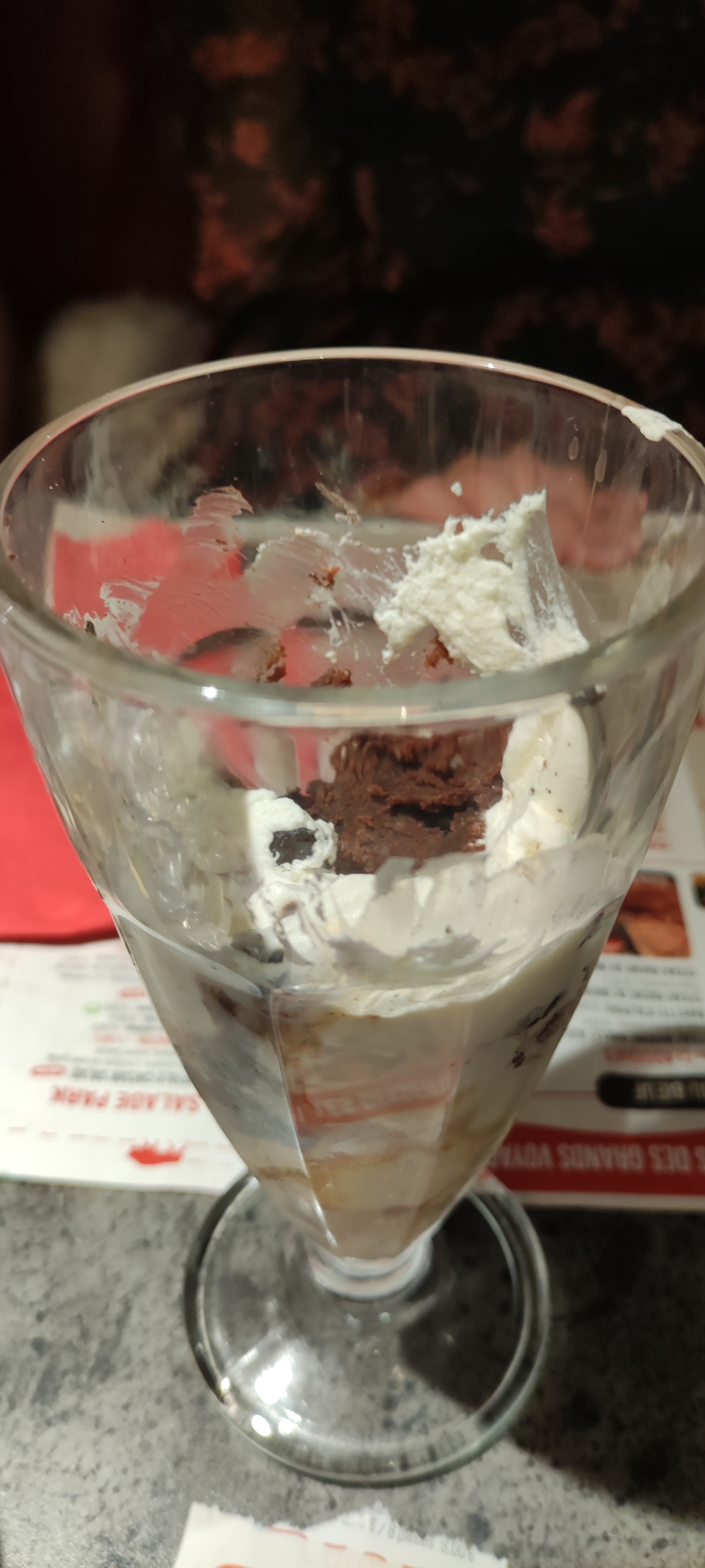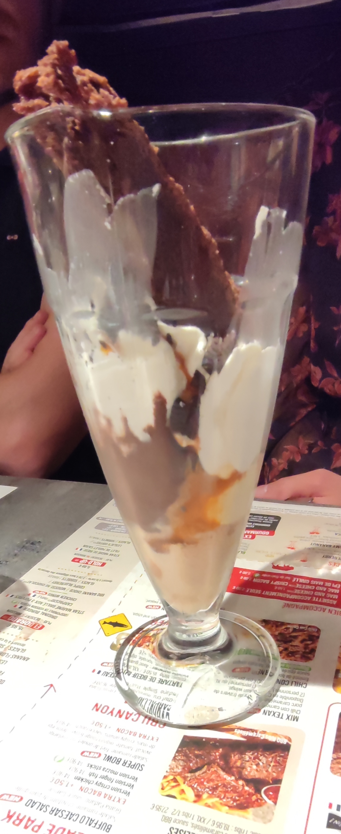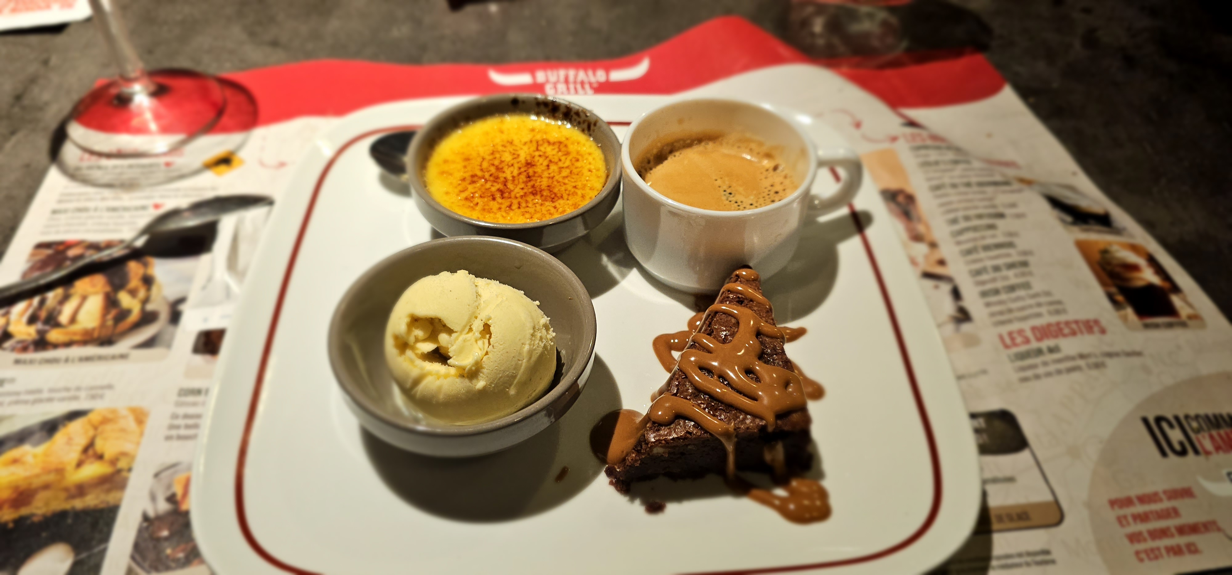 Le service était impeccable, le serveur Romane était vraiment à l'écoute et très serviable. Au niveau repas, moyen haricots farineux. Où sont passés les anciens haricots verts bien craquants, on se demande. La faute au covid ? A l'Ukraine ? Très déçus de la coupe America, qui n'a absolument rien à voir avec la description et photo sur prospectus. Des espèces de demies boules de glace, entassées dans une coupe haute complètement inadaptée, sans coulis, sans éclats de noix de pécan, elles ont dû être oubliées en chemin. On a dû également chercher où était le coulis de caramel . Et surtout on s'est demandé s'ils n'étaient pas aux abonnés absents. Dommage ça a un peu plombé la fin du repas. La prochaine fois, on fera sans doute l'impasse sur les desserts, car à 7€ le dessert, on espérait vraiment autre chose. Je vous mets la photo de présentation du dessert et deux photos des coupes servies. Vous jugerez par vous même. Un bon conseil, prenez un autre dessert ou faites l'impasse 😉