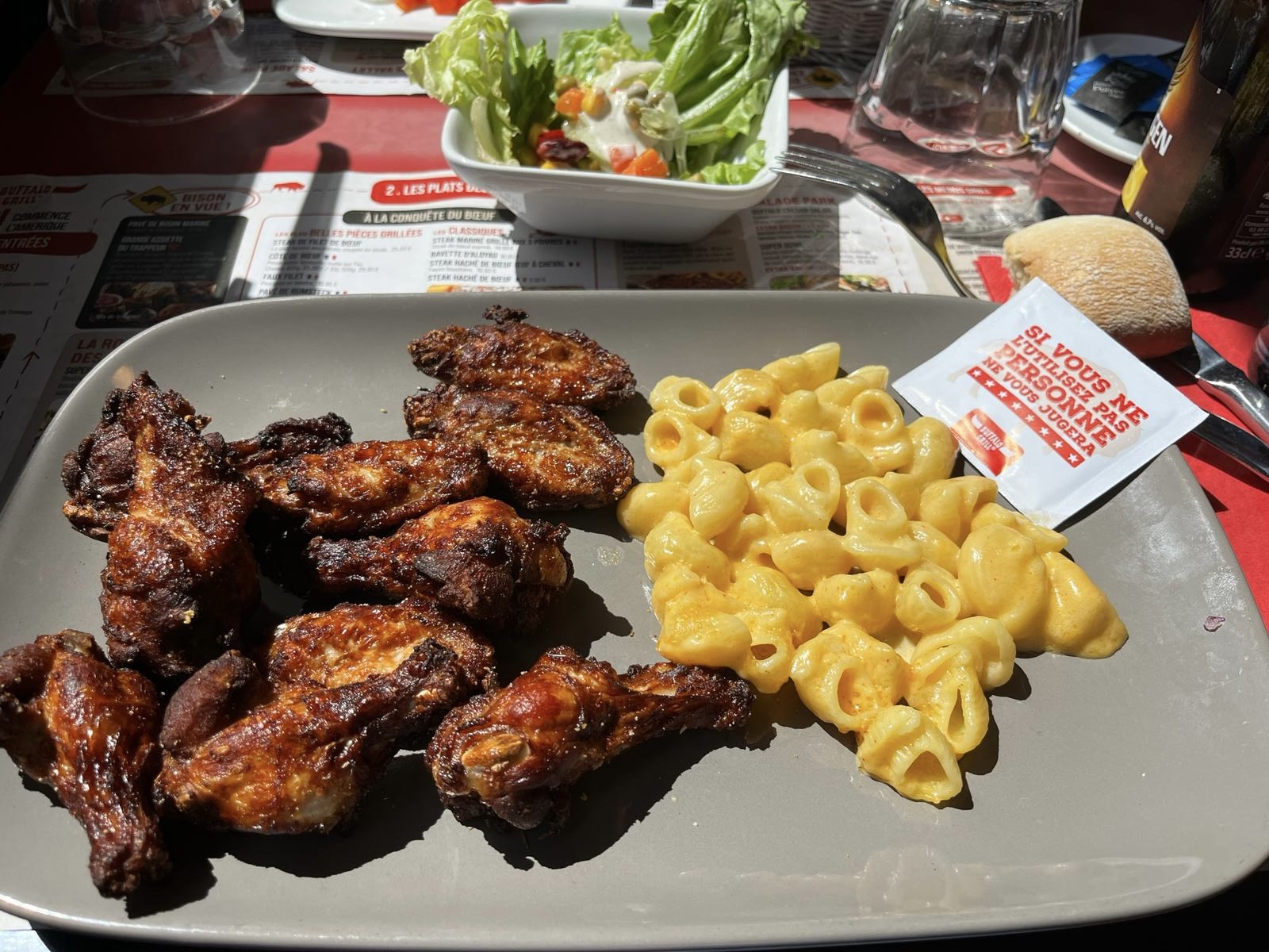 Déçu.arrivé à 12h45.pas de place pour se garer.commande prise rapidement.mais attente trés longue.il a fallu réclamer la salade de bienvenue.on nous les apporte,mais quatre pour cinq personnes.pareil pour le pain.quatre morceaux pour cinq personnes.les enfants ont eu leur plat, mais les adultes ont attendu assez longtemps. Pour le reste, conforme à Buffalo Grill.