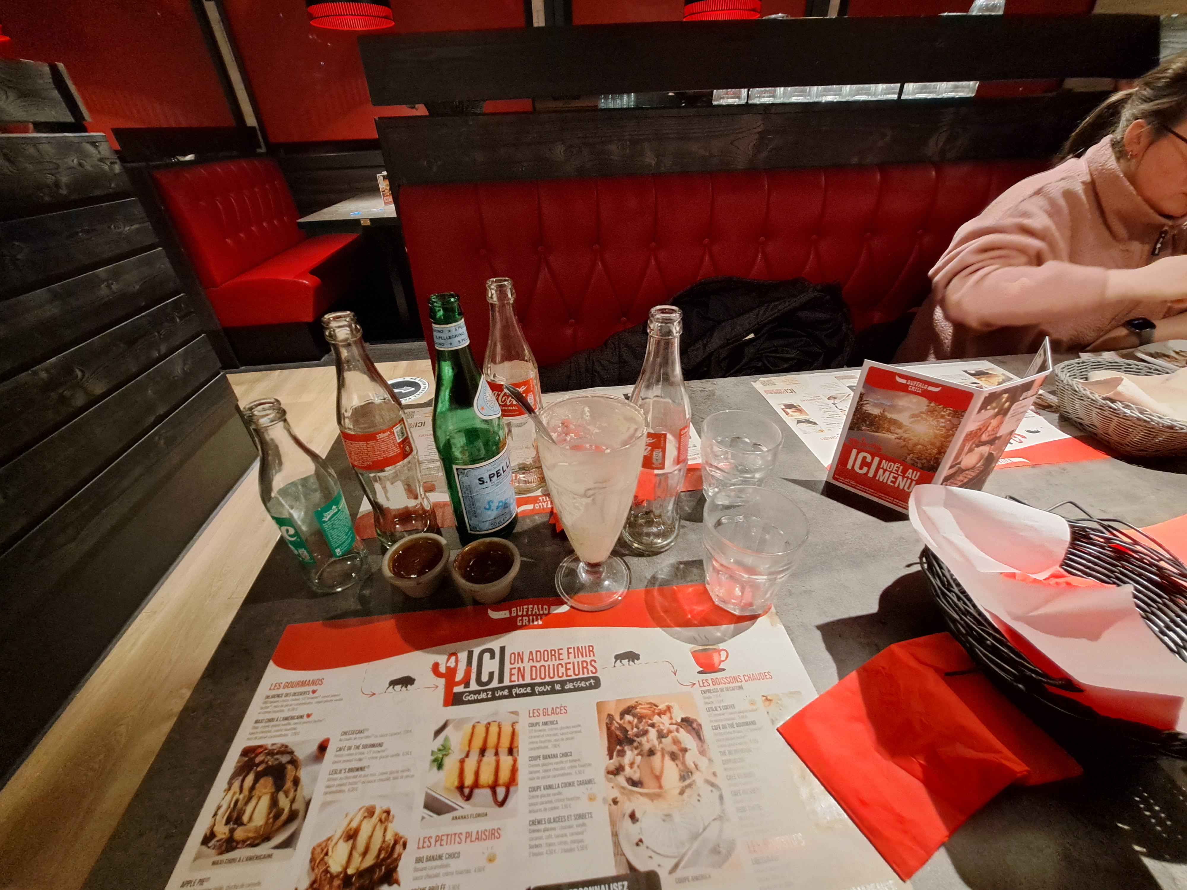 Cela faisait des années que je n'avais pas mangé dans un restaurant de l'enseigne Buffalo Grill. Nous avons attendu une bonne dizaine de minutes pour avoir une table, samedi soir oblige. Je n'ai pas retrouvé l'ambiance de mon enfance mais il y régnait une bonne atmosphère malgré l'effervescence. J'ai personnellement pris un chili con carne et une coupe America en dessert (rupture de bananes donc pas de dessert avec ce fruit malheureusement). La présentation des plats de notre table étaient très sommaire et le plat ne m'a pas transporté mais le dessert était très copieux et très bon. L'attente pour le plat fut un peu longue mais là encore je pense que le samedi soir n'aide pas.