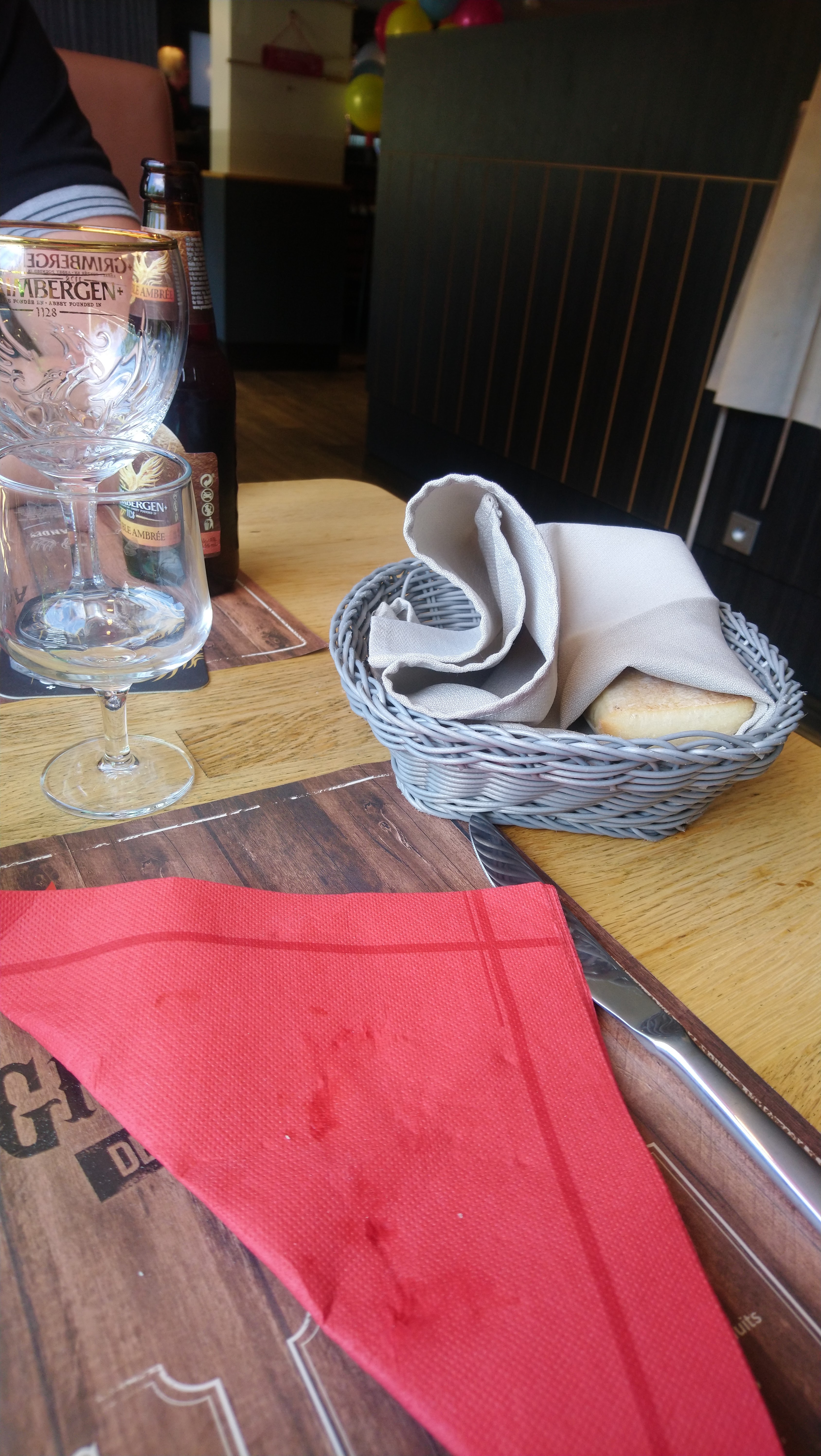 A notre arrivée pas de petite salade d'accueil. Serveurveuse pas très souriante au début. J'ai pour ma part commandé un faux filet. Il est resté dans mon assiette soit le couteau ne coupé pas mais je pense que la viande était trop cuite pour un saignant et dure. Dommage s'est la première fois.