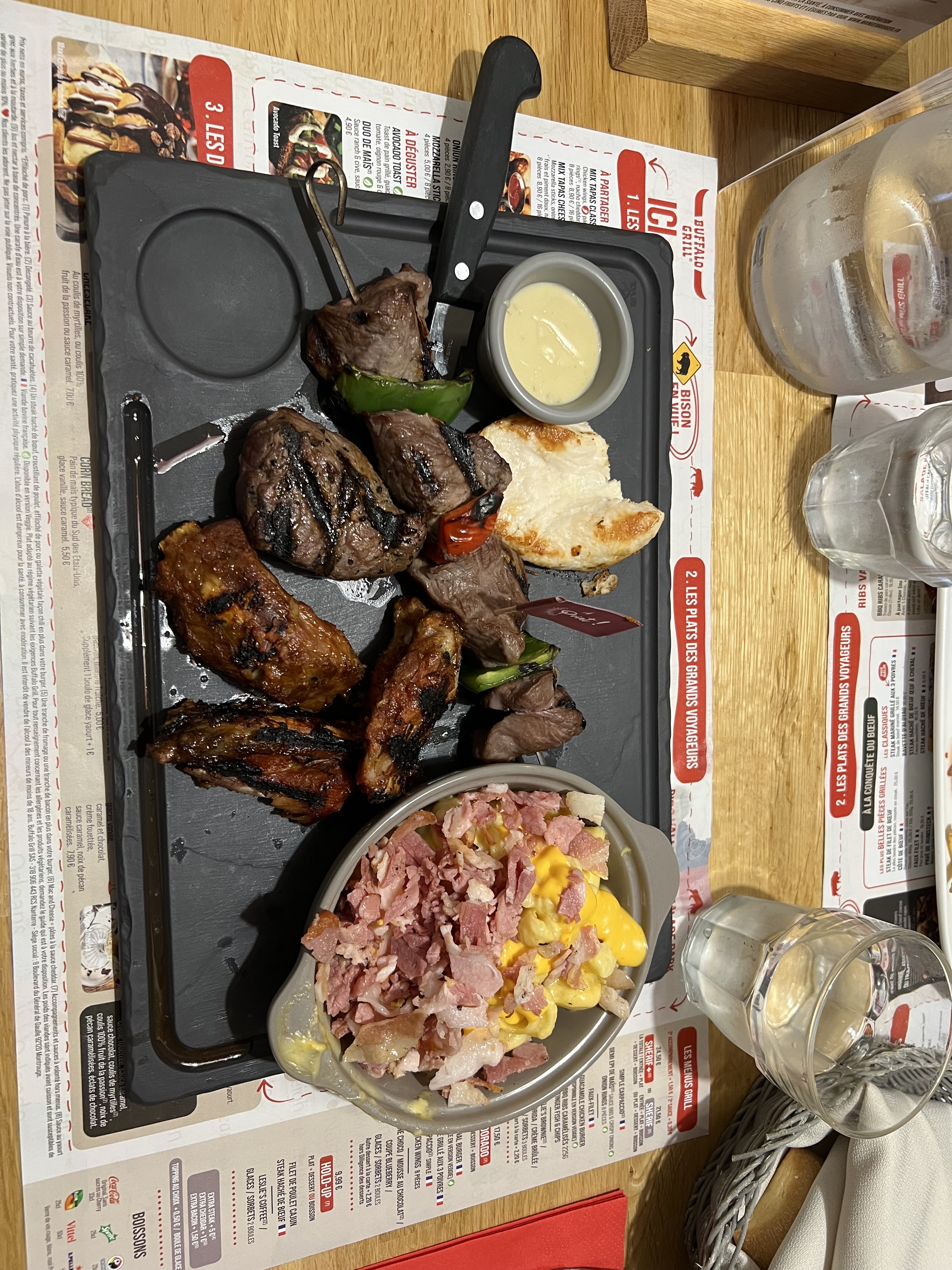 Une expérience gustative et conviviale au top Me voilà de retour chez Buffalo Grill, ma cantine préférée pour les amateurs de viande et d'ambiance conviviale ! Dès l'entrée, j'ai été charmé par le décor chaleureux aux accents de Far West, qui donne tout de suite le ton pour un repas savoureux et détendu. L'accueil était impeccable, avec un serveur souriant et attentionné qui a pris le temps de nous expliquer la carte en détail. Nous avons opté pour l'entrecôte XXL assiete du trappeur et faux filet. Des plats copieux Le temps d'attente était minime, et quelle joie de découvrir nos assiettes ! L'entrecôte était tendre et parfaitement cuite à point, accompagnée de ça sauce .
